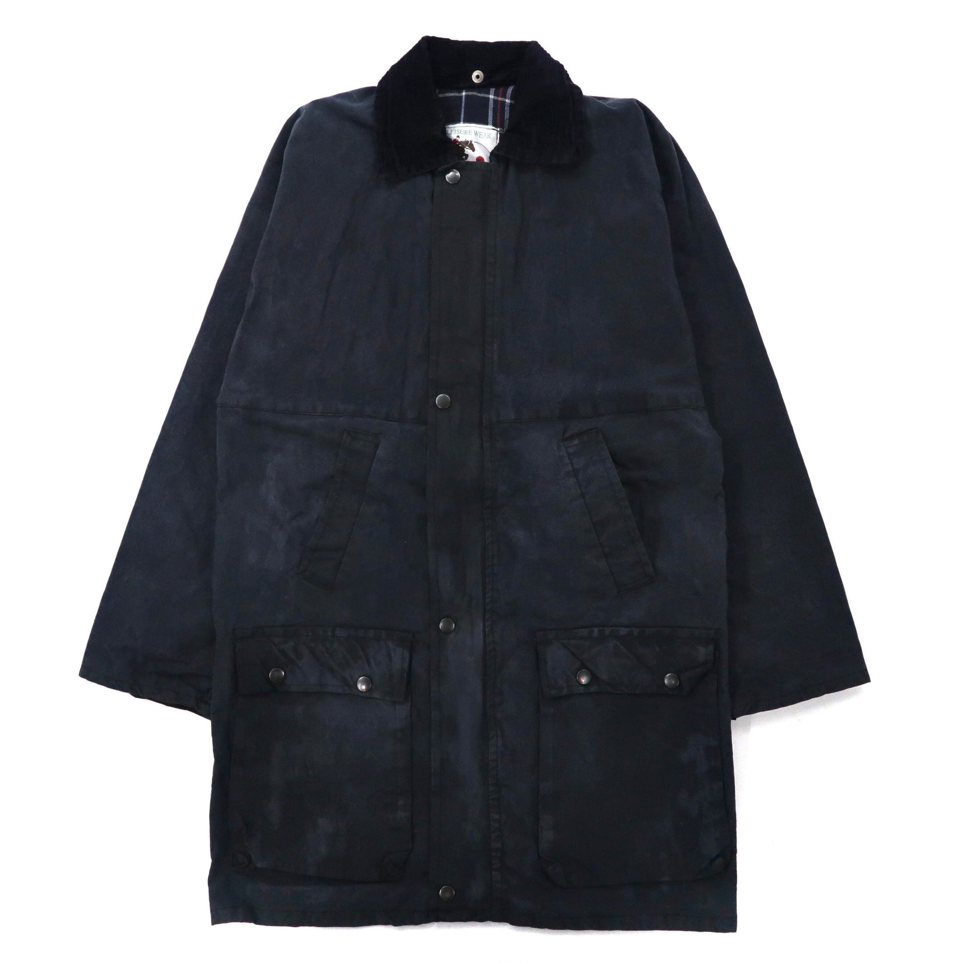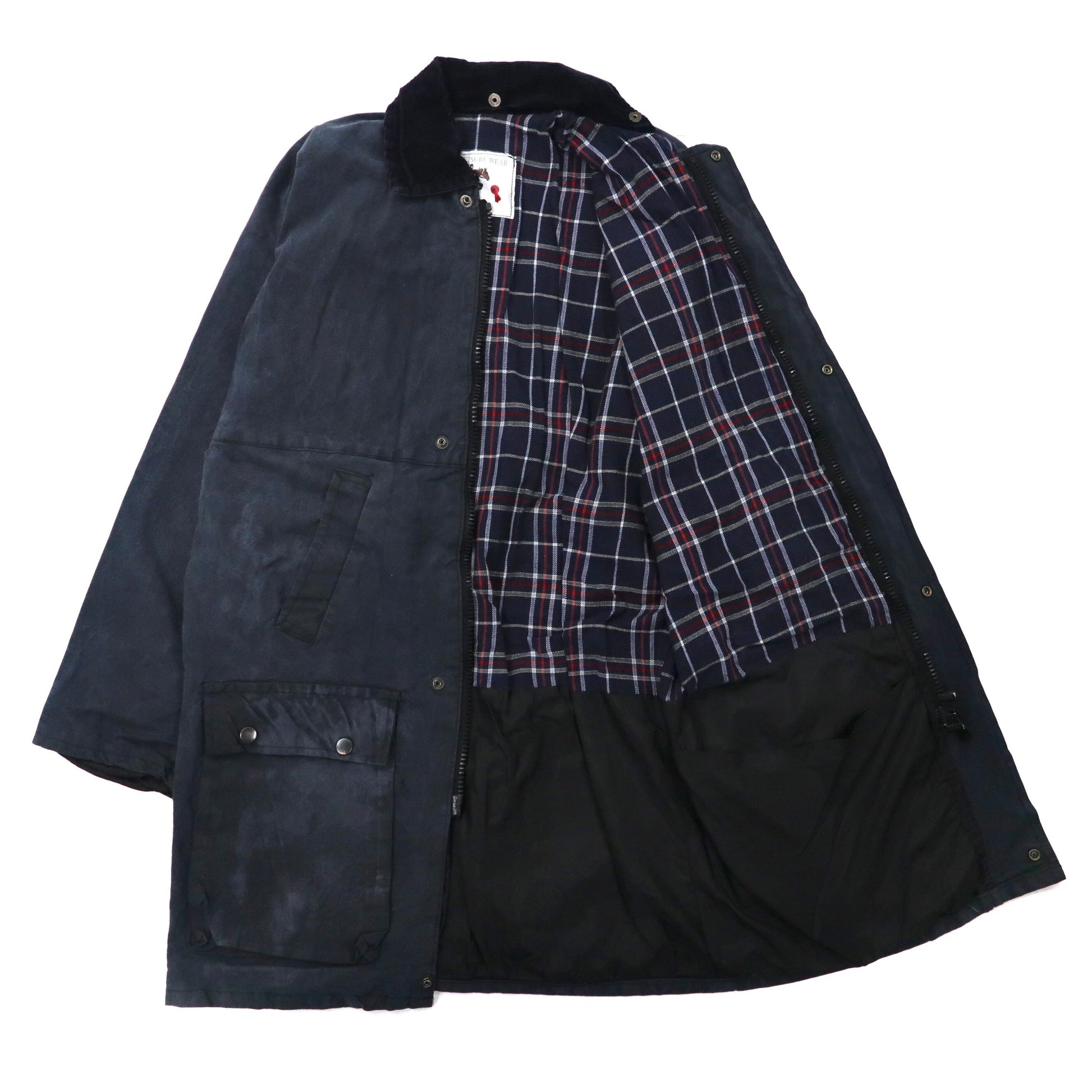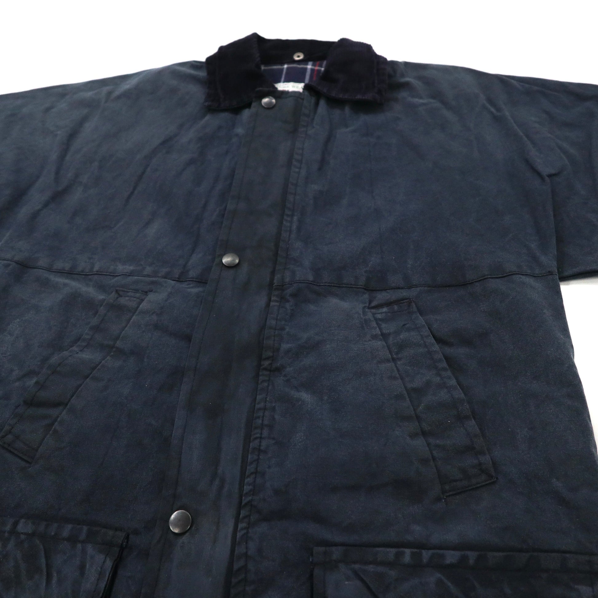 イングランド製 COUNTRY LEISURE WEAR オイルドジャケット S ネイビー コットン 裏地チェック 襟コーデュロイ