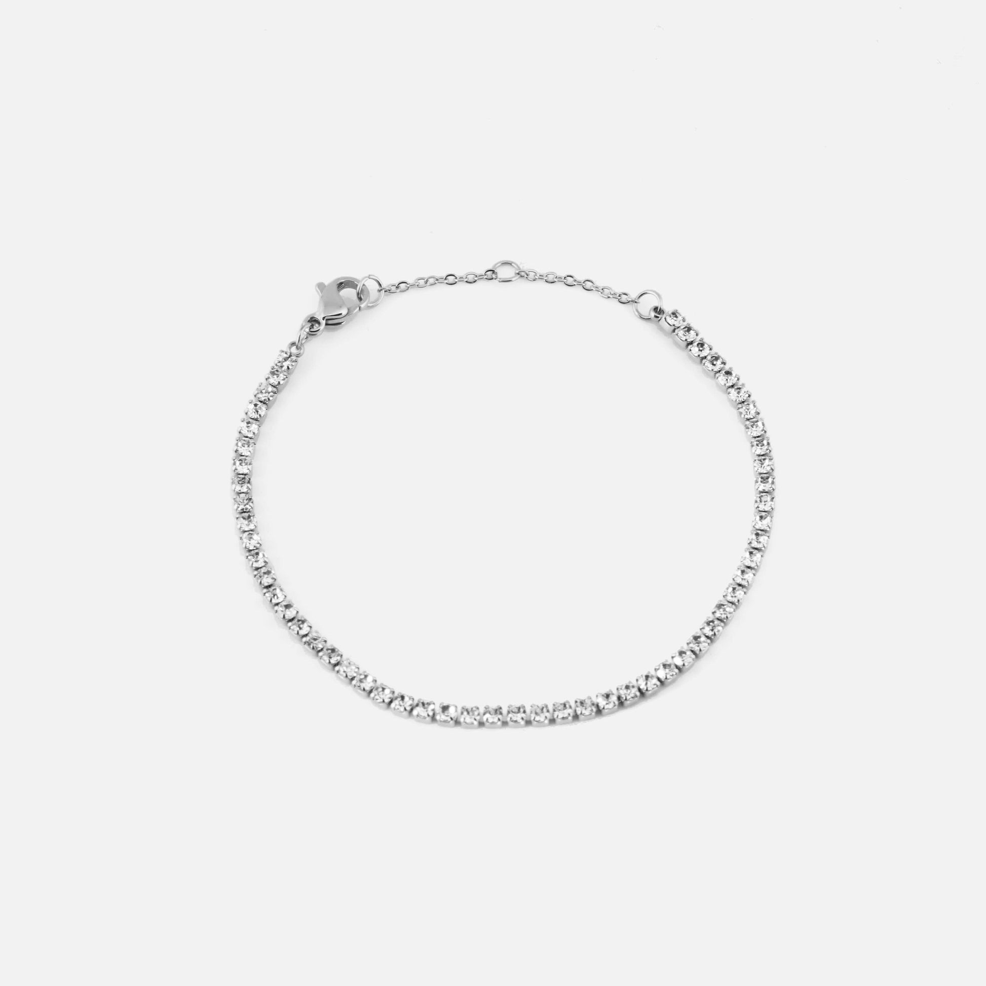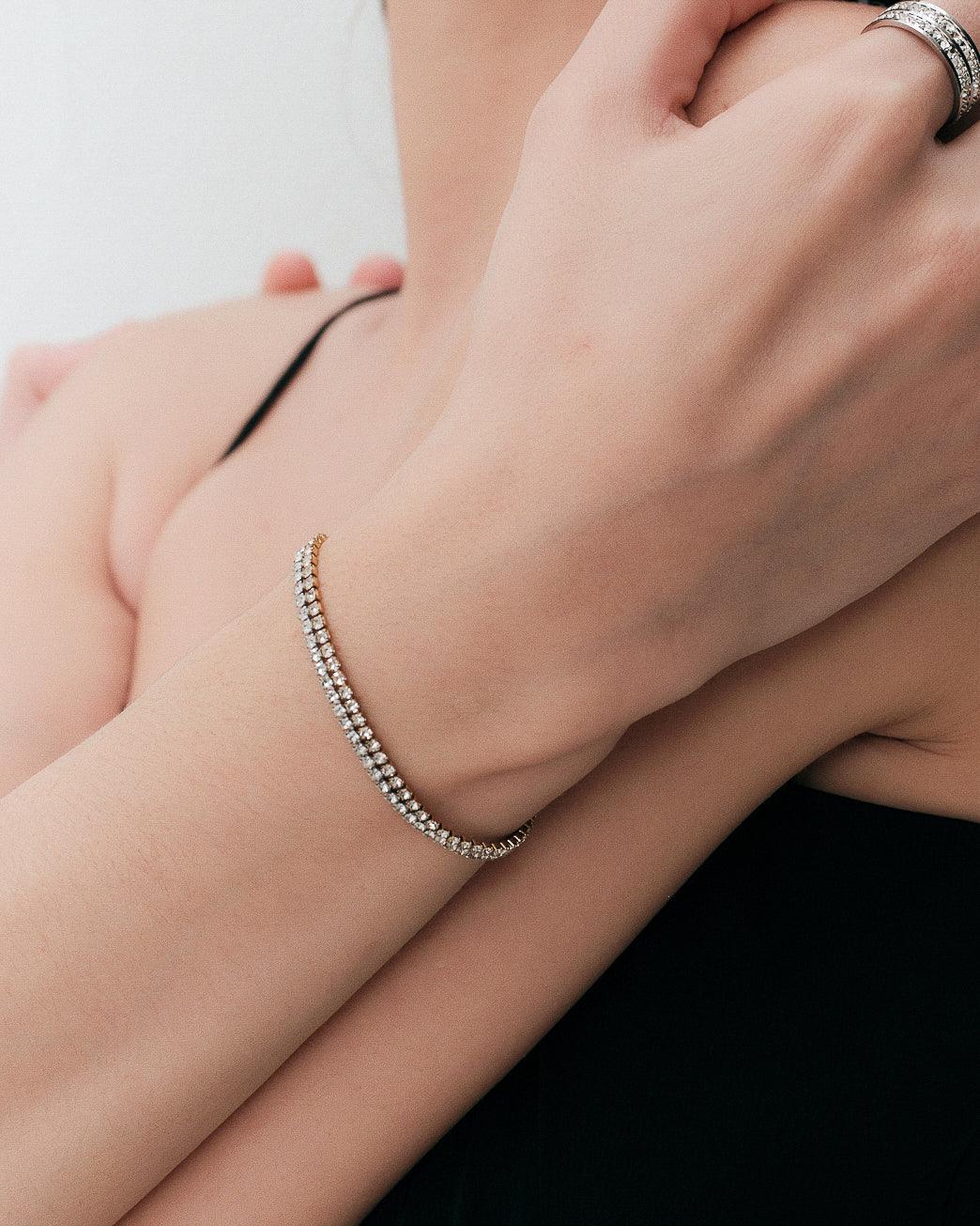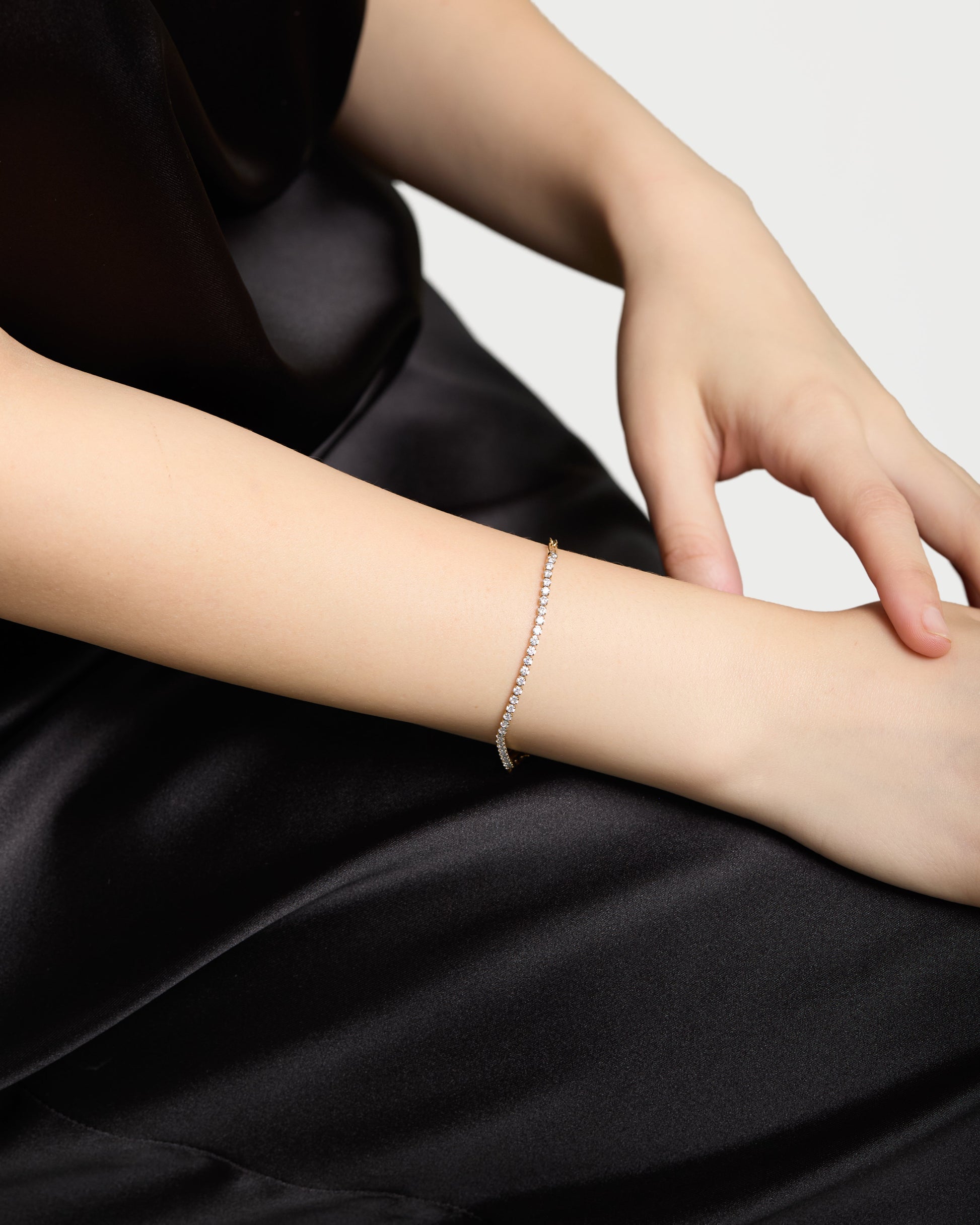 一粒ずつ丁寧に配置されたジルコニアが、繊細に輝きを放つテニスブレスレット。
