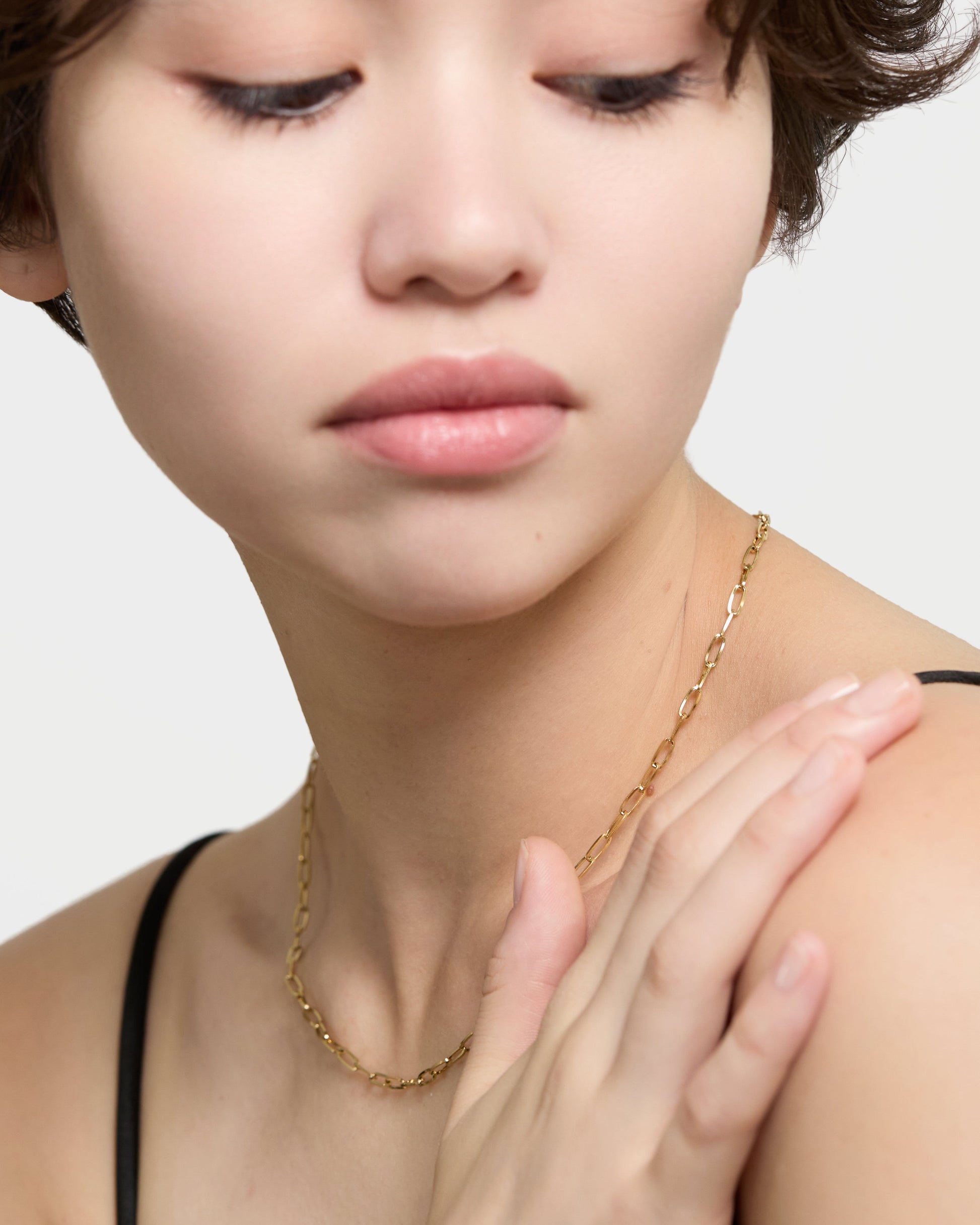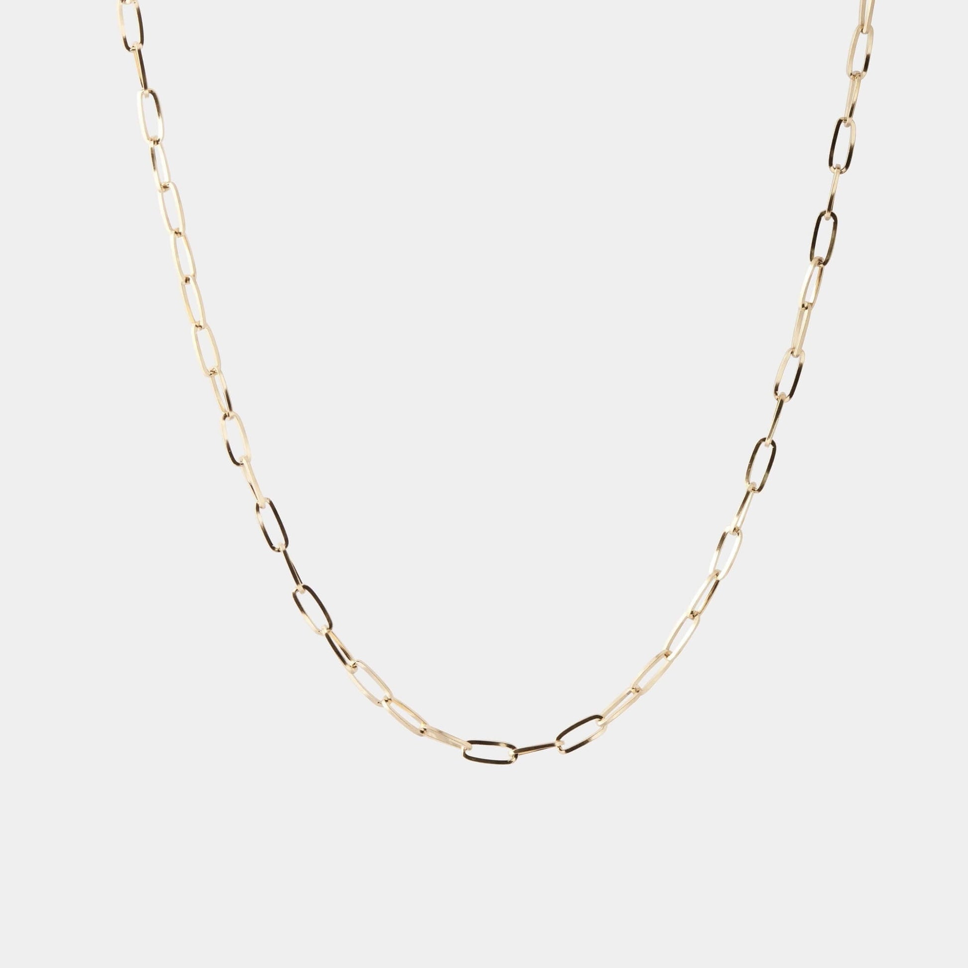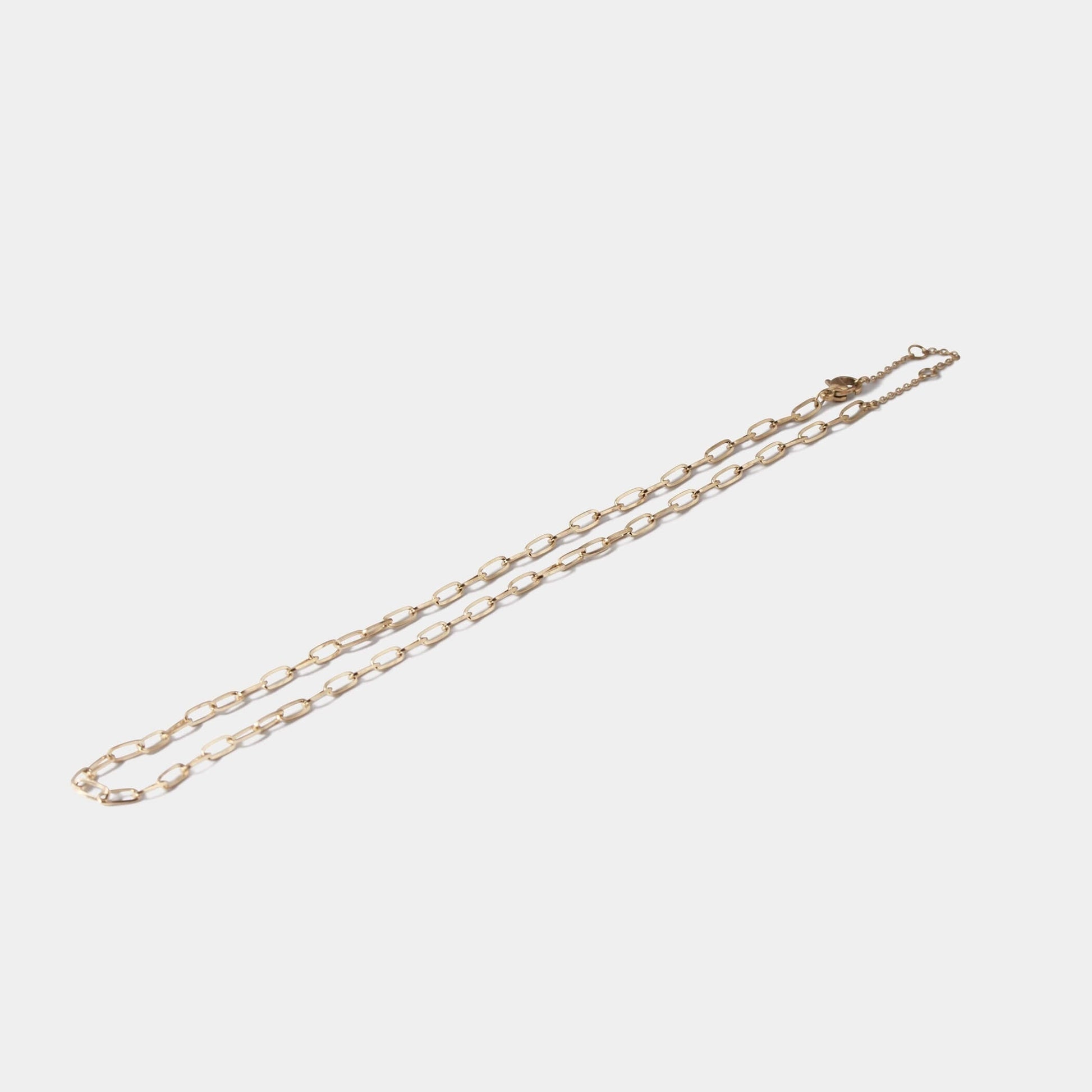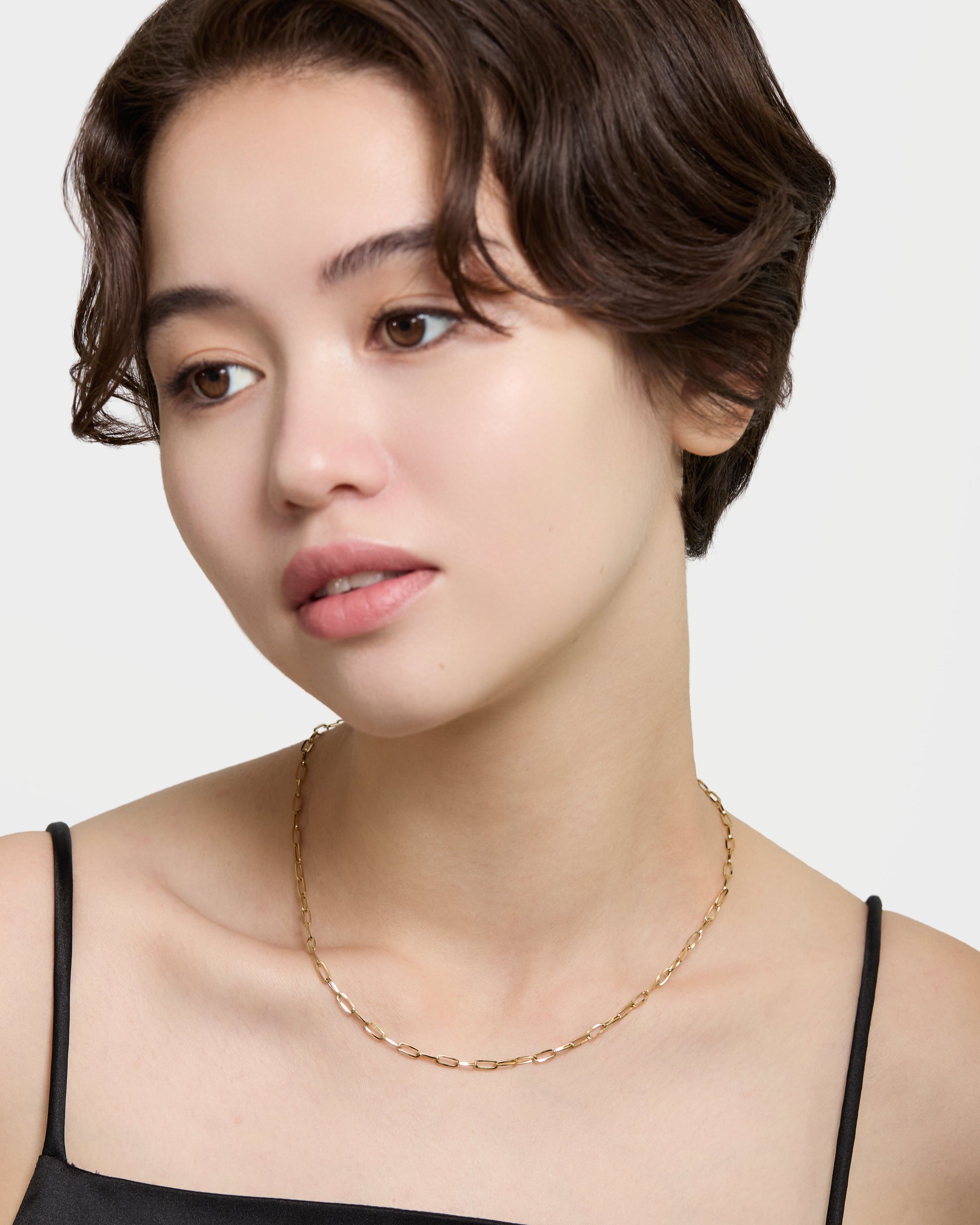 定番のペーパーチェーンを、華奢で繊細な印象に仕上げたモデルで、どんなスタイルにもなじみやすく、1本持っておくと頼れるアイテムです。