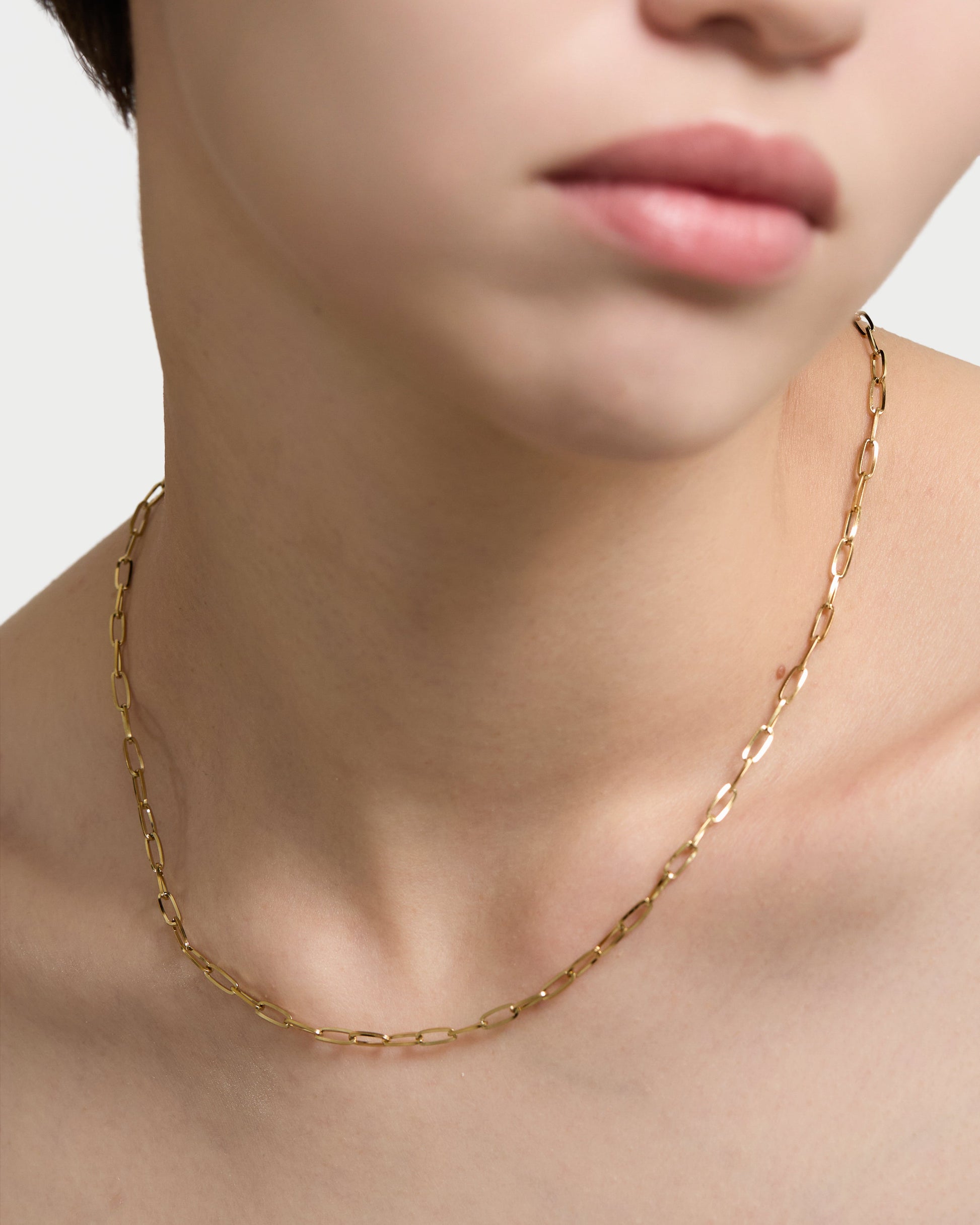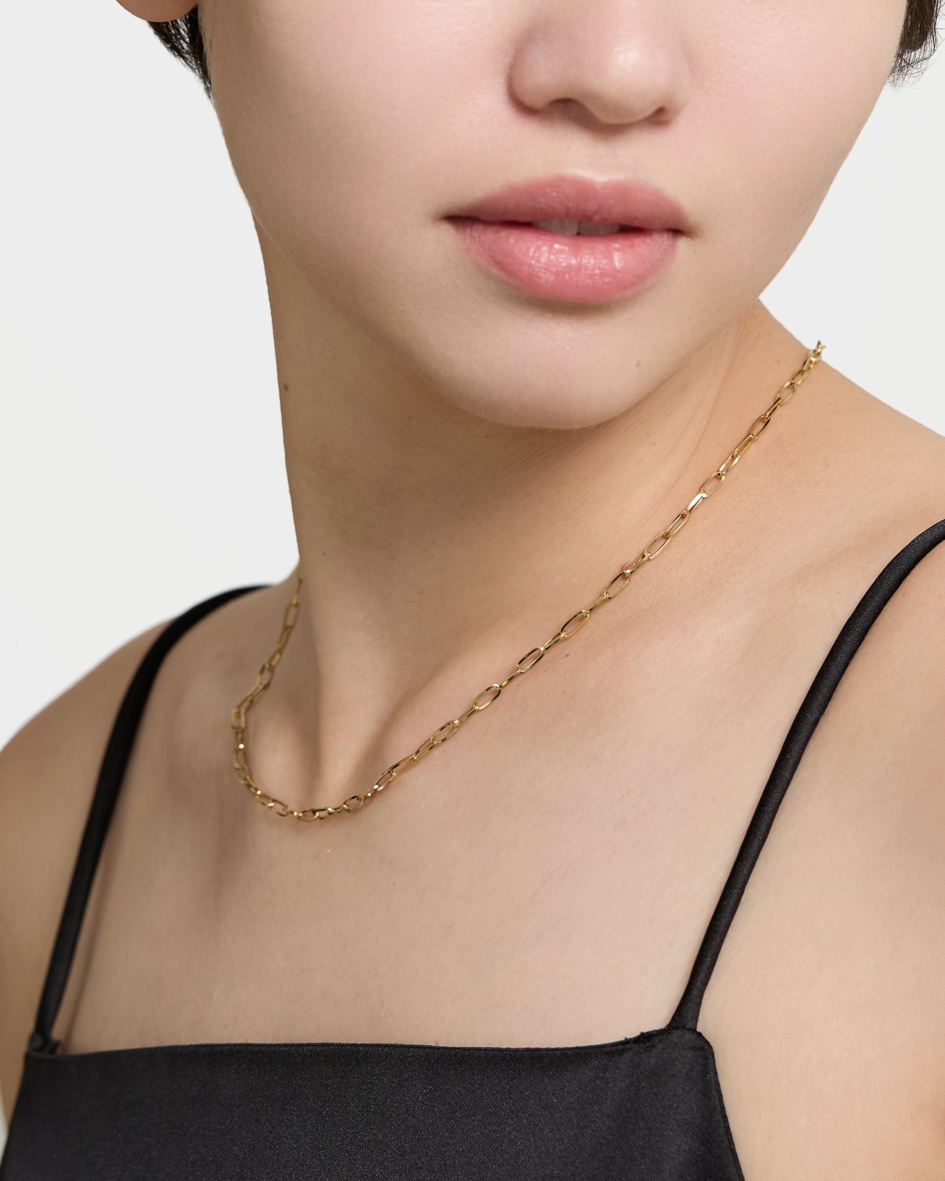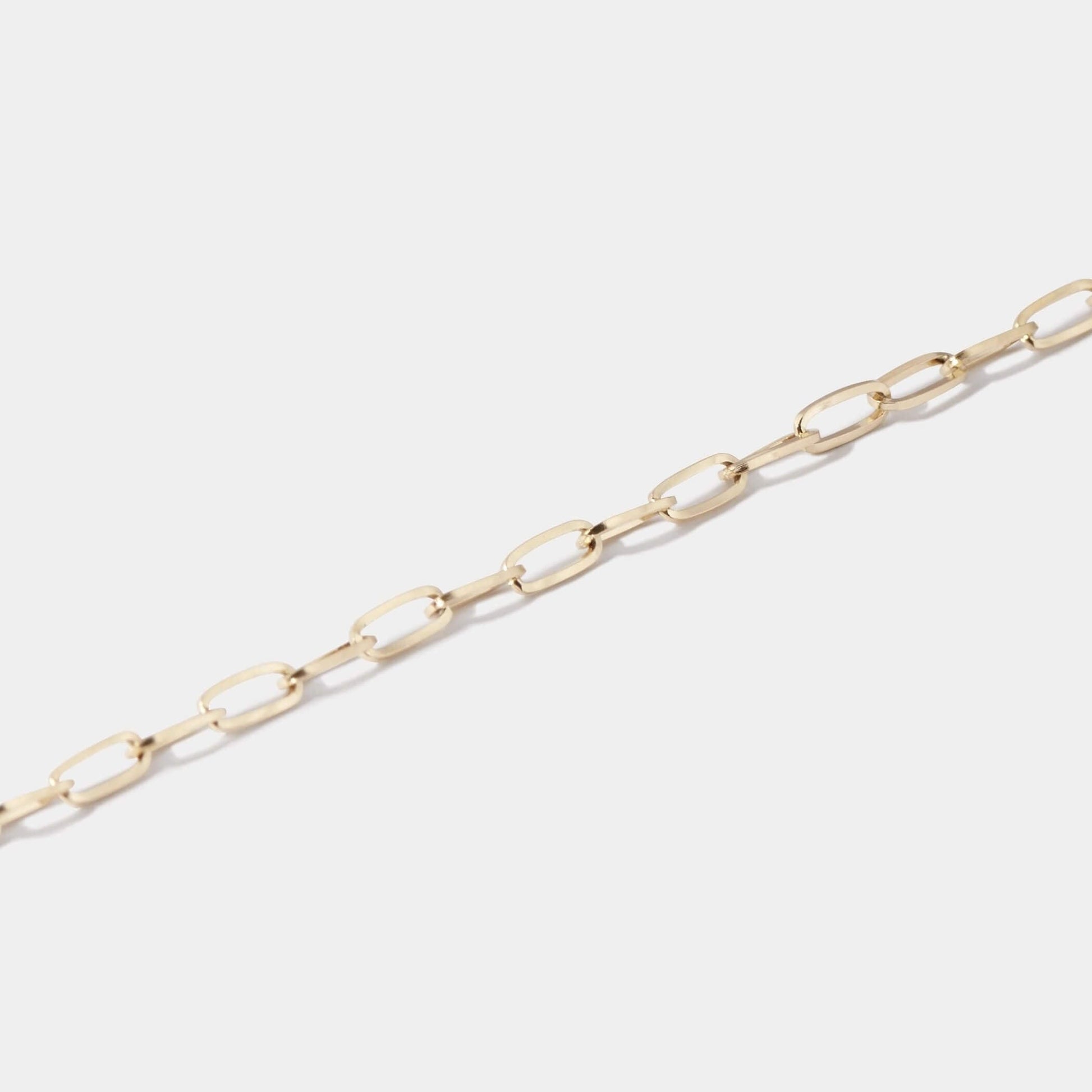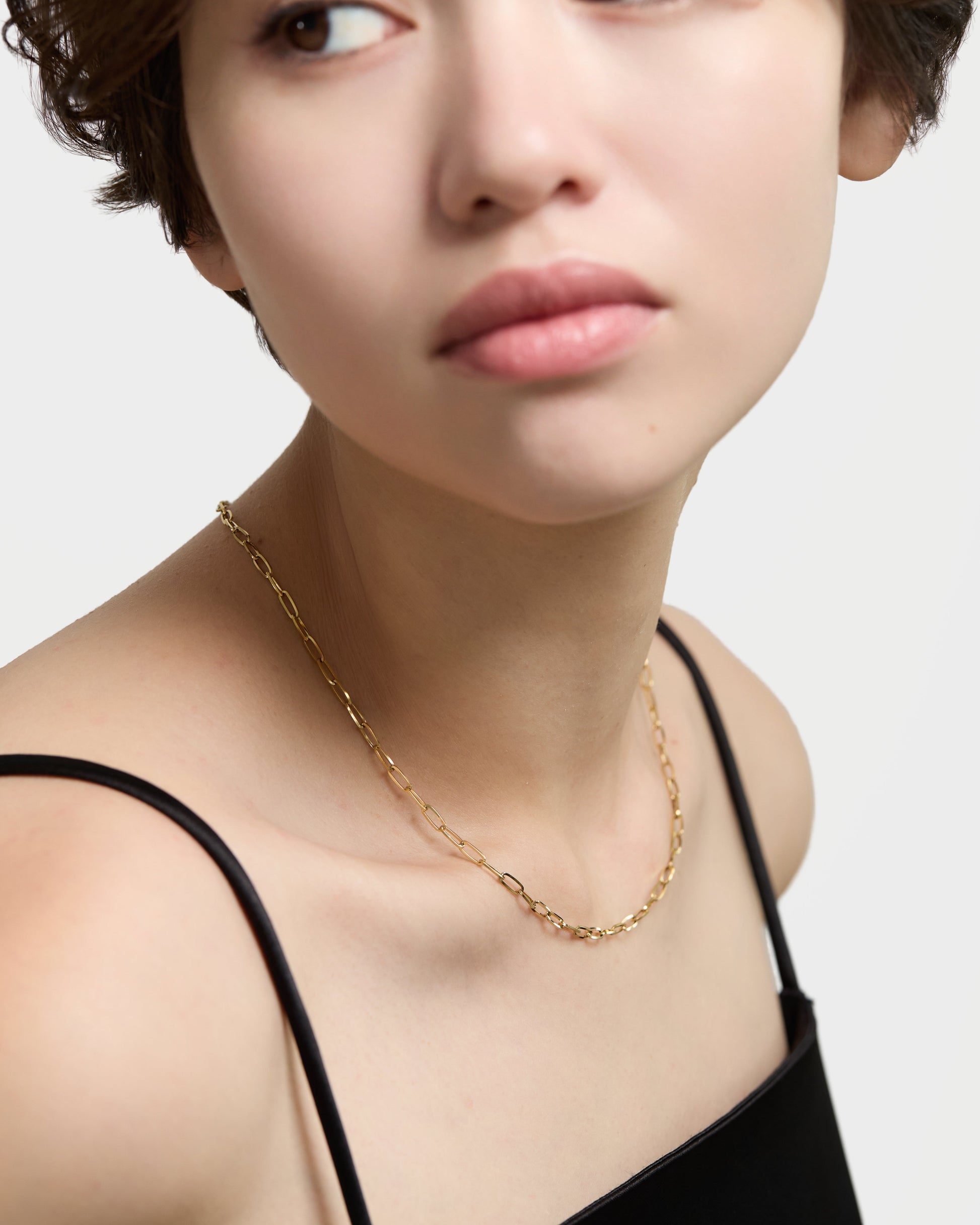 定番のペーパーチェーンを、華奢で繊細な印象に仕上げたモデルで、どんなスタイルにもなじみやすく、1本持っておくと頼れるアイテムです。