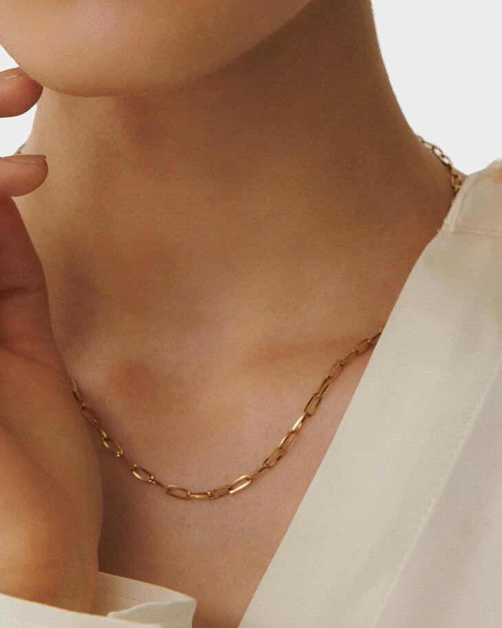 細長いリンクが連なるミニマルなデザインのペーパーチェーンで作られたナローペーパーチェーンネックレス。