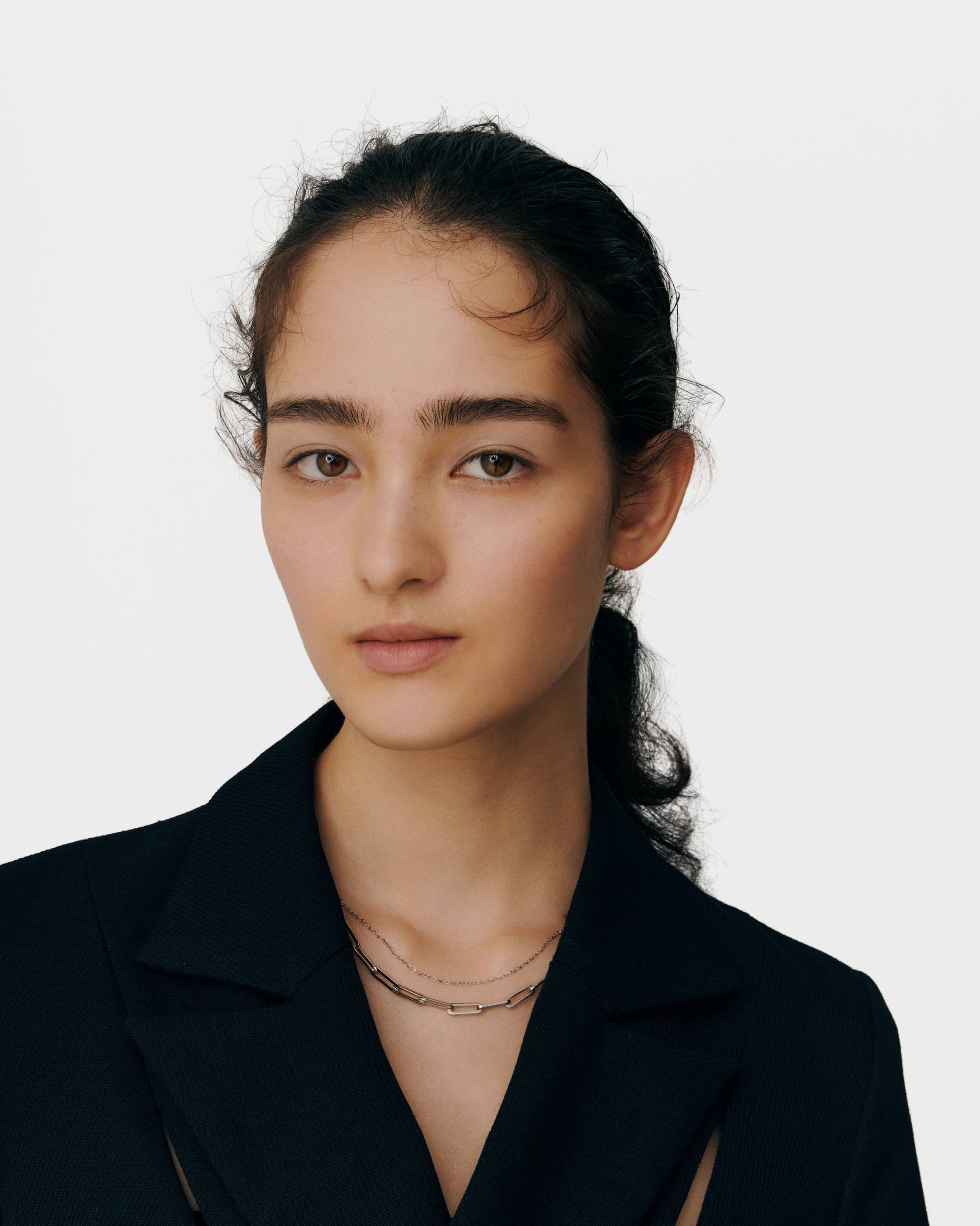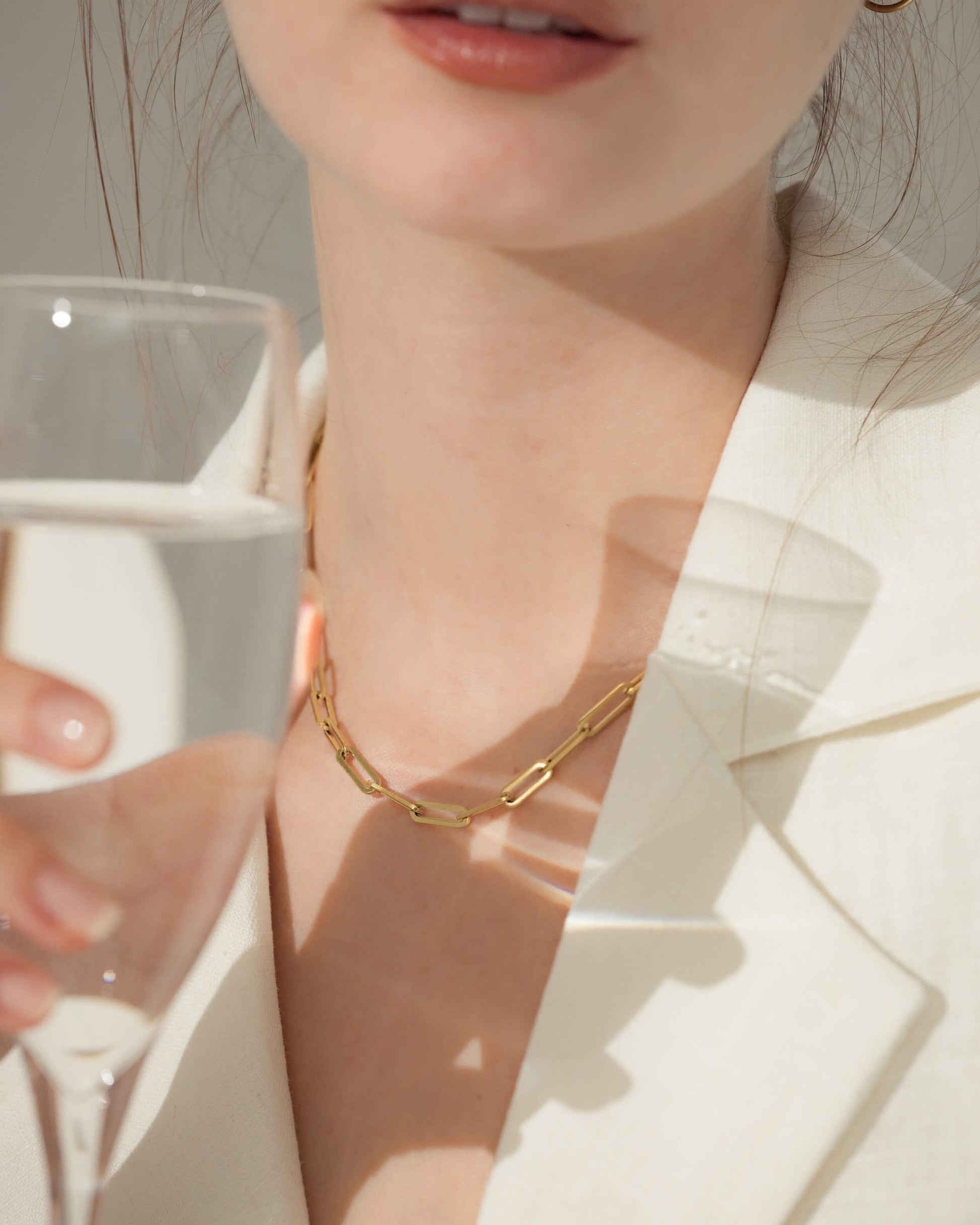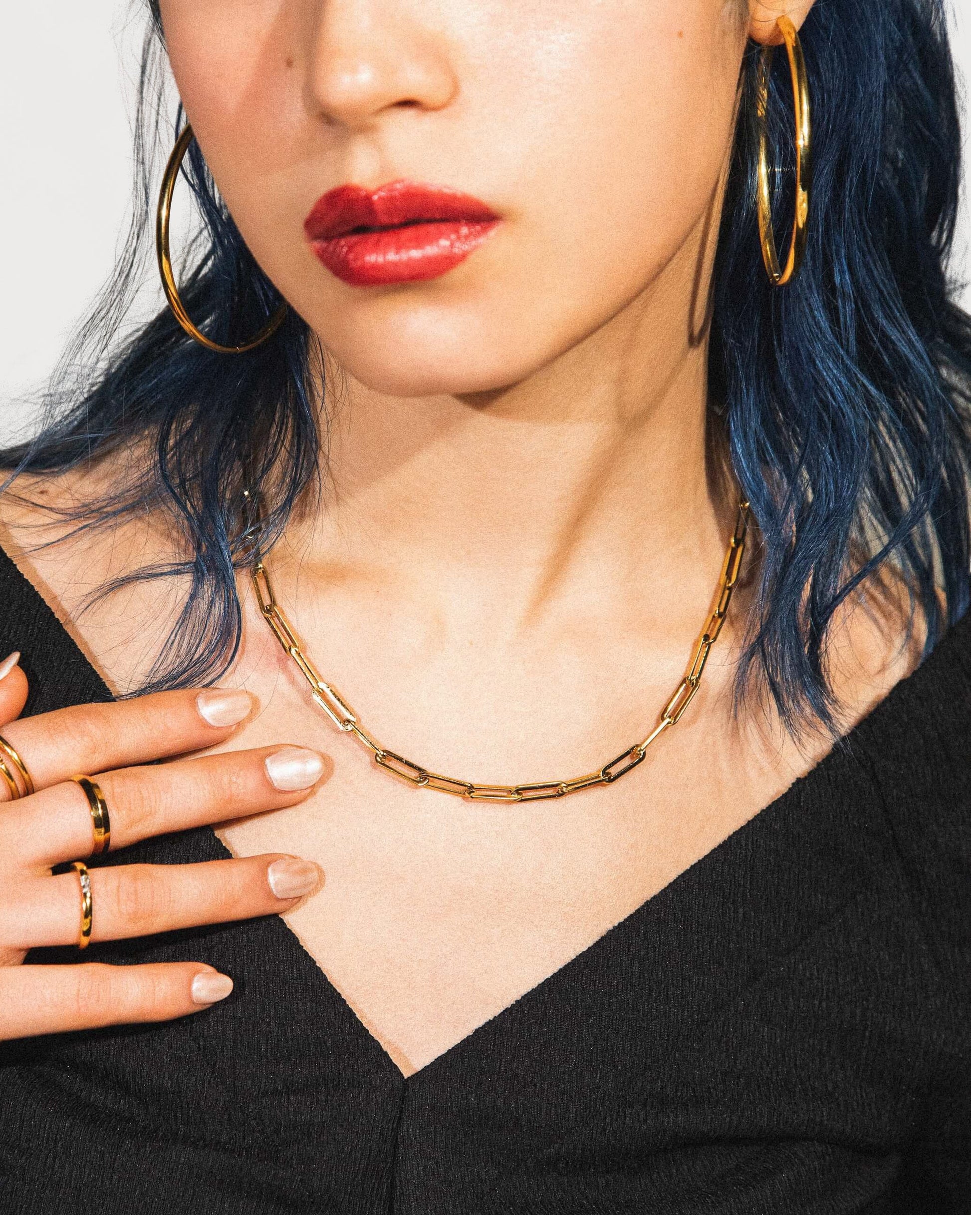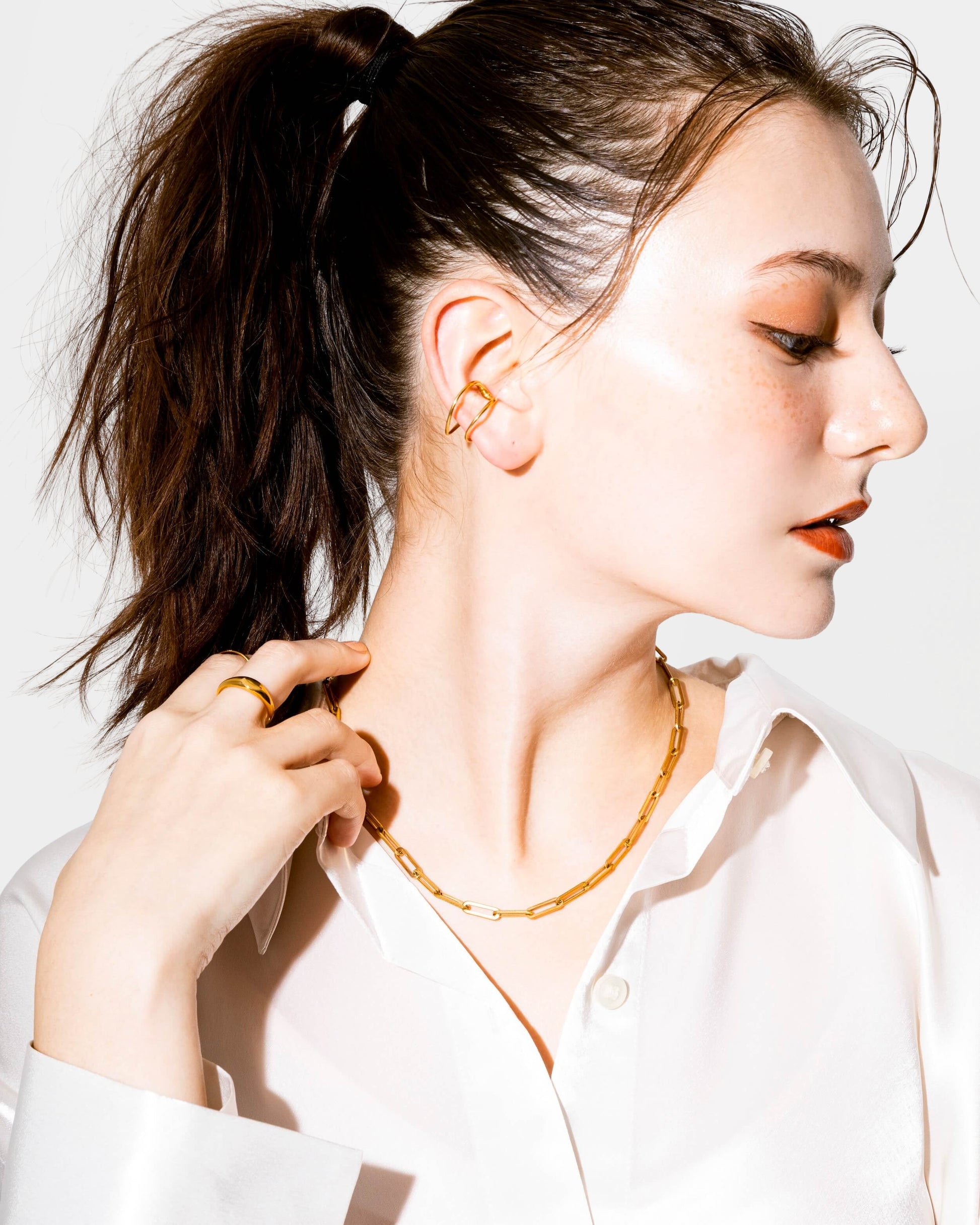 ペーパーチェーンネックレスが描く、静かで強いラインがスタイルを仕上げます。