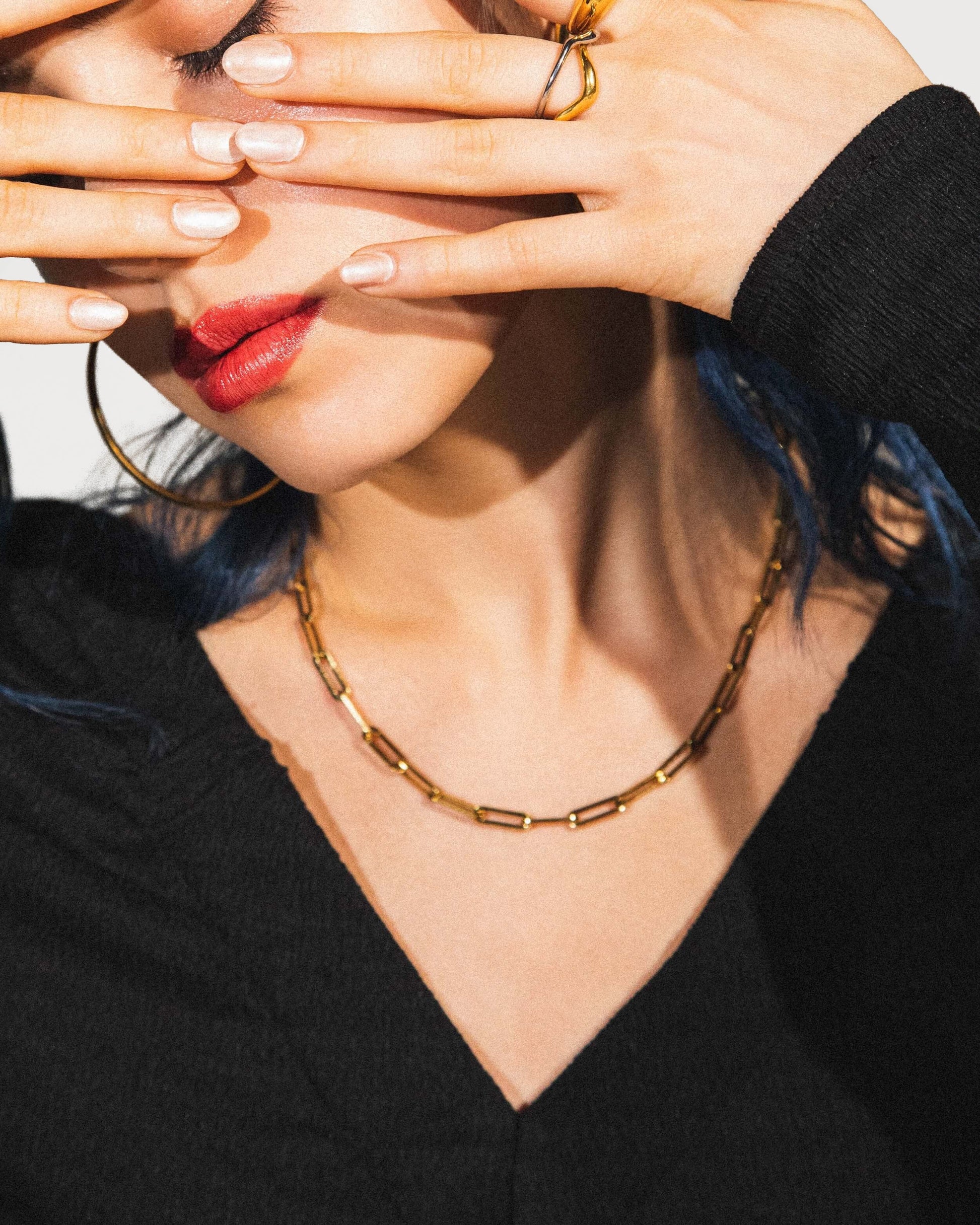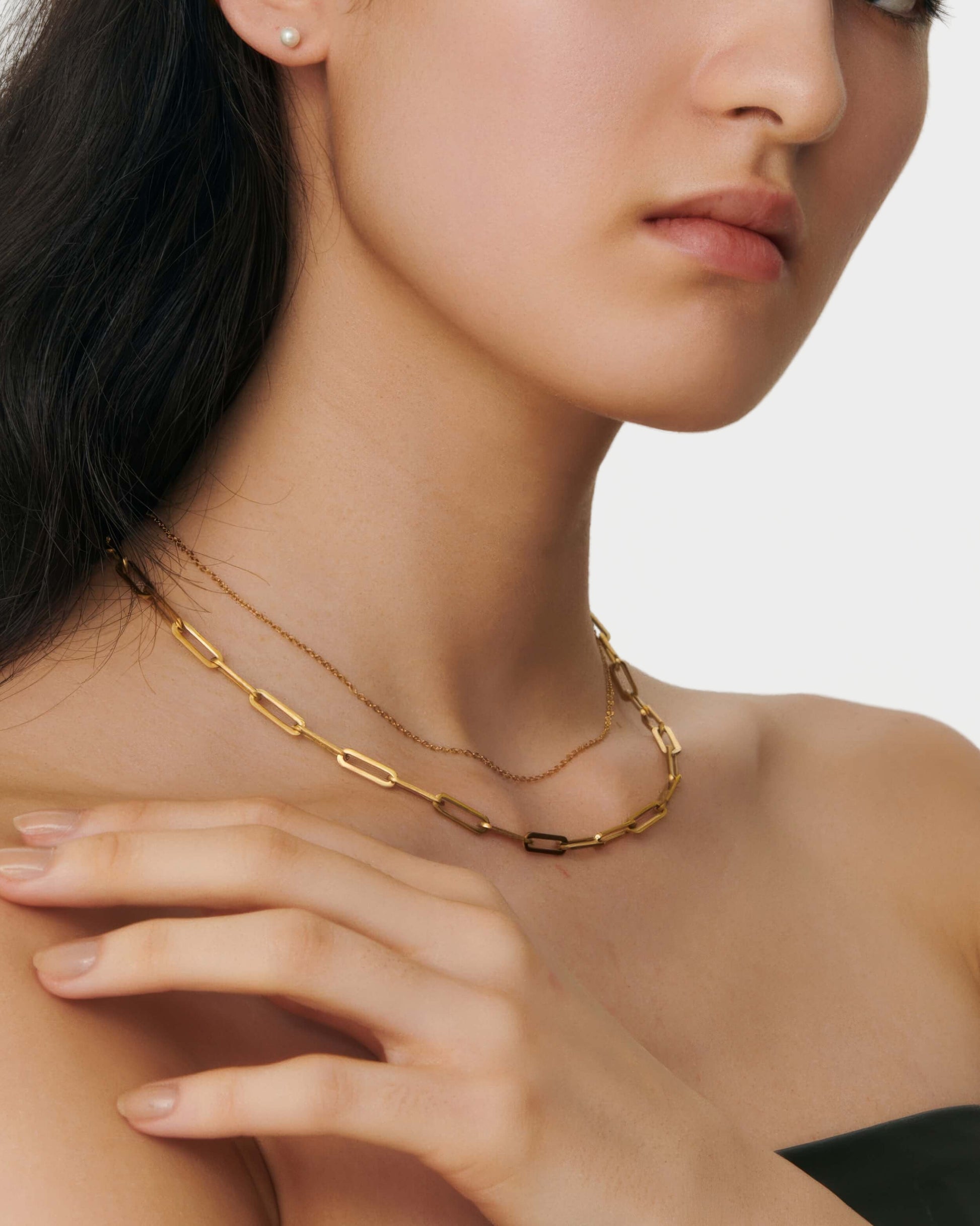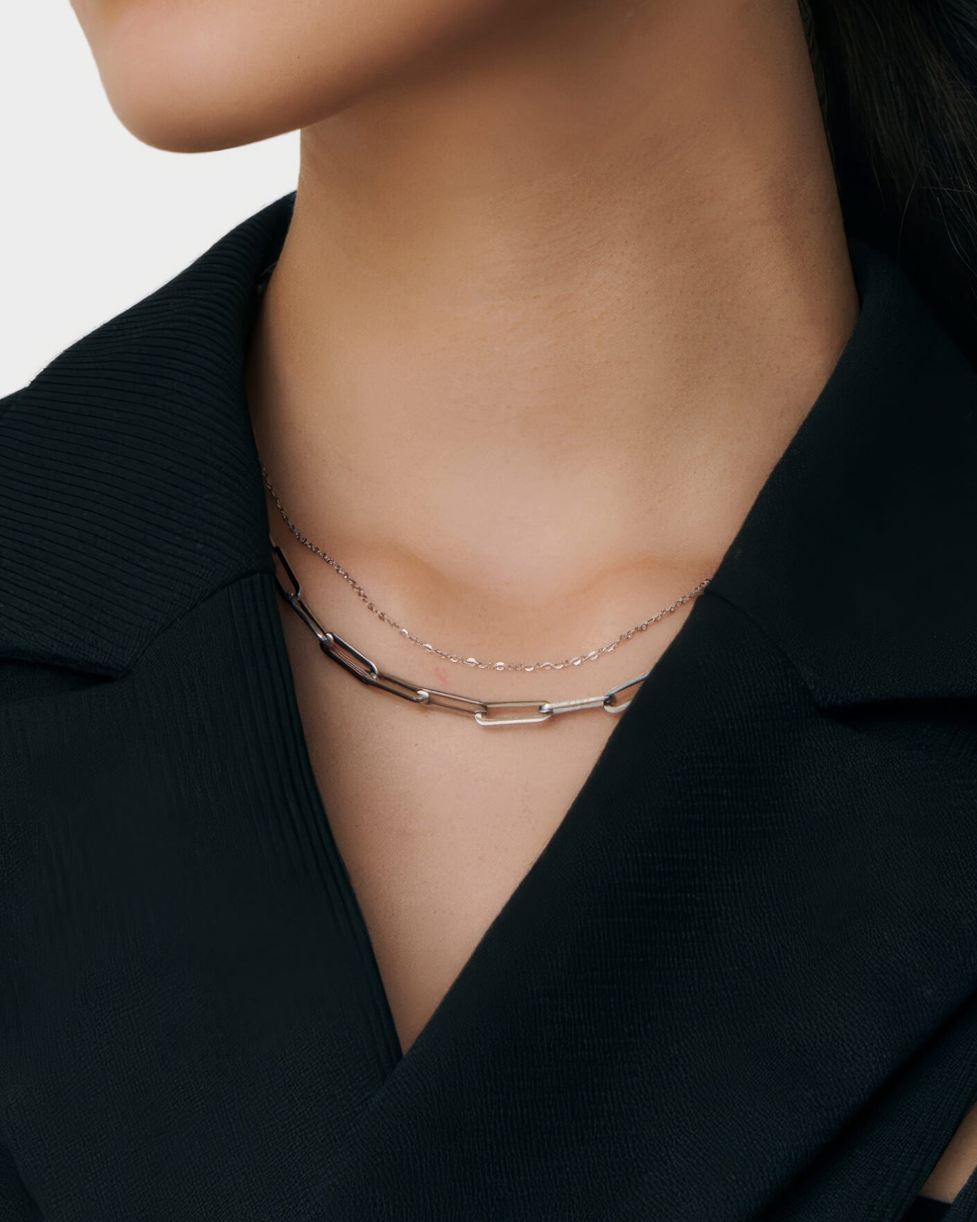 ペーパーチェーンネックレスが描く、静かで強いラインがスタイルを仕上げます。