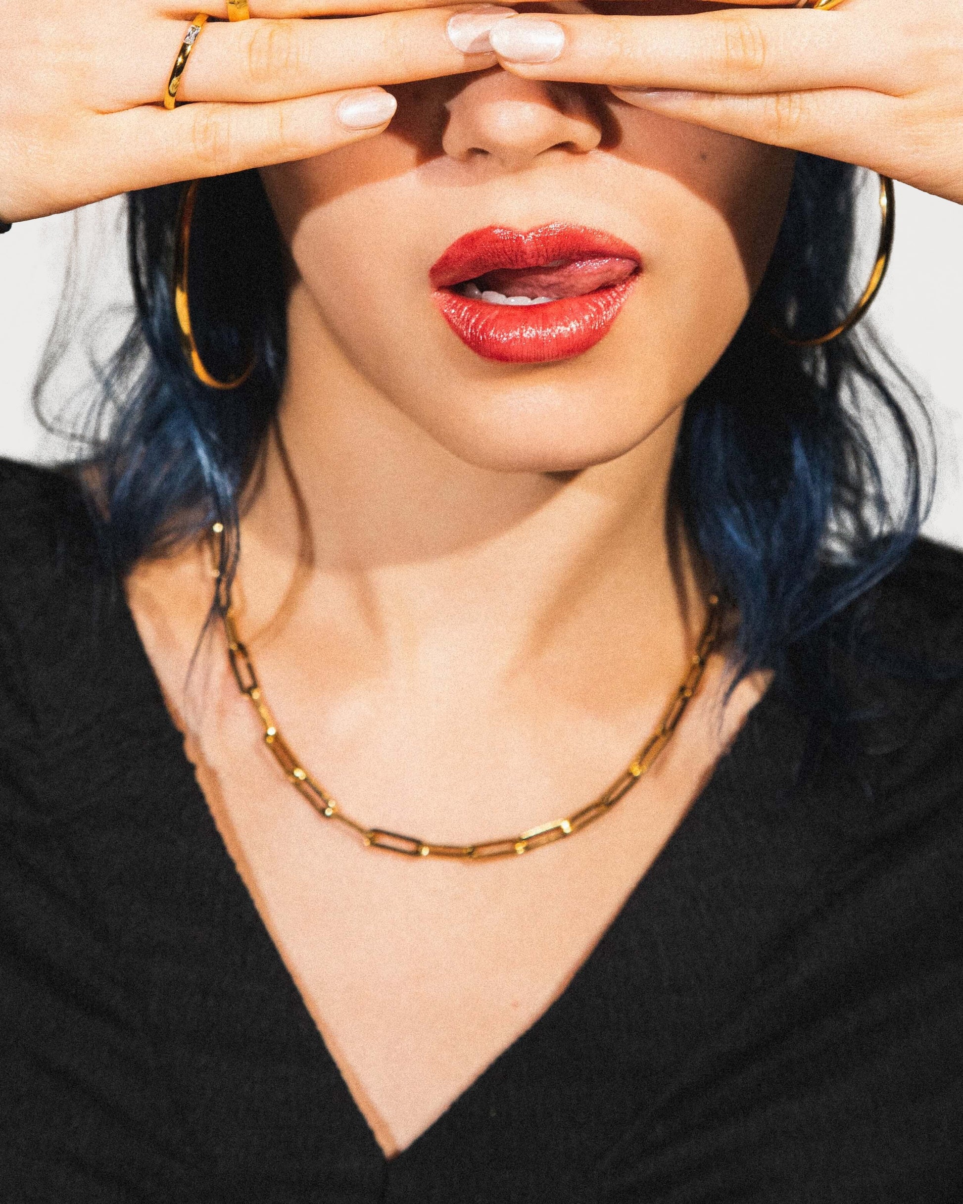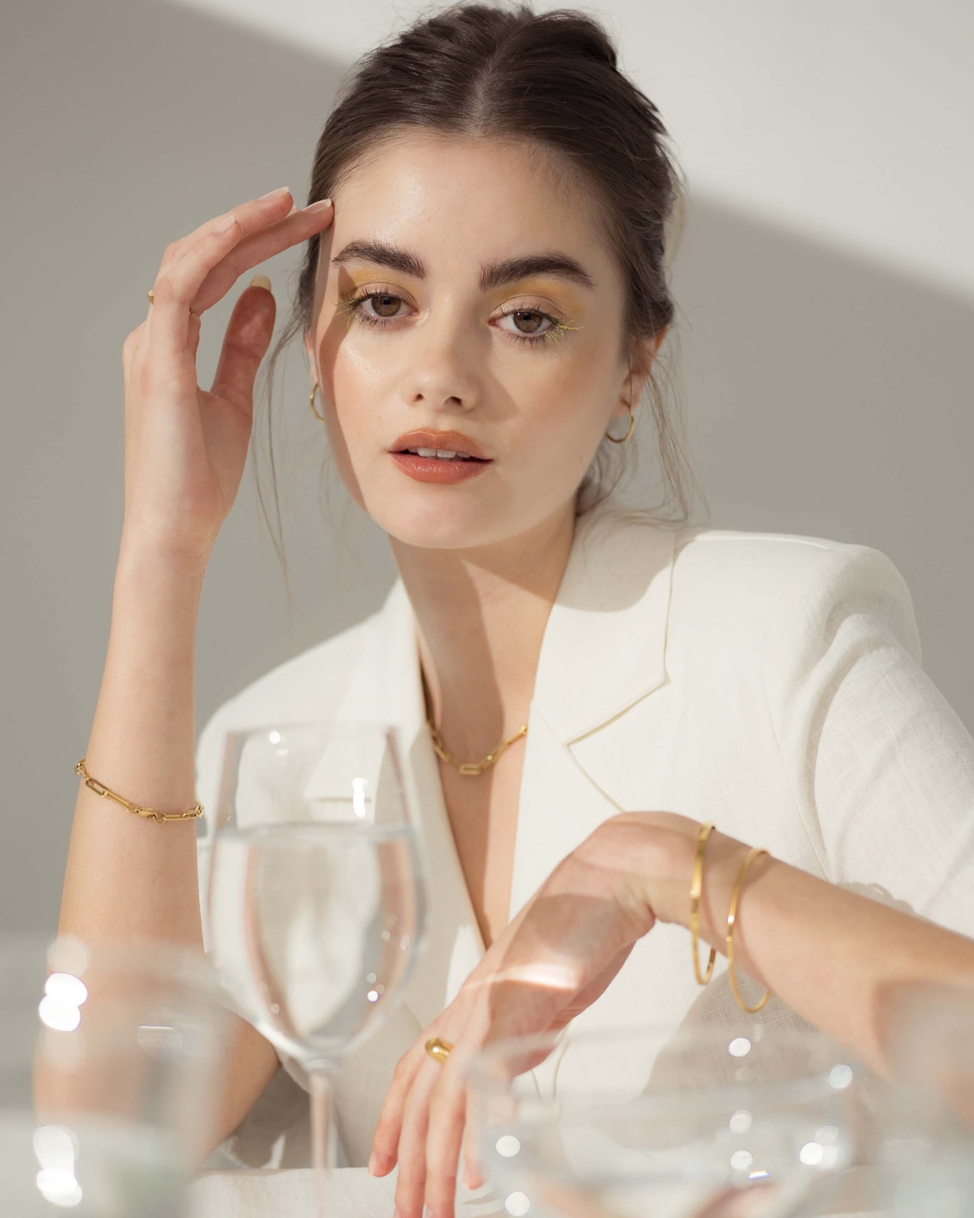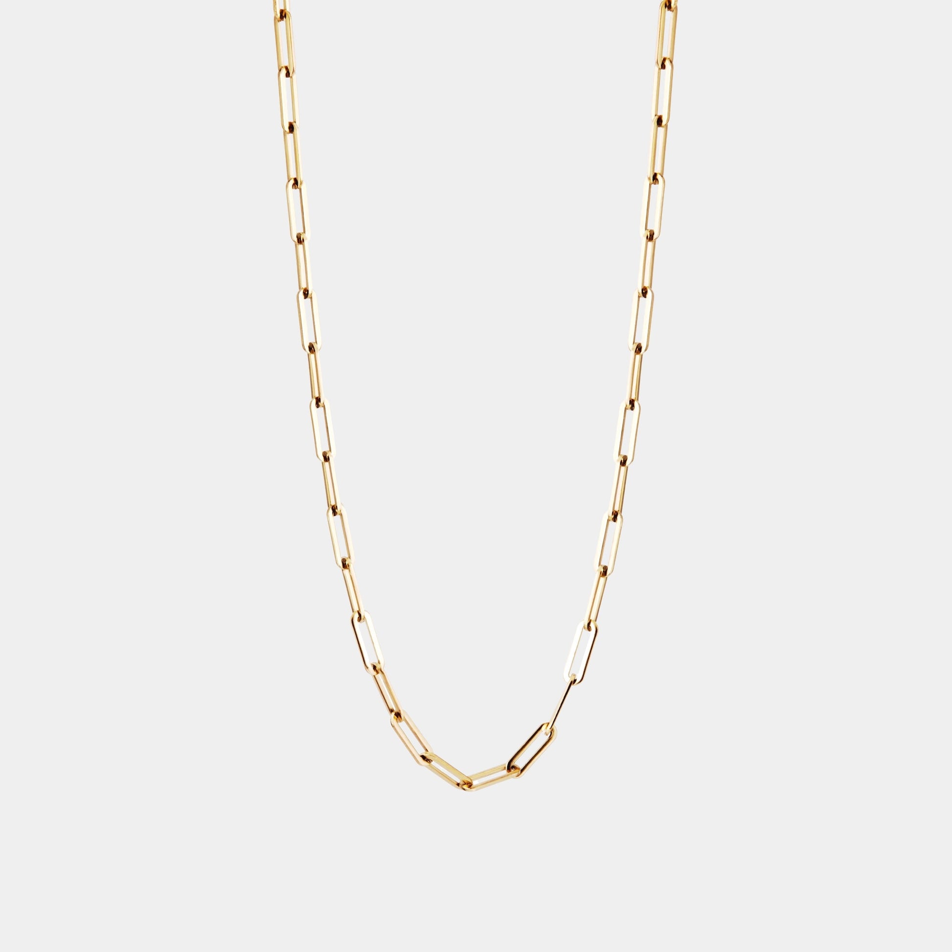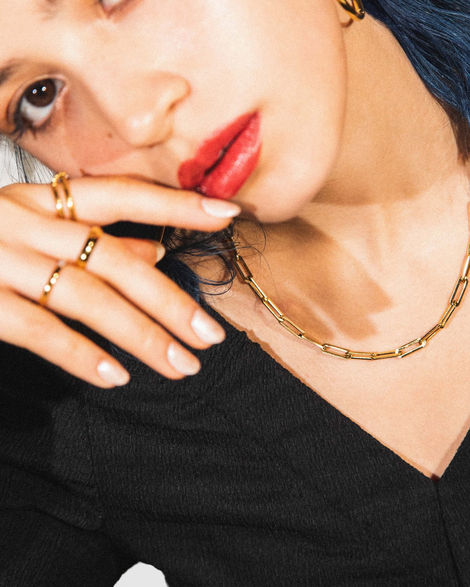 ペーパーチェーンネックレスが描く、静かで強いラインがスタイルを仕上げます。