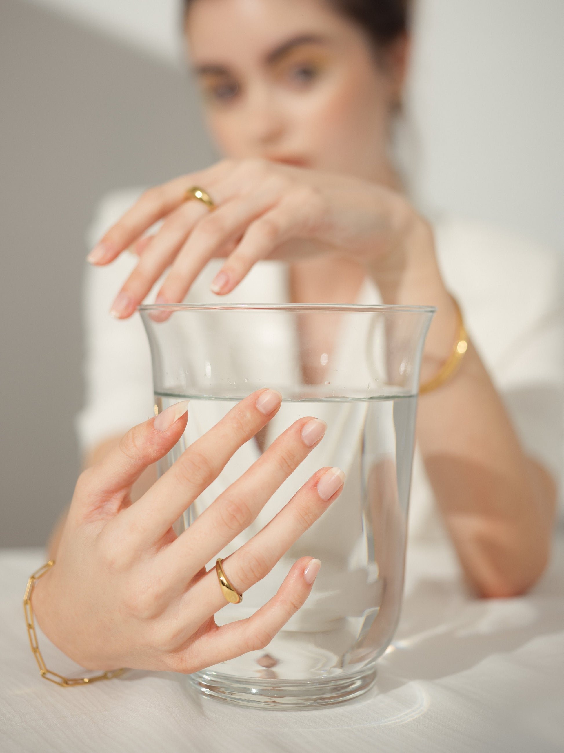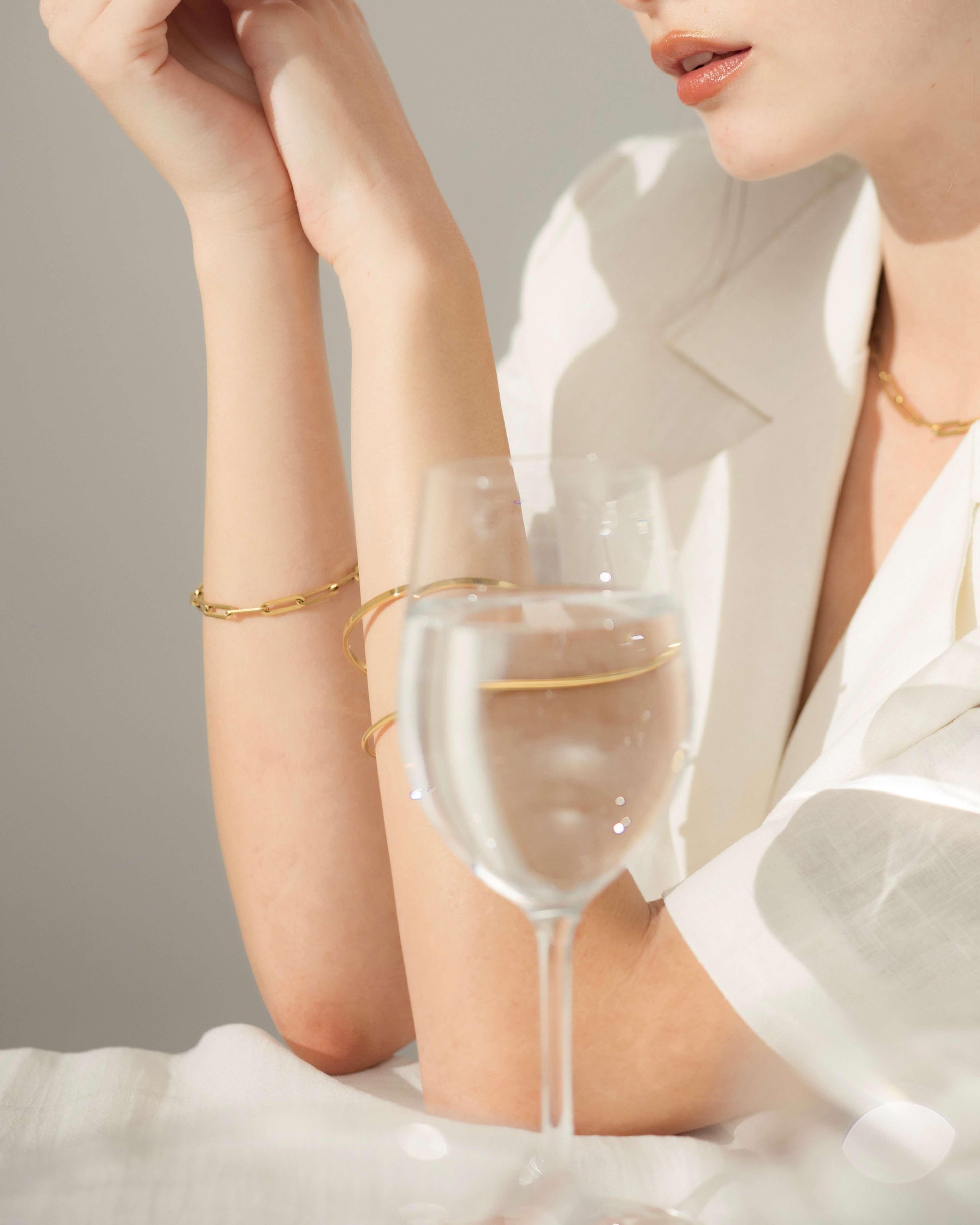 主張しすぎないフォルムとほどよいボリューム感で、単体でも、時計や他のバングルとの重ね付けでもバランス良く仕上がるのが魅力。