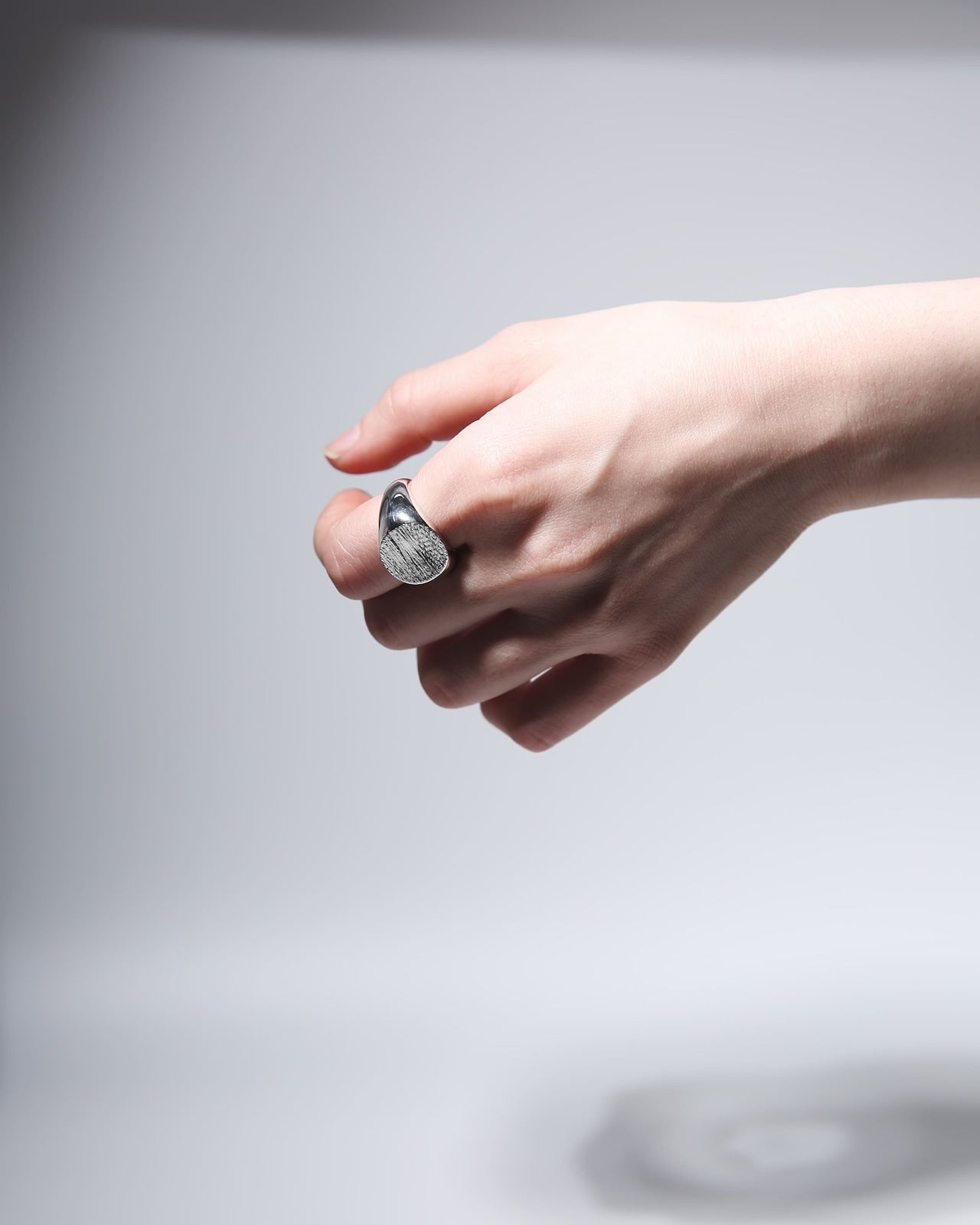 トップに無数の傷のようなデザインを加えることで、時間が経つにつれ溝部分にのみ硫化によって起こる黒色の変色が残るようになります。