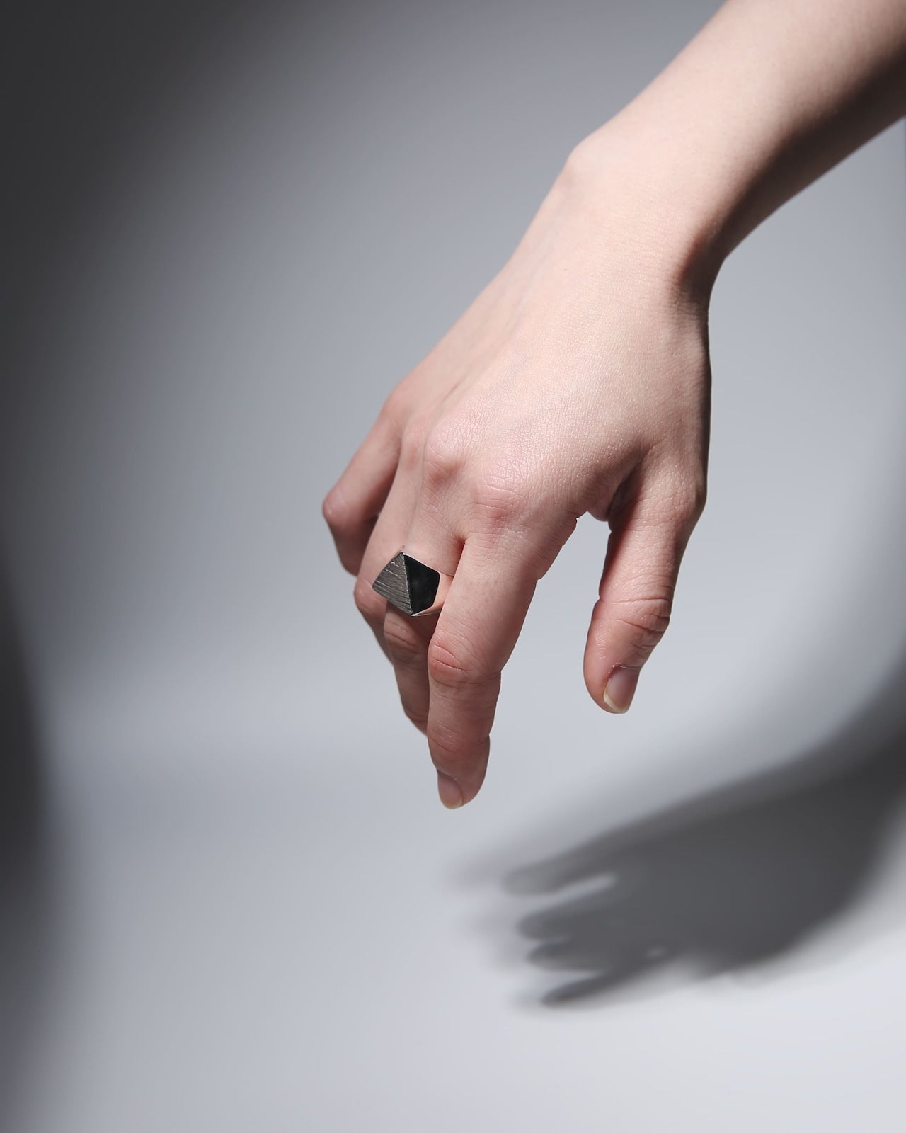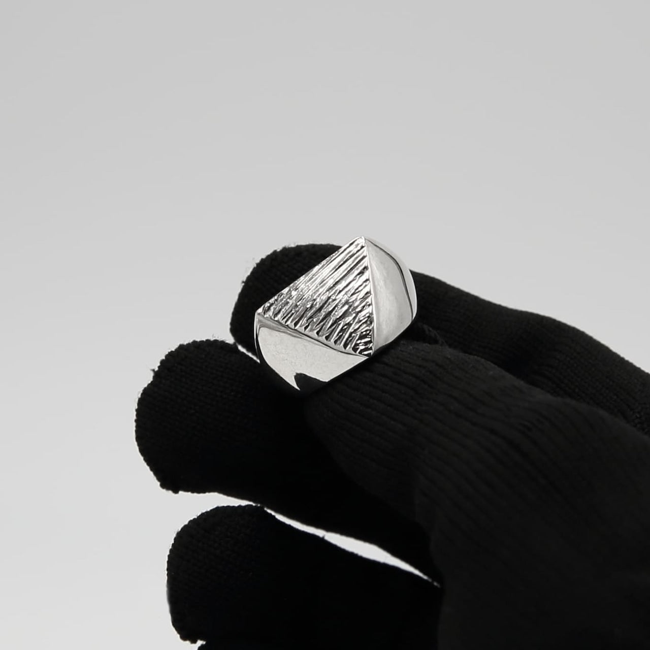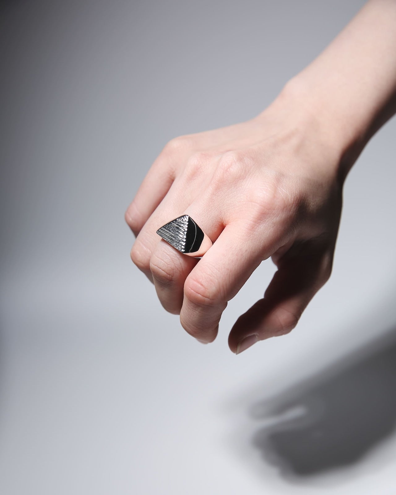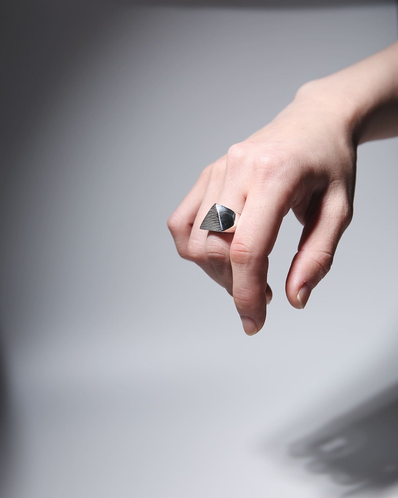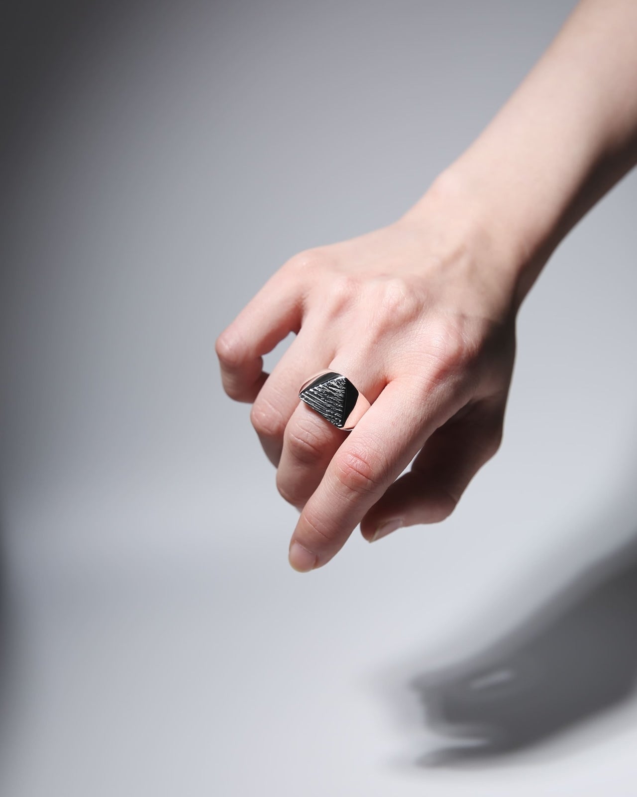 トップに無数の傷のようなデザインを加えることで、時間が経つにつれ溝部分にのみ硫化によって起こる黒色の変色が残るようになります。
