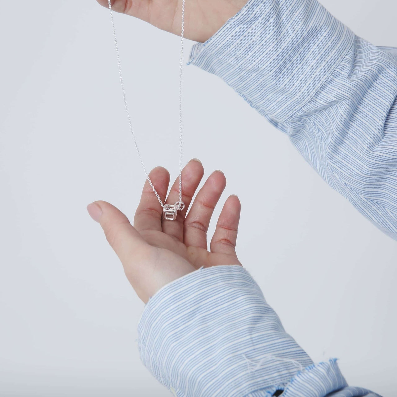 手作業で造形した不完全さを残した立方体パーツが大小2つ連なったネックレスです。