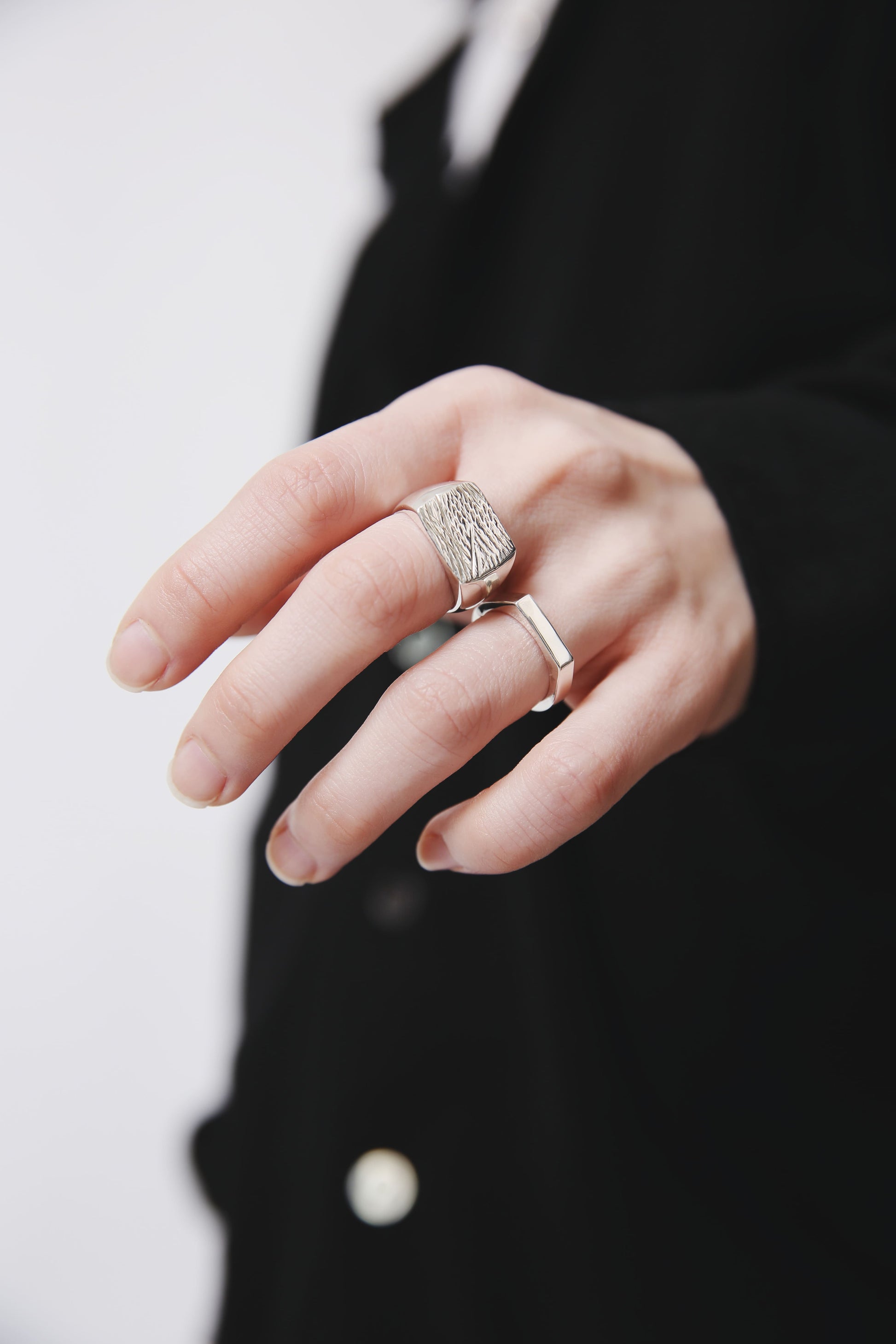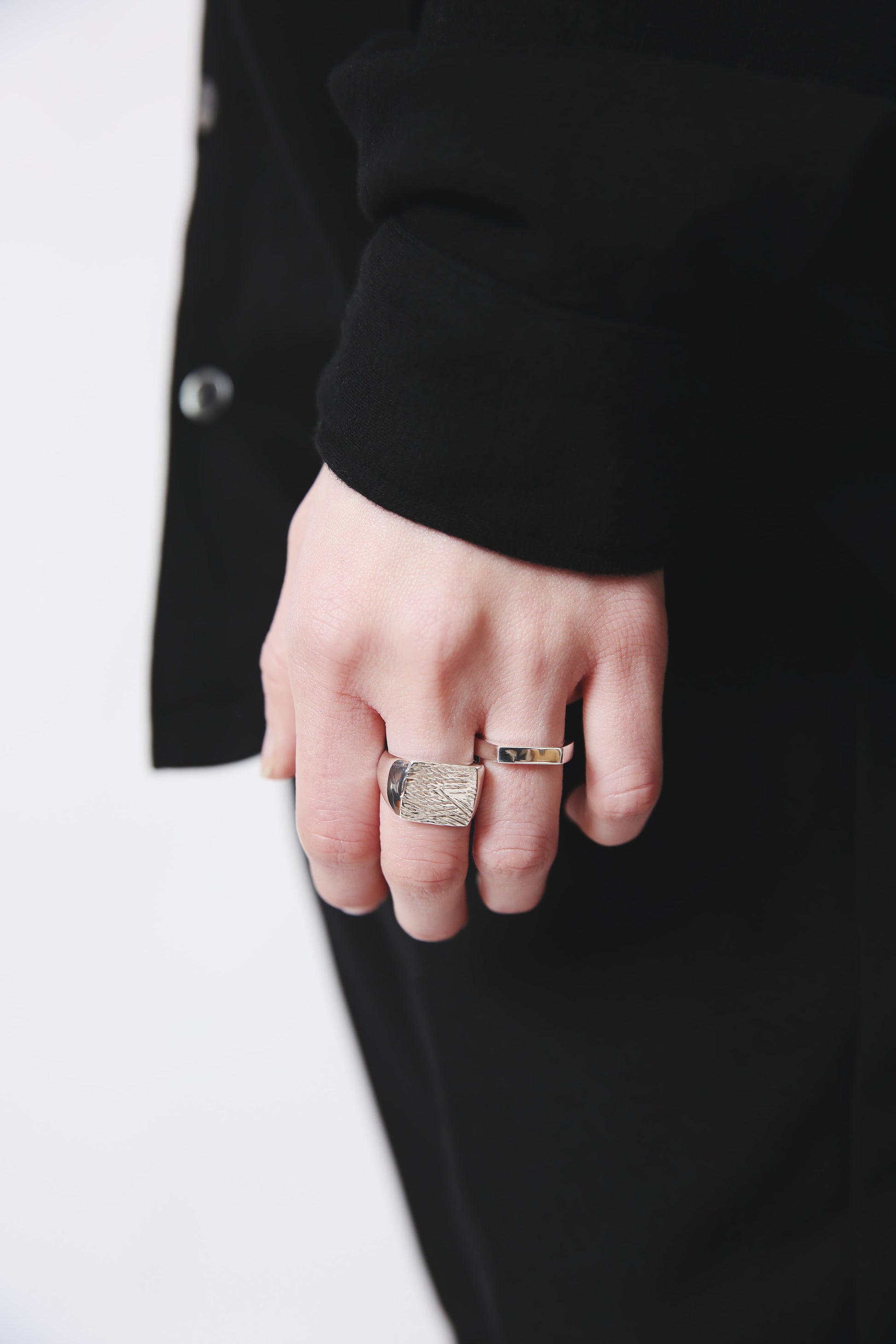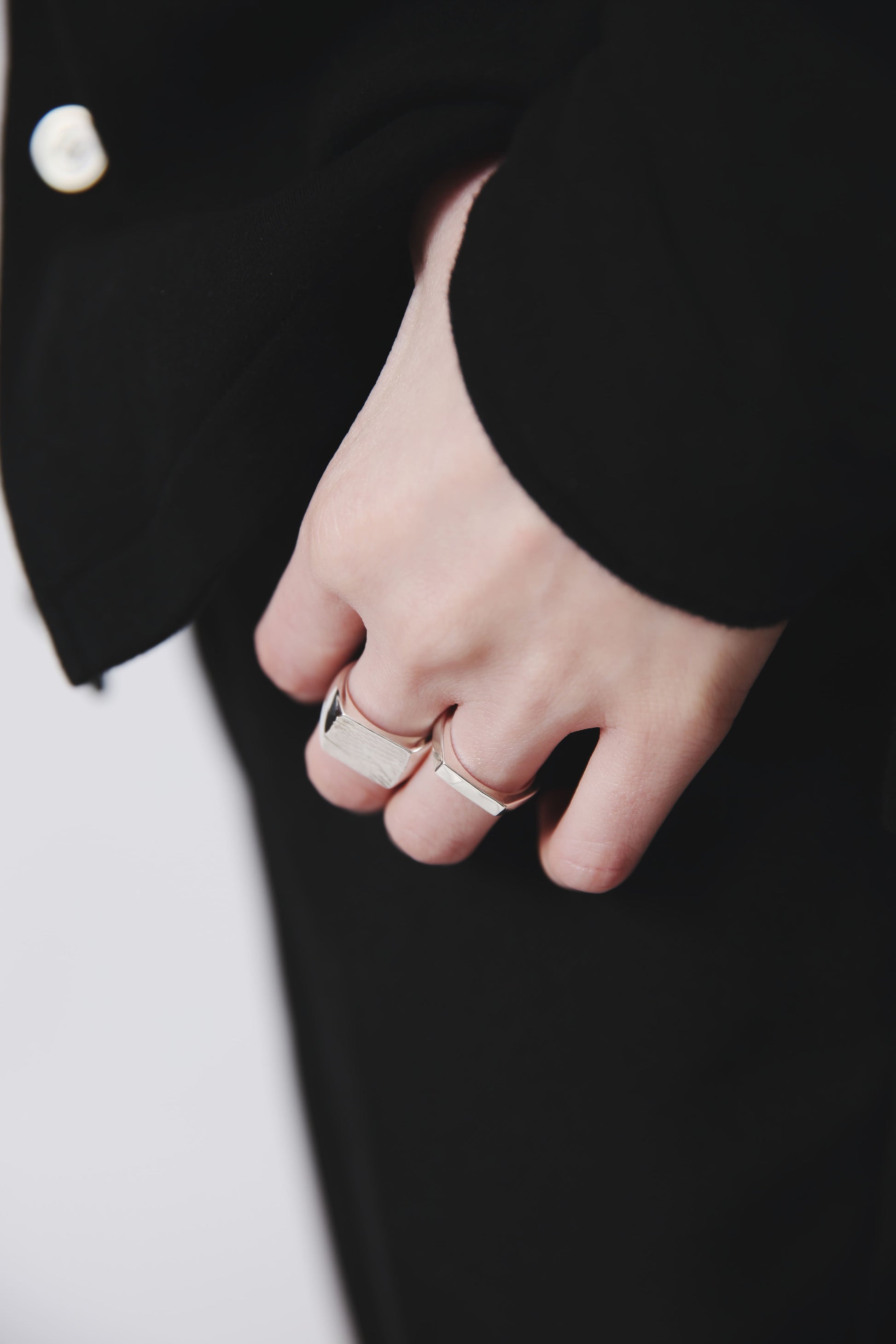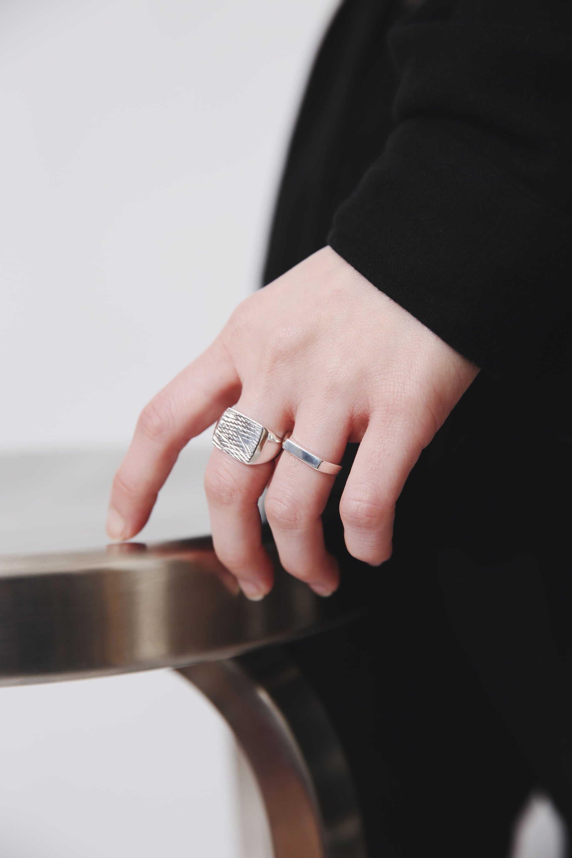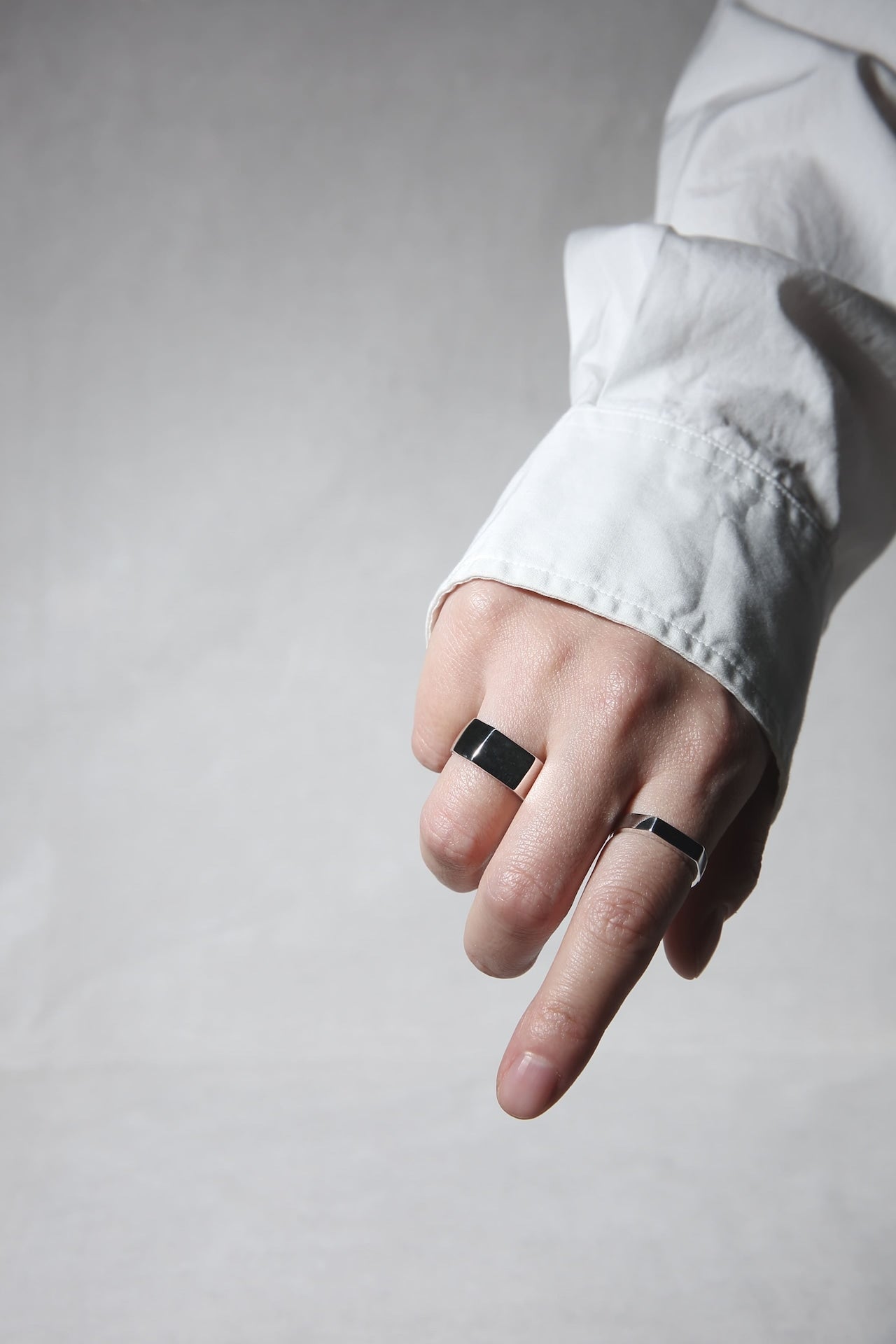 同シリーズのデザインで幅約9mmのリングもご用意しております。(商品画像9~12枚目で一緒にスタイリングしているリングです)よろしければご覧ください。