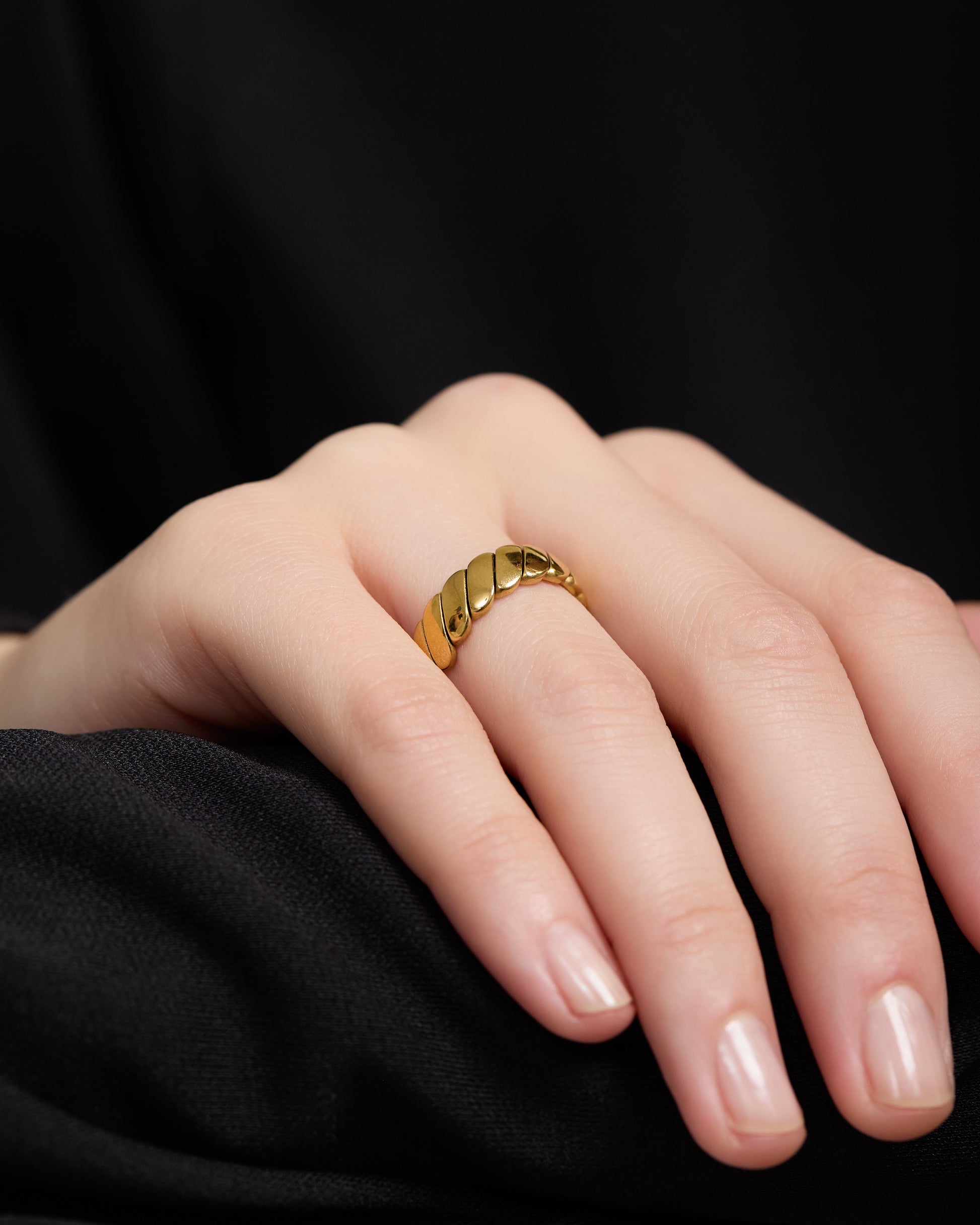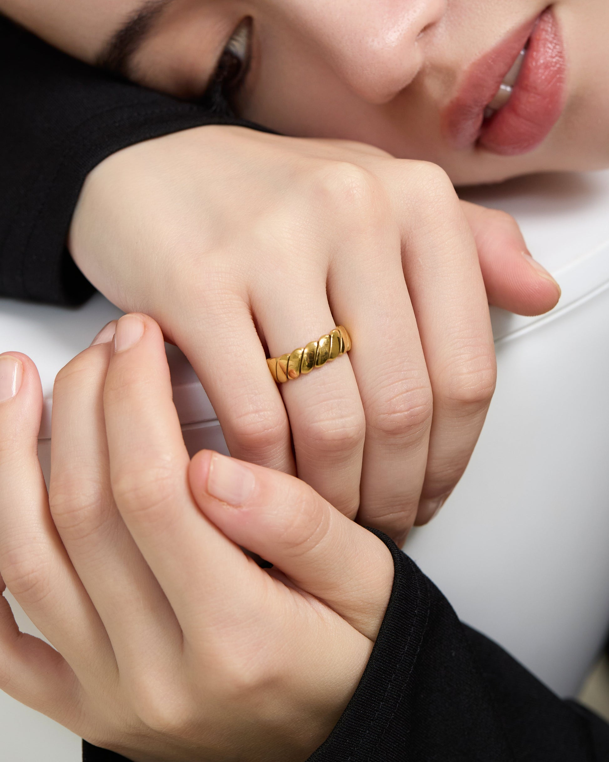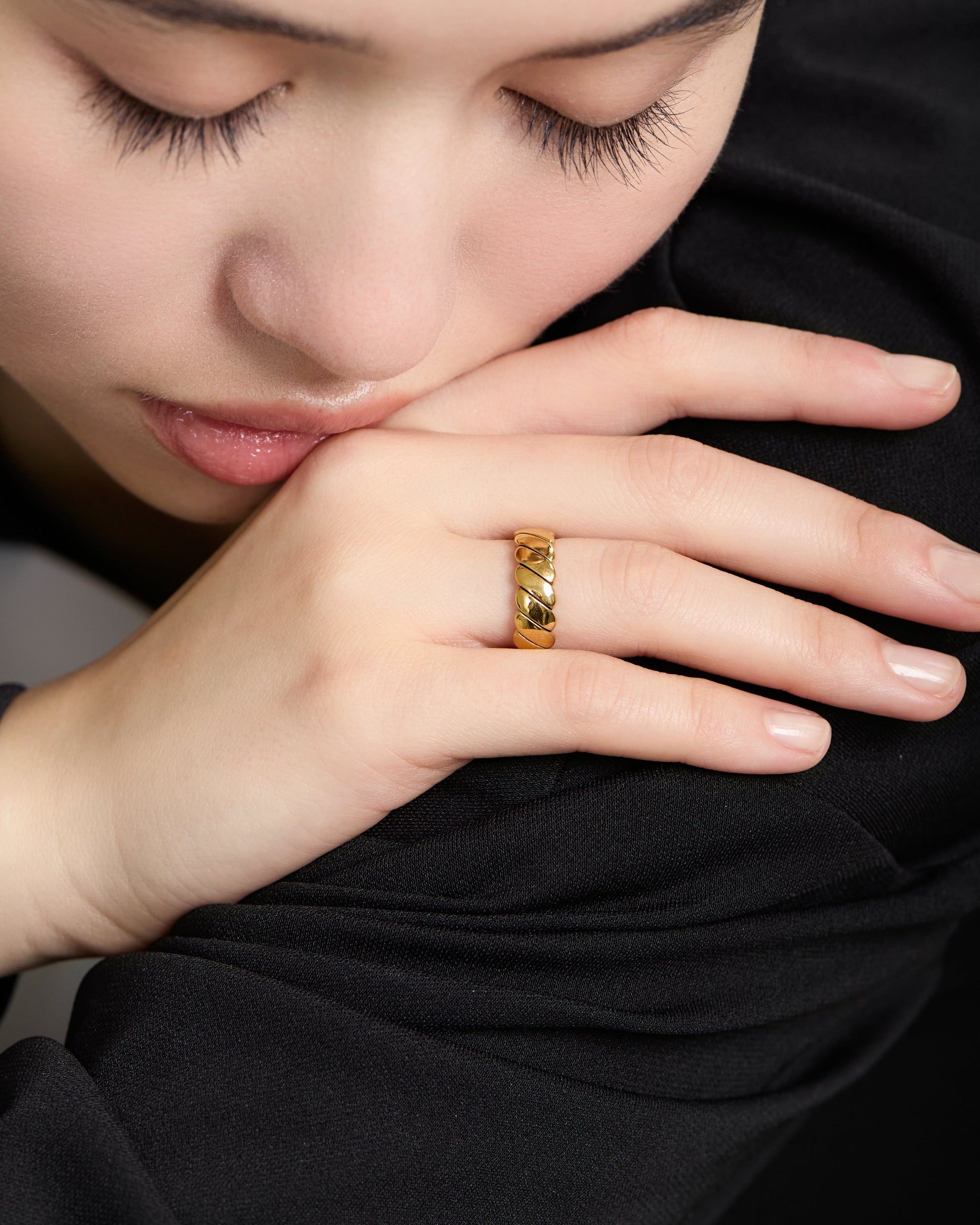 なめらかなカッティングが施された立体的なフォルムが印象的なタイムレスリング。