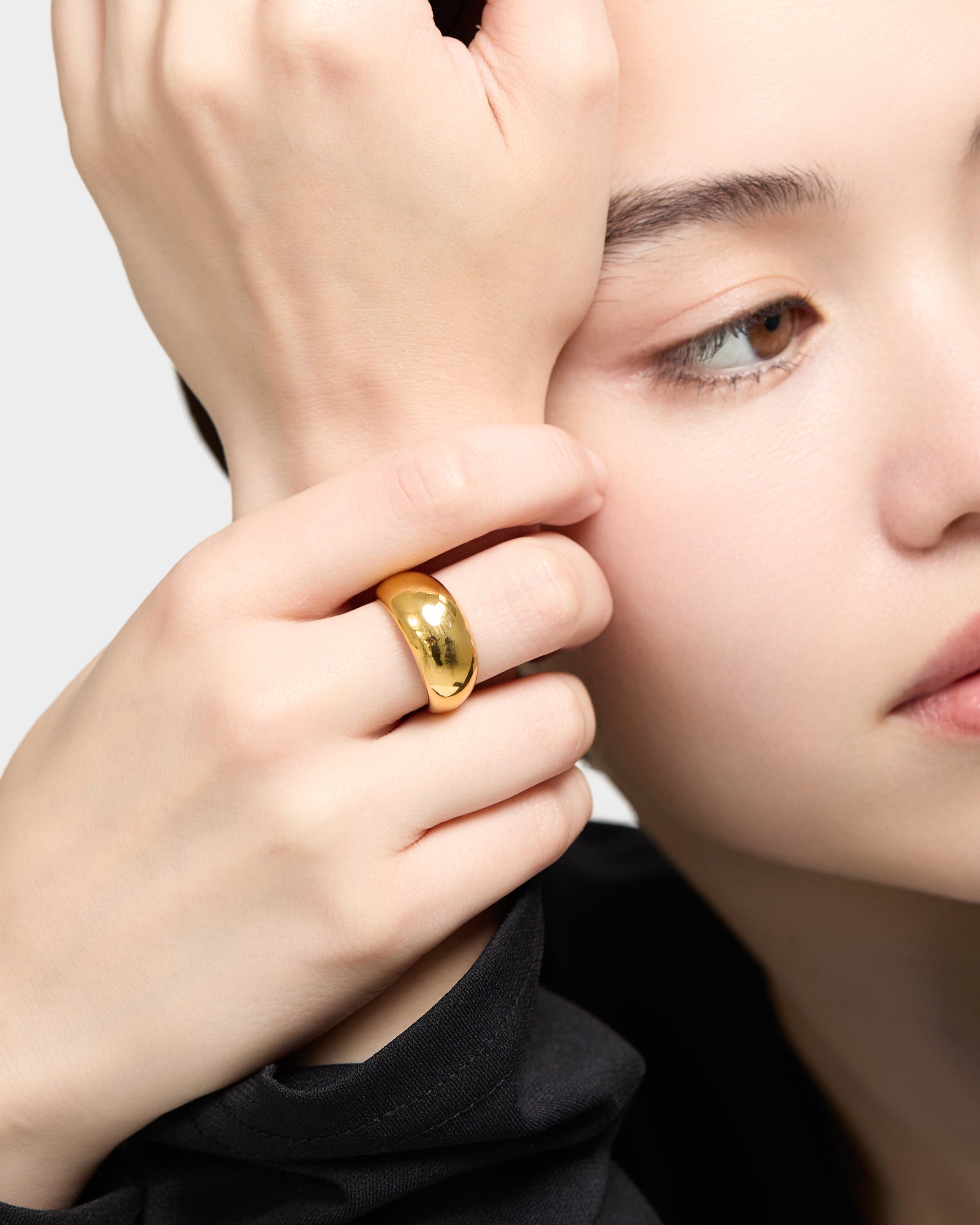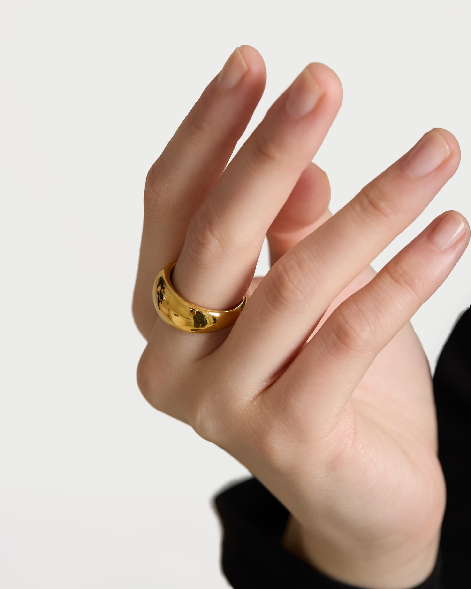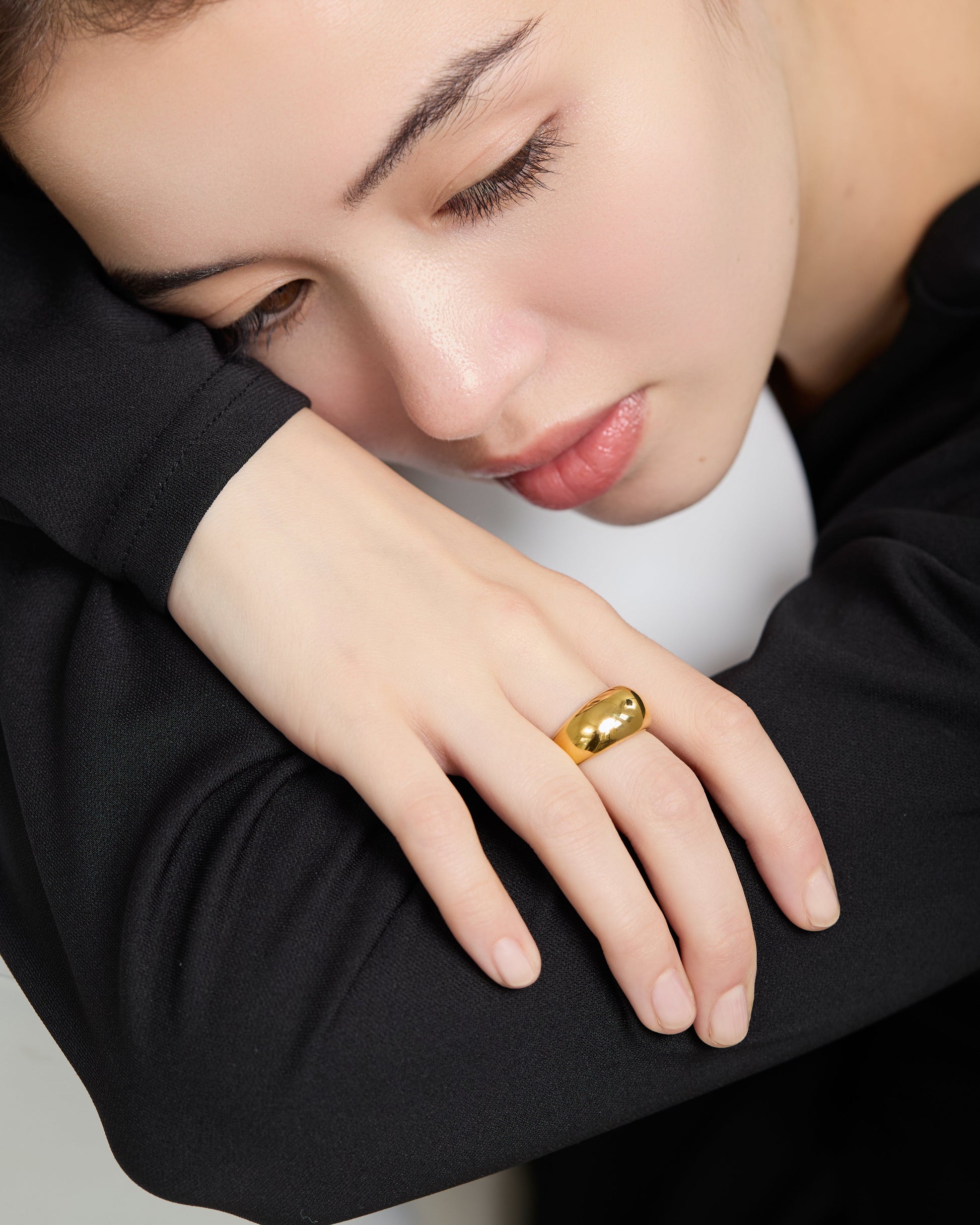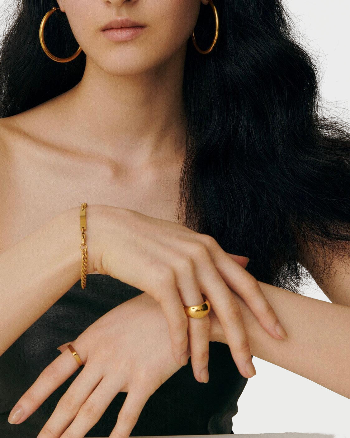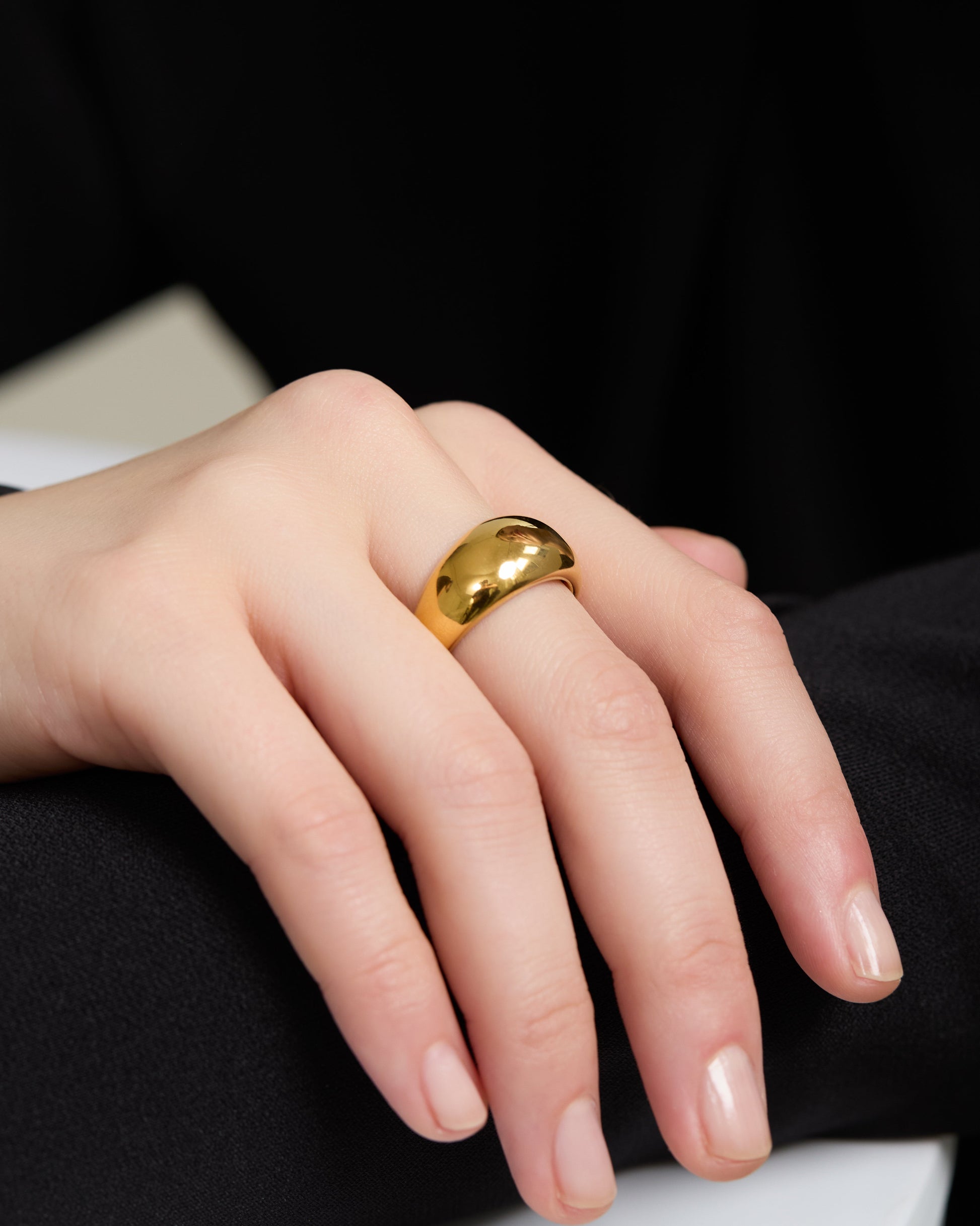 なめらかな表面が光をやさしく反射し、指元に力強さと洗練を共存させた存在感を演出します。