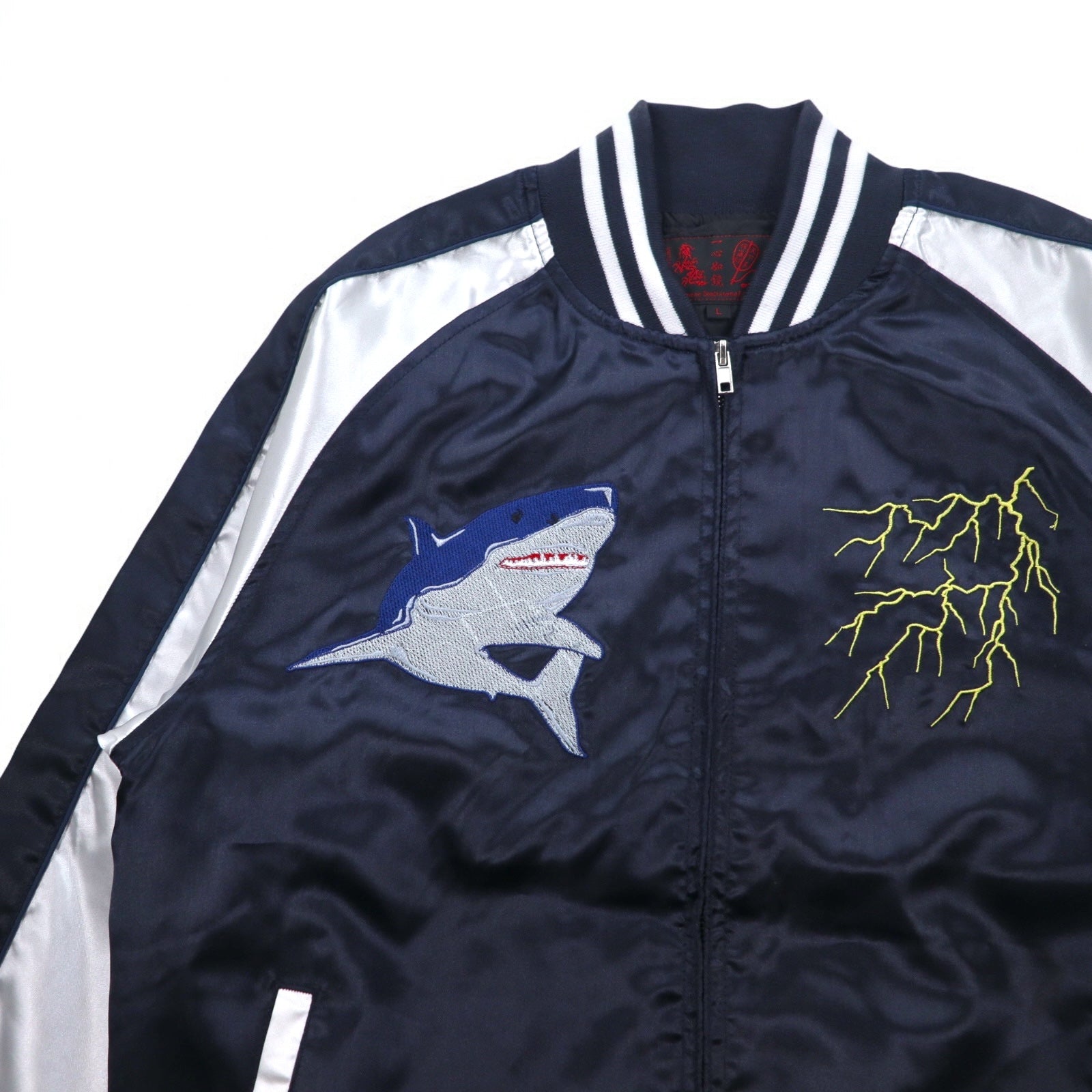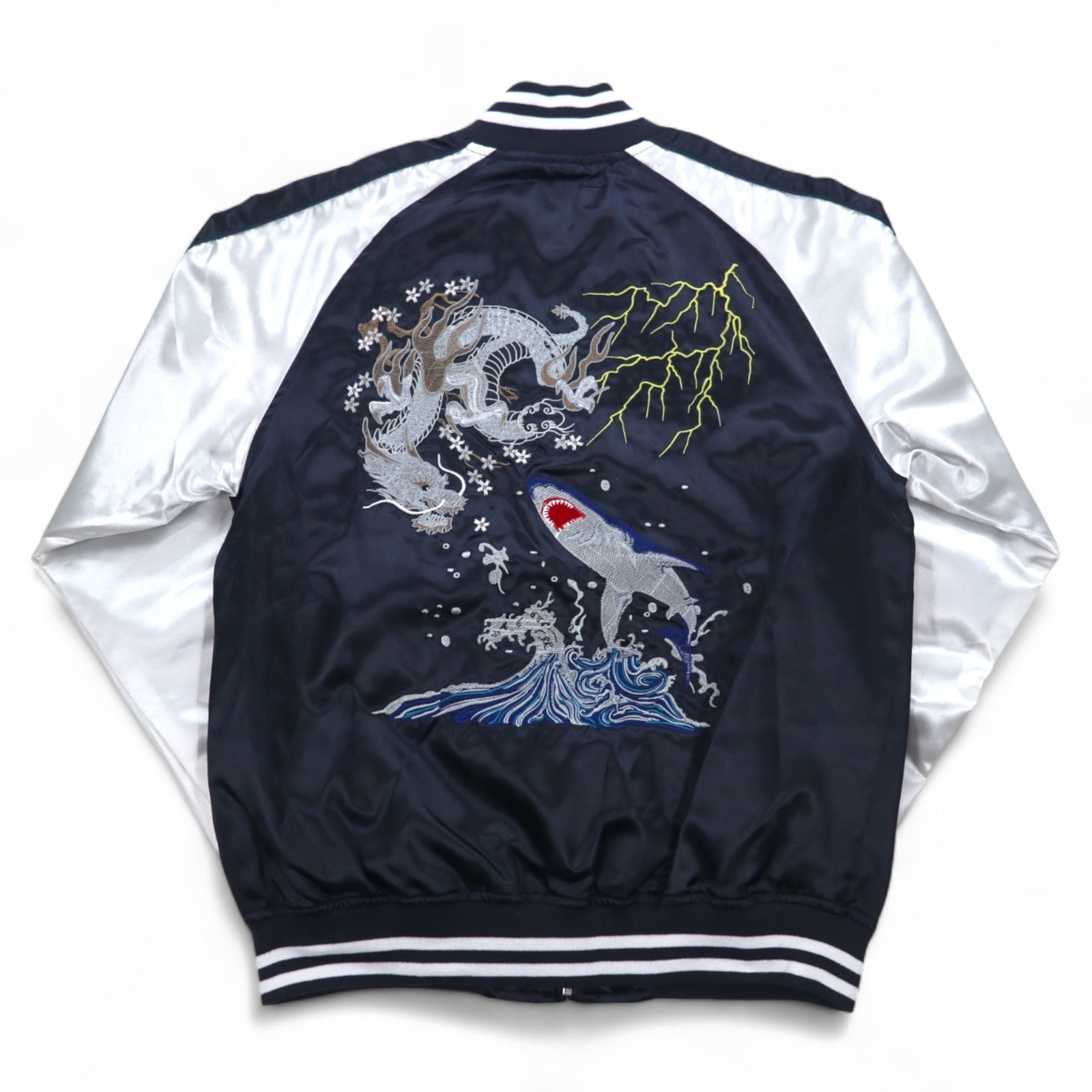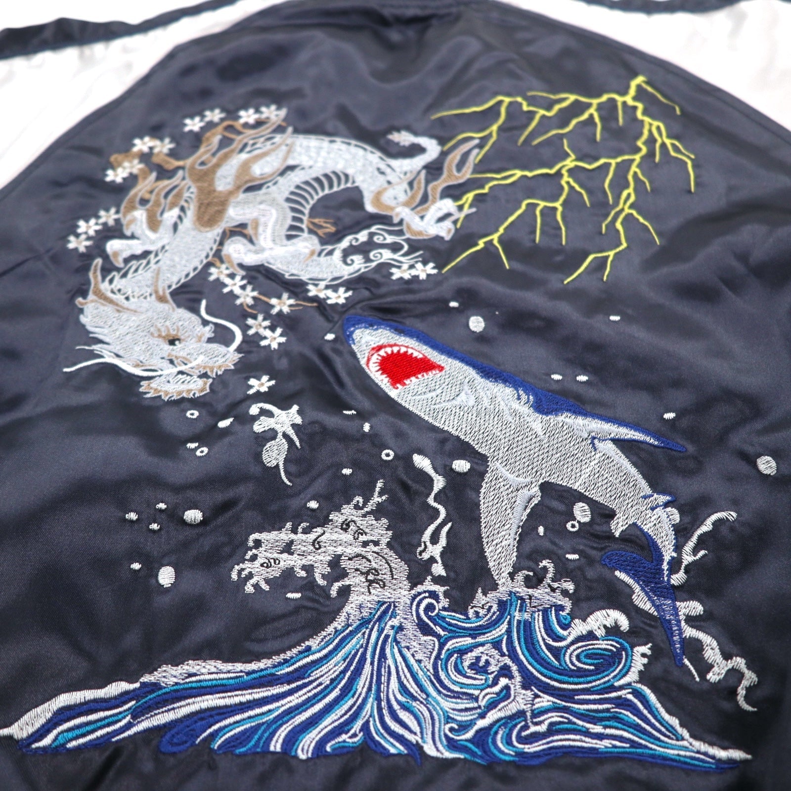 一心如鏡 スカジャン L ブラック シルバー ポリエステル サメ 龍 刺繍 53103