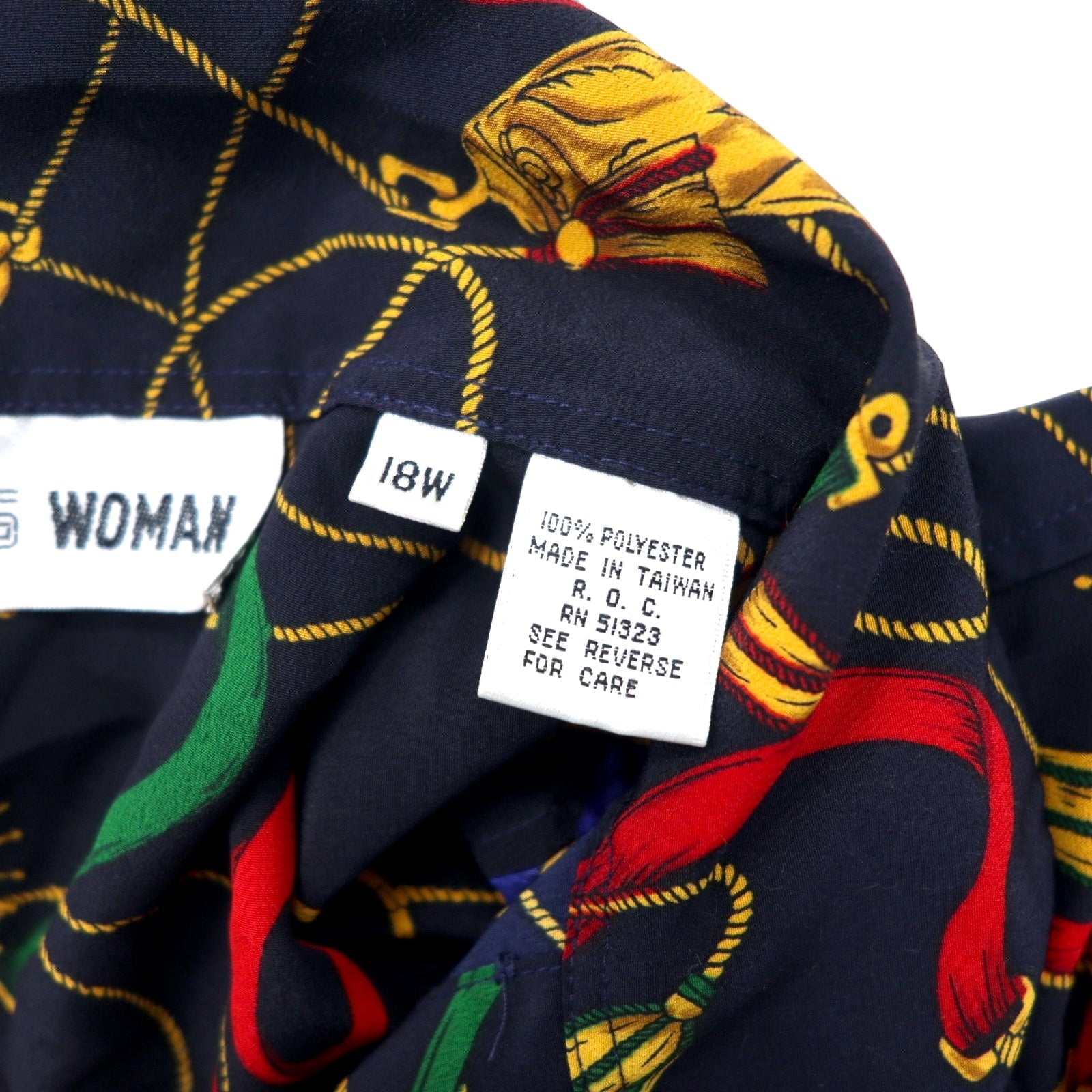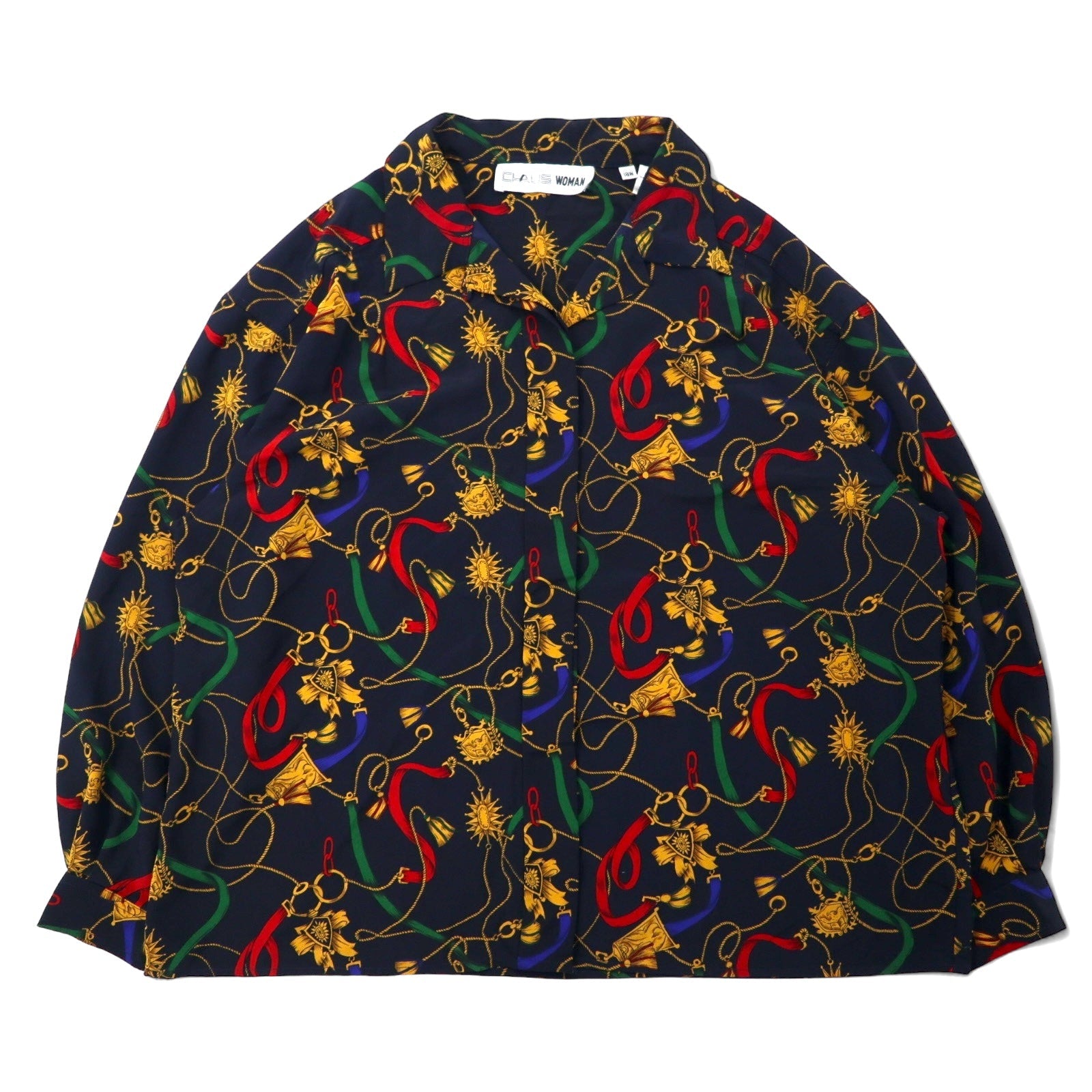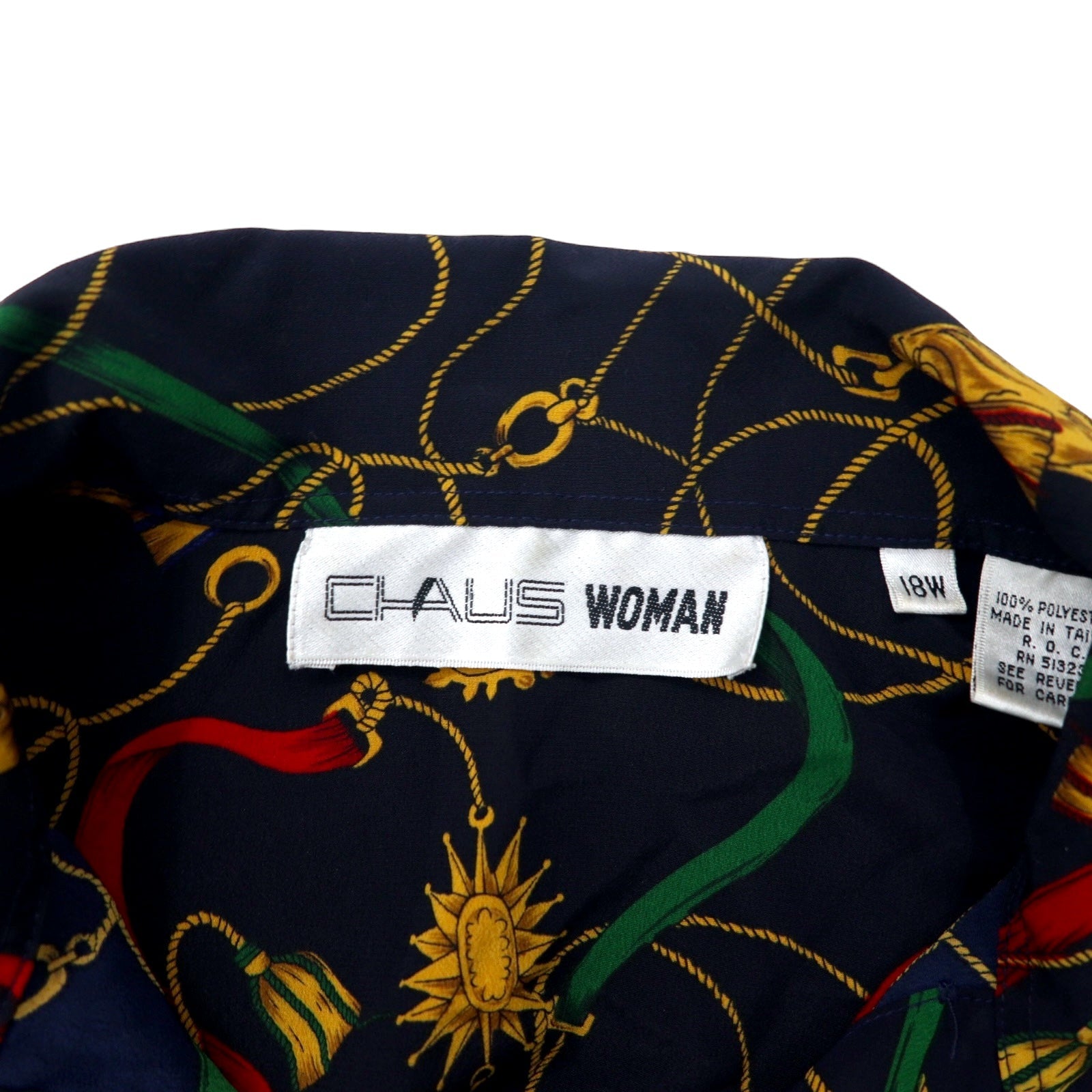 80年代 CHAUS WOMAN レトロ オープンカラー シャツ ブラウス 18W ネイビー ポリエステル 総柄