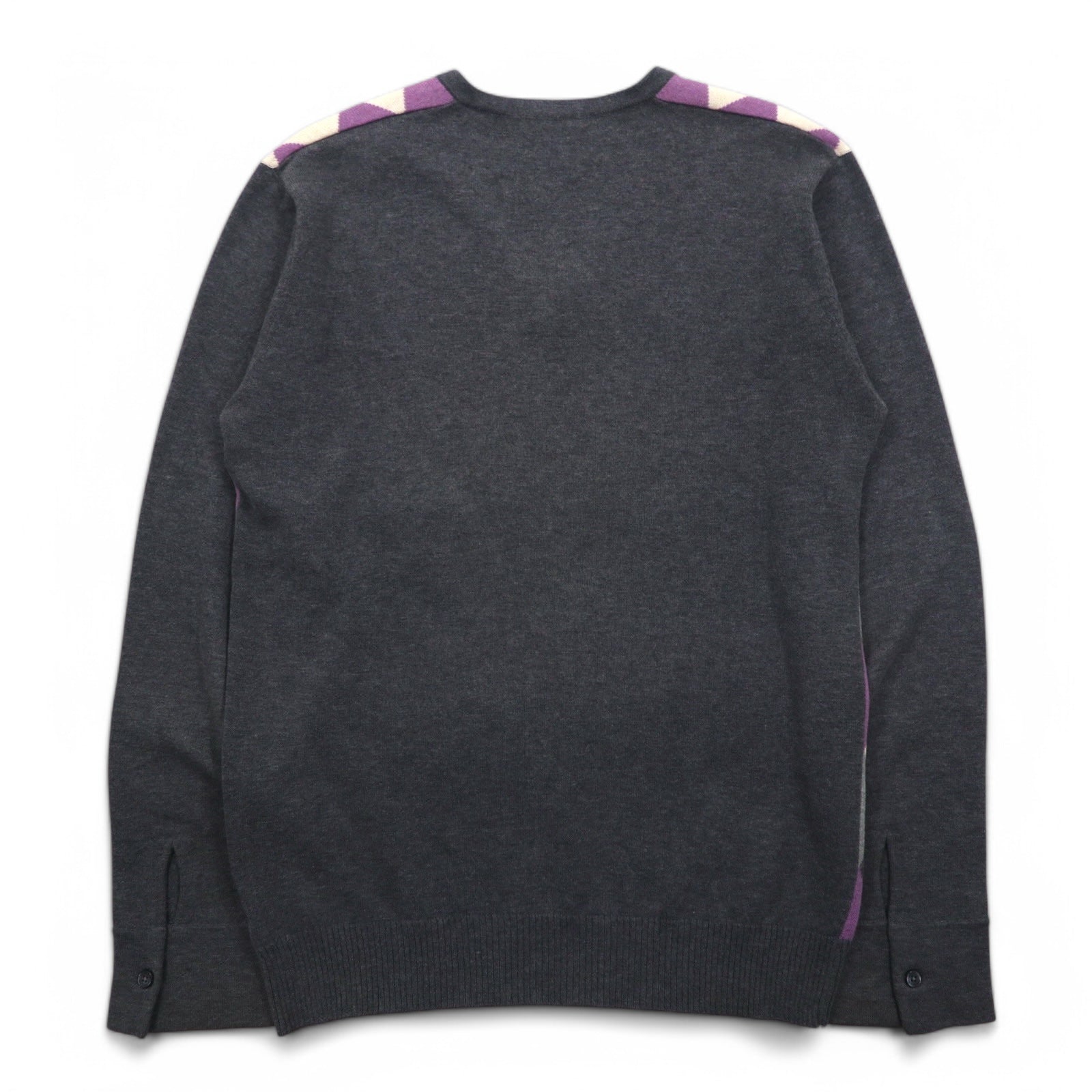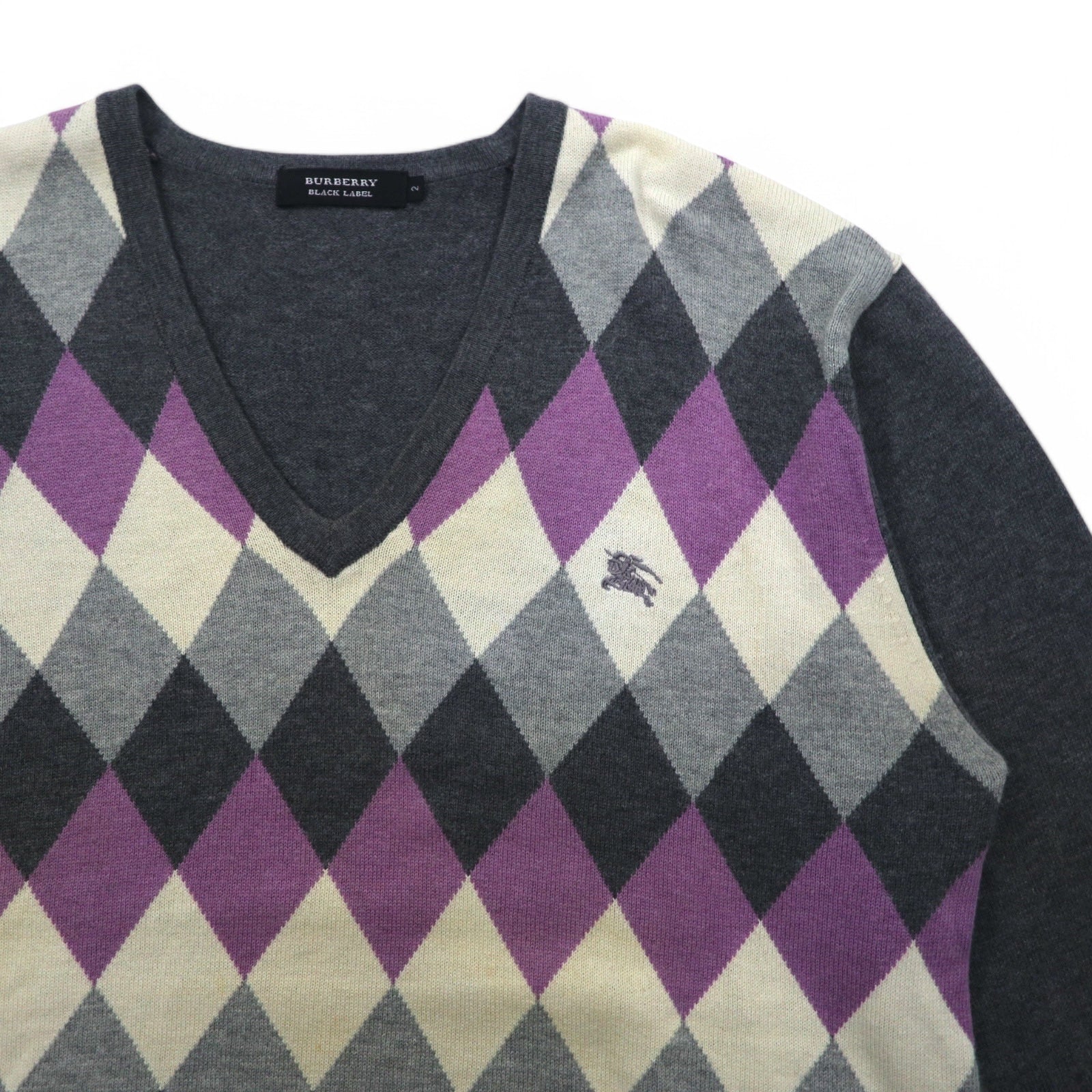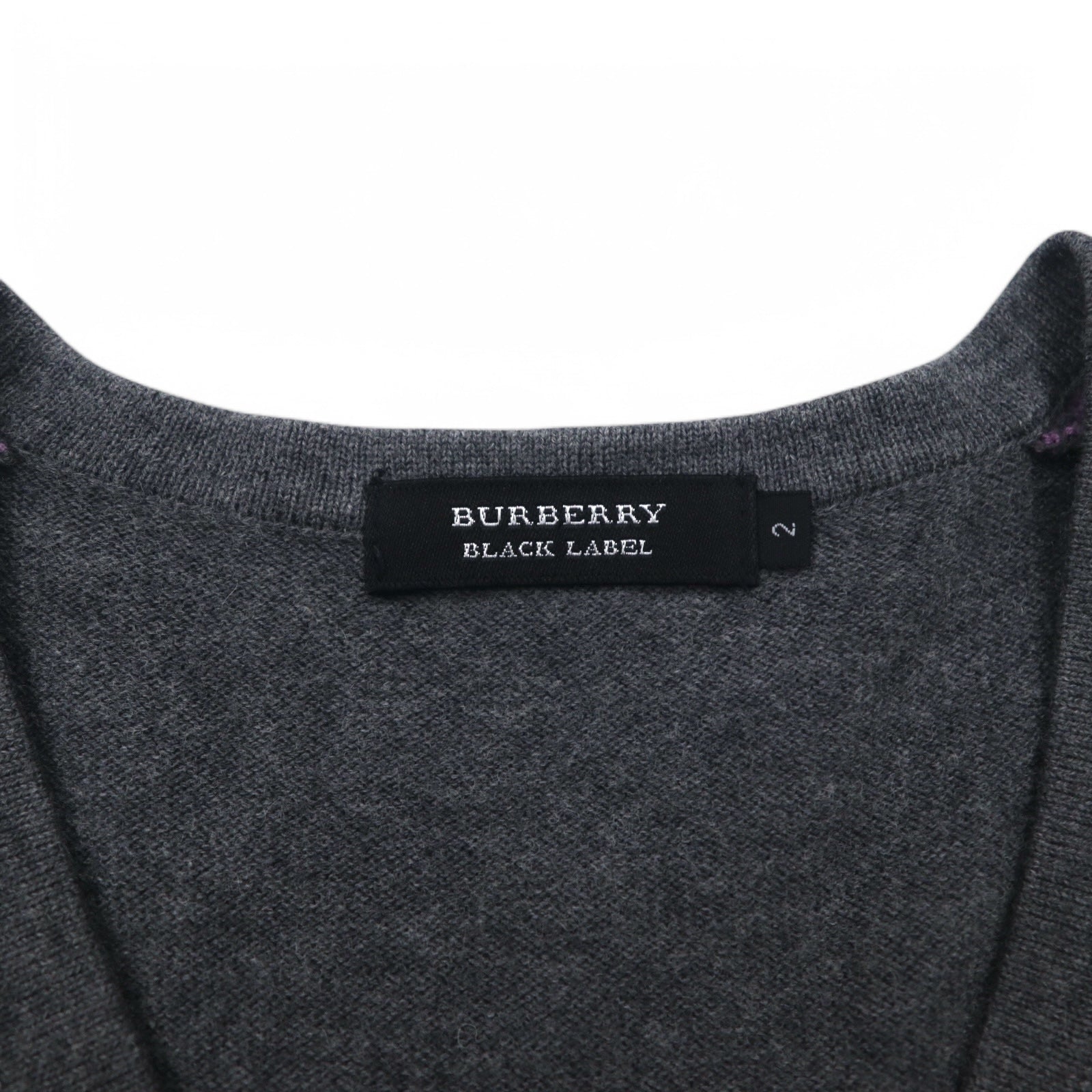 BURBERRY BLACK LABEL Vネック アーガイル ニット セーター M グレー 羊毛 ロゴ刺繍
