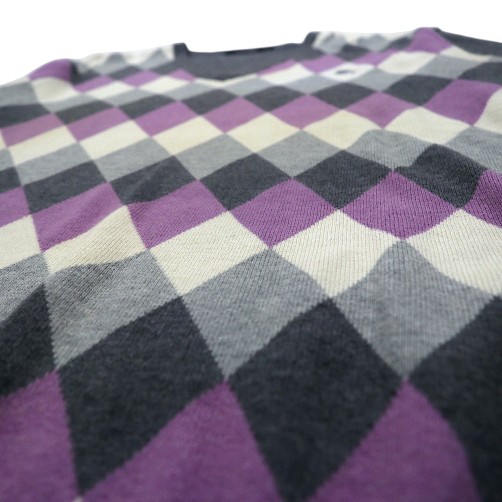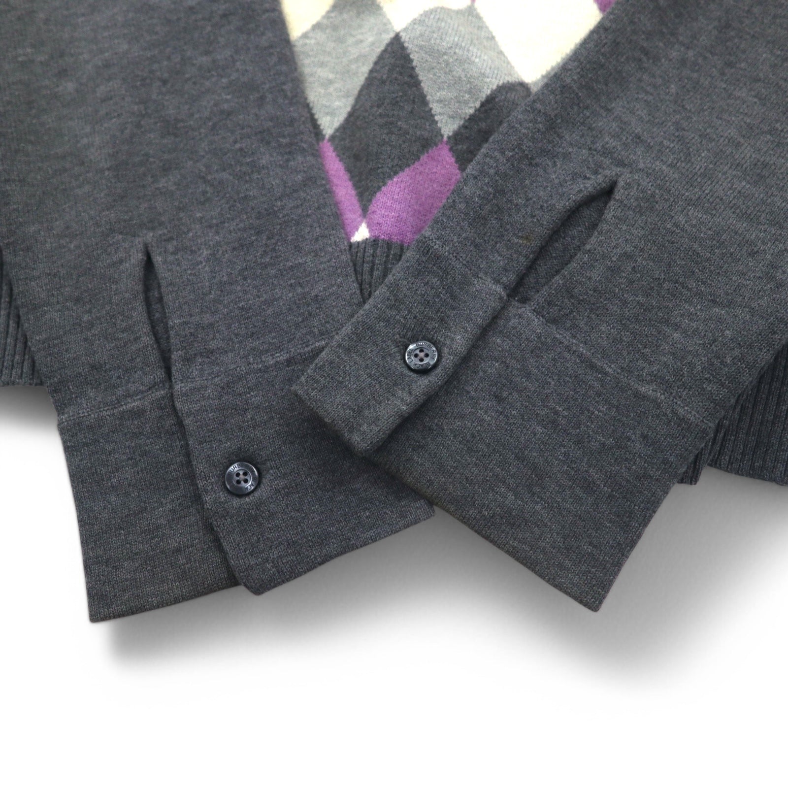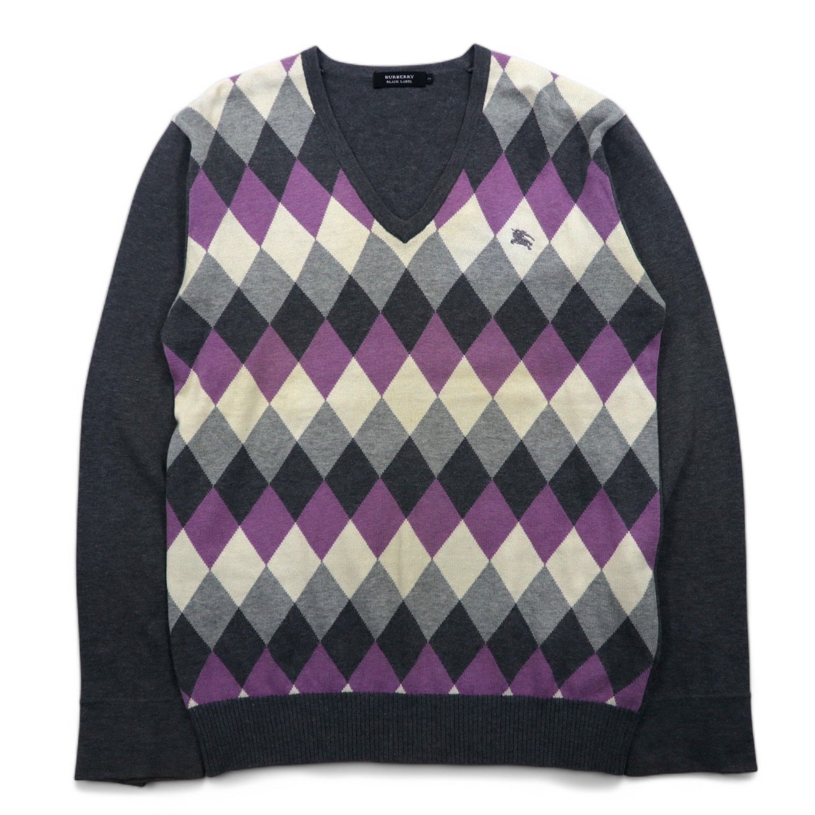 BURBERRY BLACK LABEL Vネック アーガイル ニット セーター M グレー 羊毛 ロゴ刺繍
