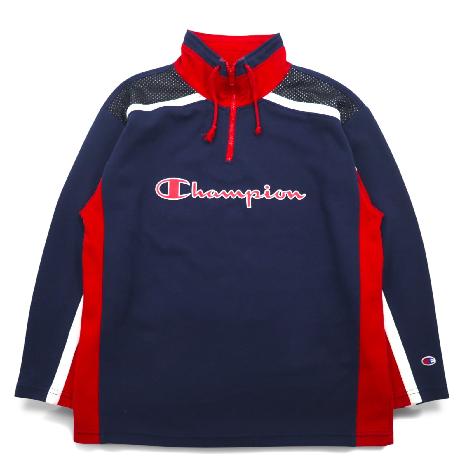 Champion 90年代 ハーフジップ スウェット L ネイビー コットン スクリプトロゴ プリント