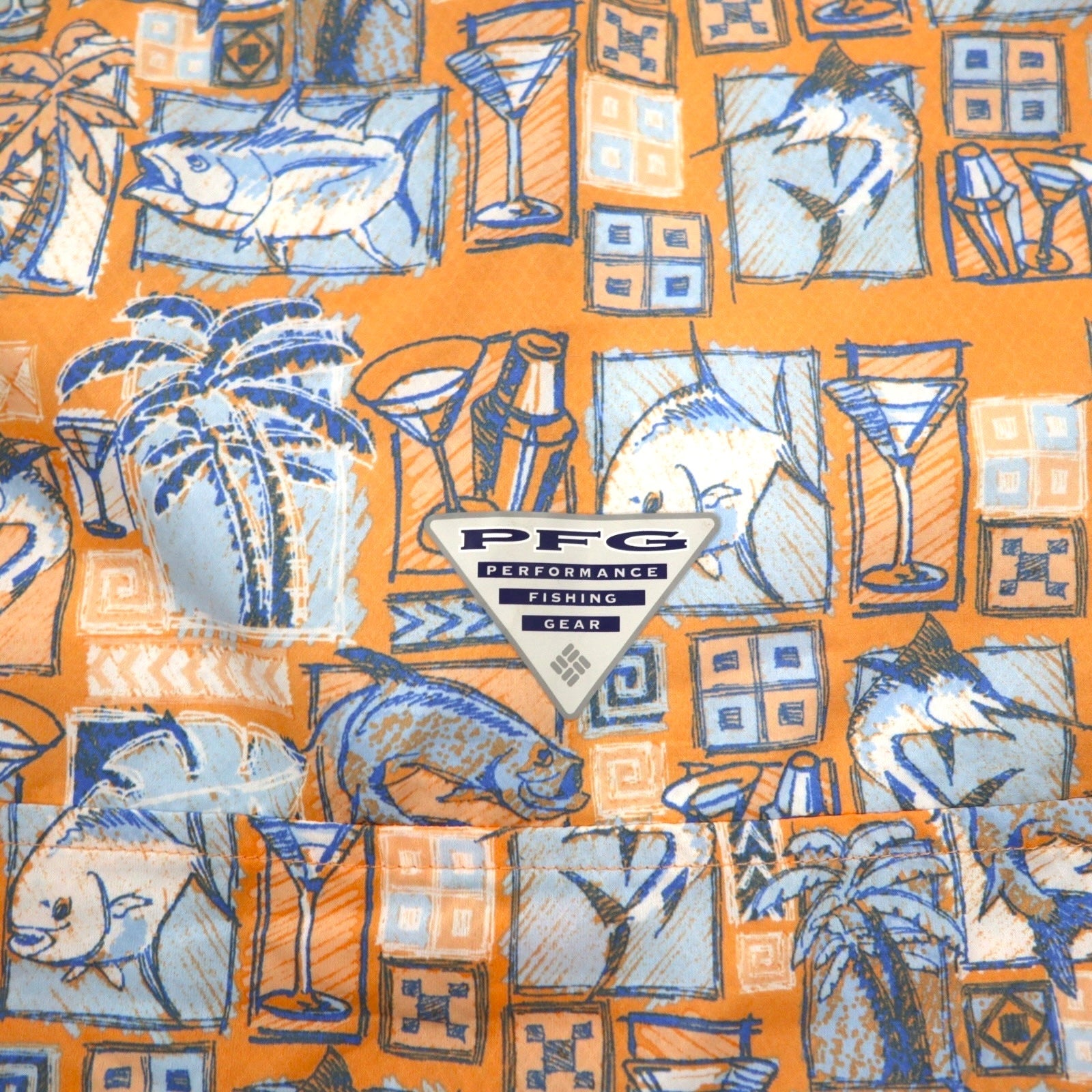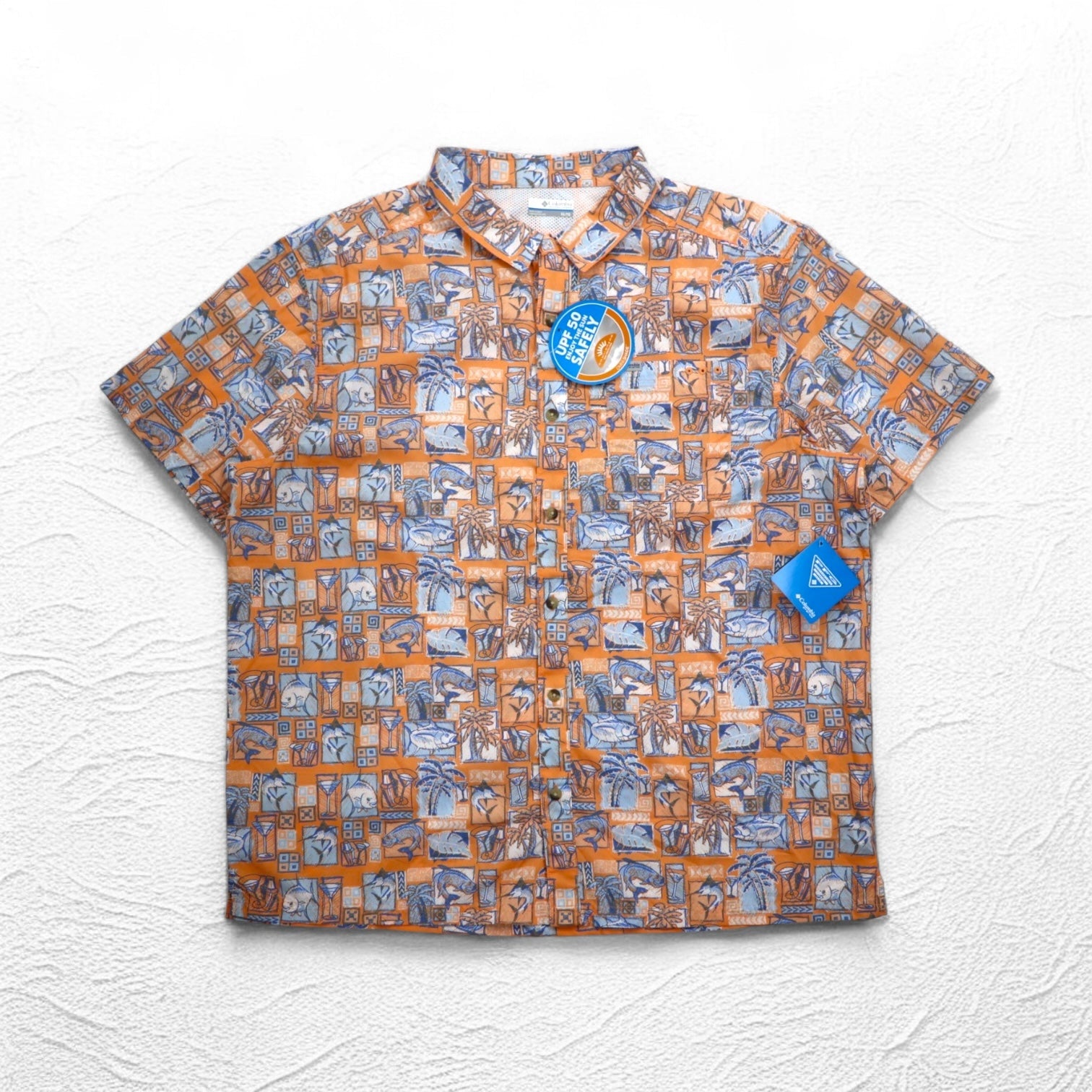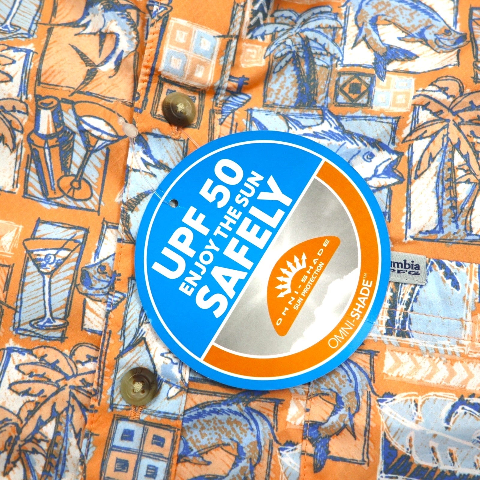 Columbia PFG UVカット アロハシャツ 半袖 ボタンダウンシャツ XL オレンジ 総柄 OMNI-SHADE メッシュライナー 未使用品