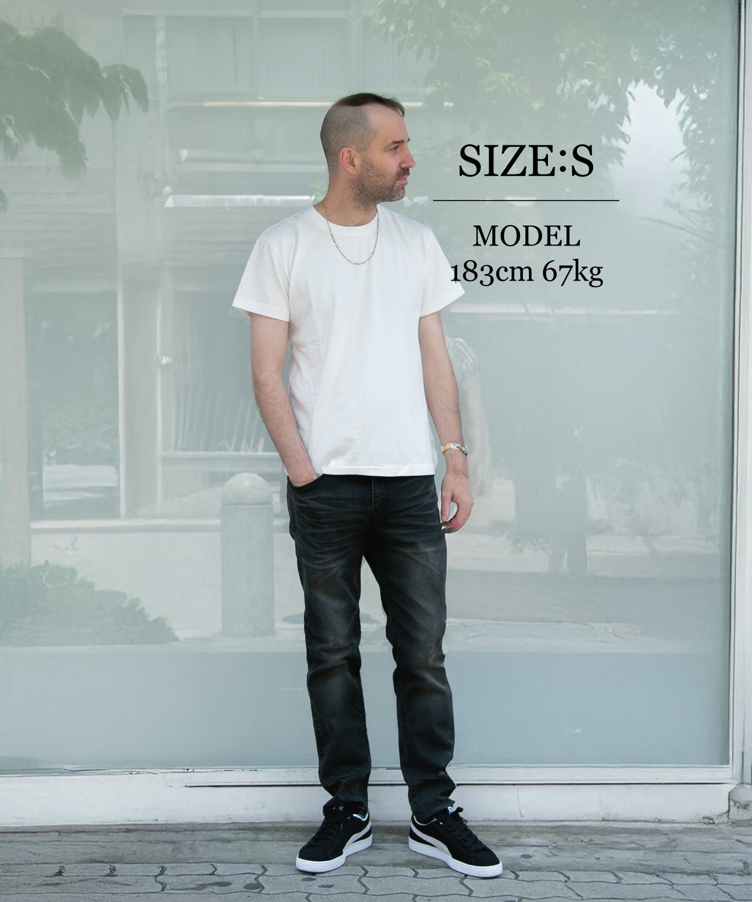 独自開発の10ozのドライな生地をオリジナルで作成し、少しルーズに着れるシルエットにしました。肌はなれがよくしっかりした生地感ですが、非常に着心地が良いです。