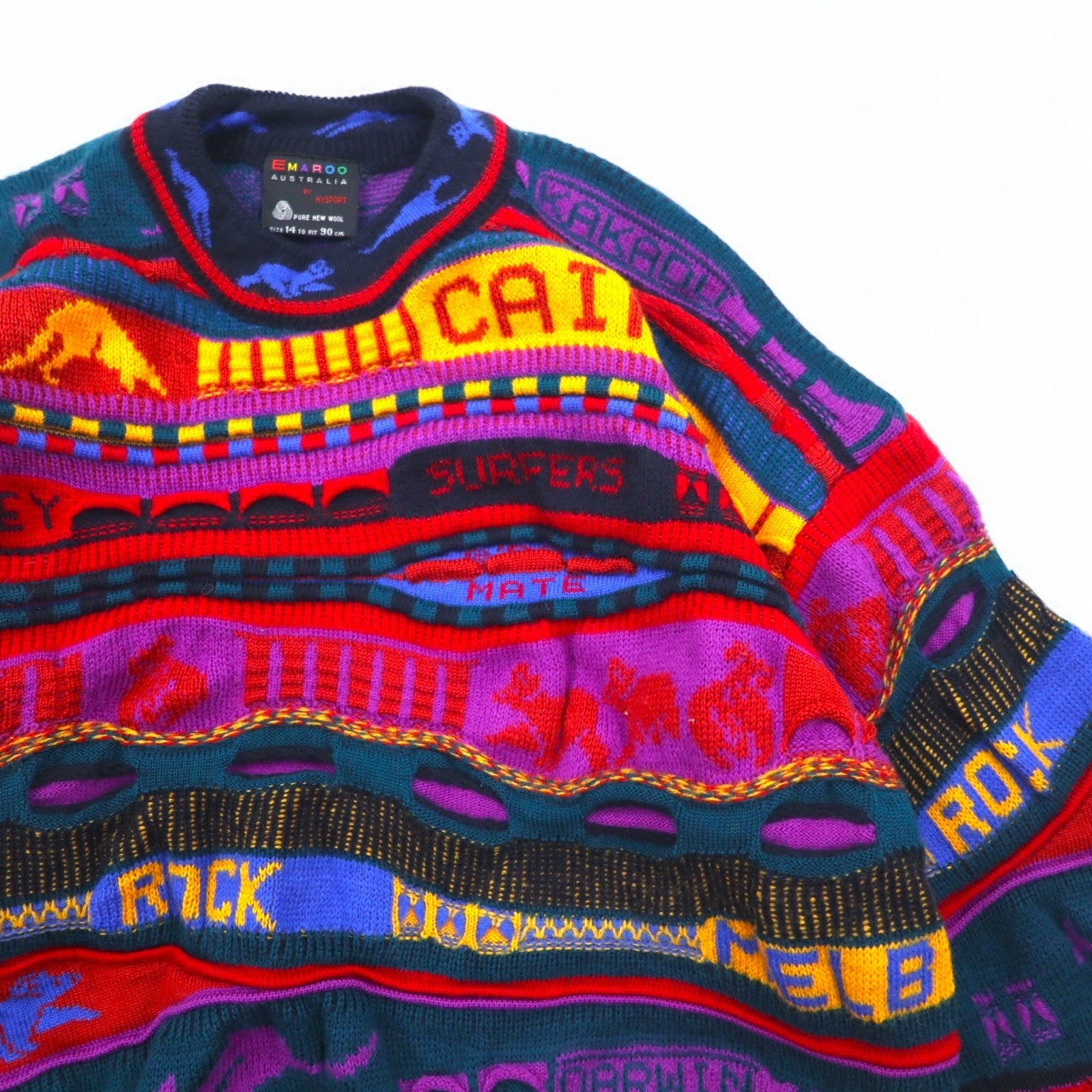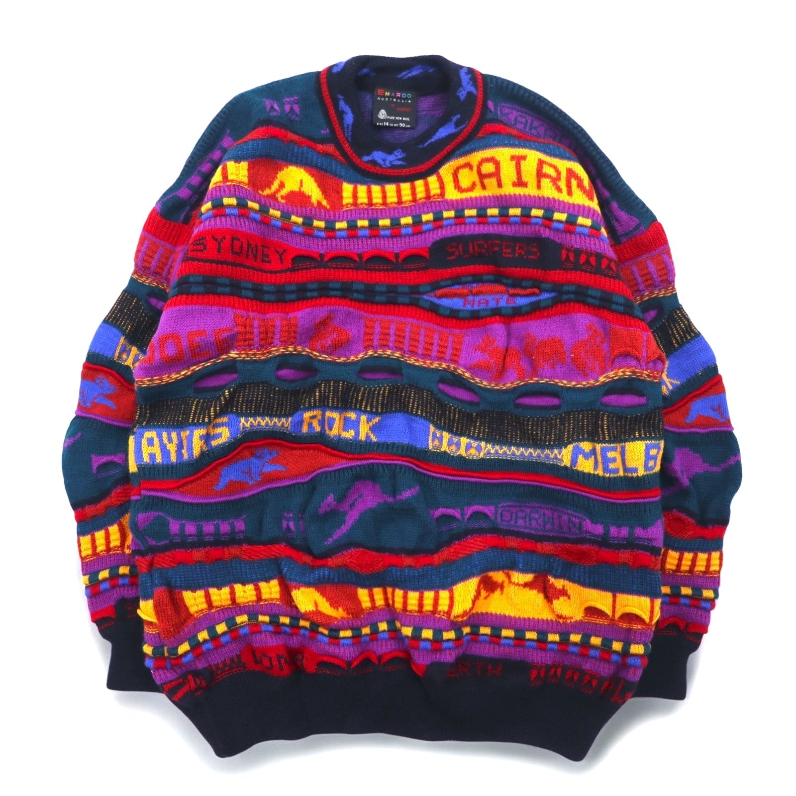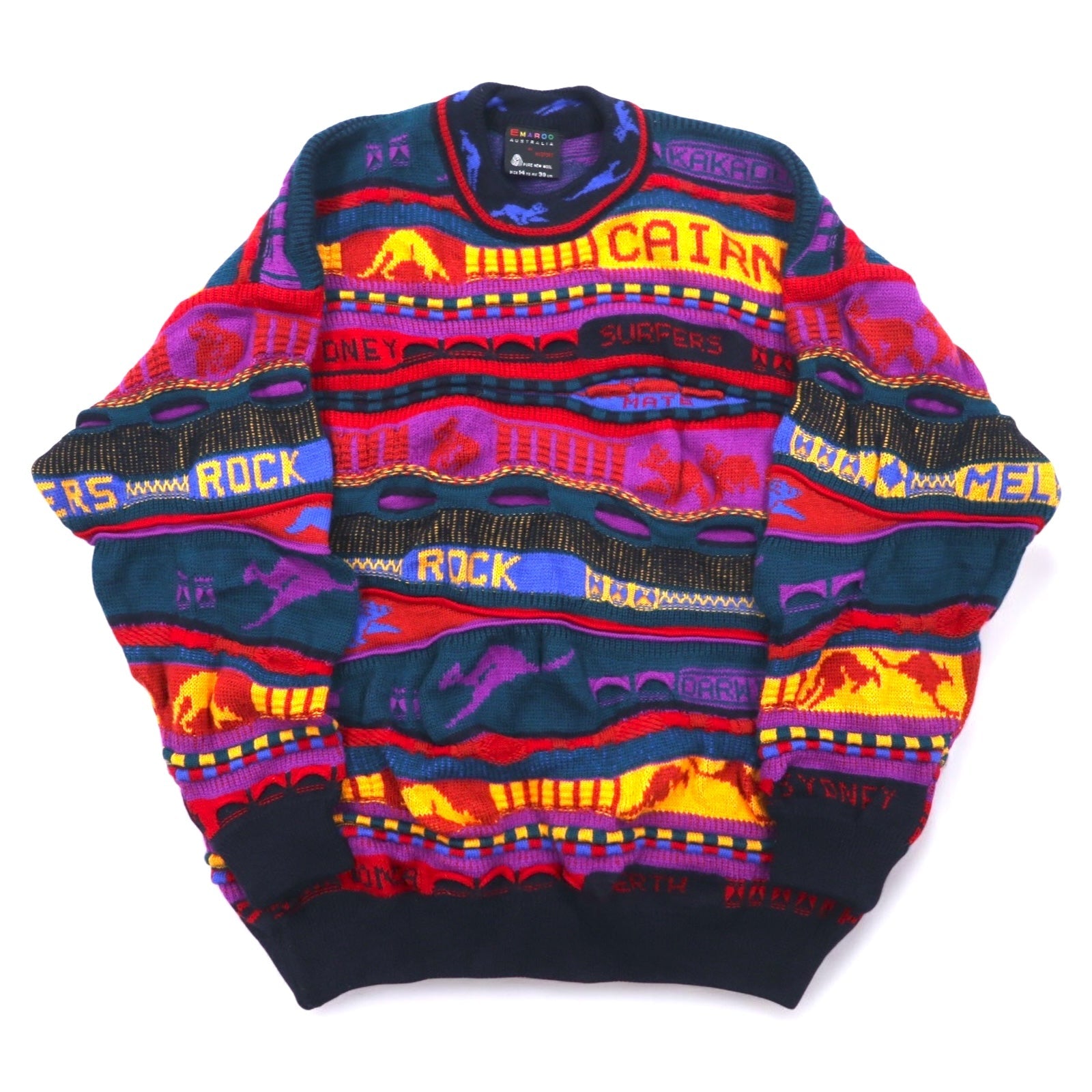 EMAROO AUSTRALIA 90年代 オーストラリア製 3D ニット セーター S マルチカラー ウール 総柄 HYSPORT