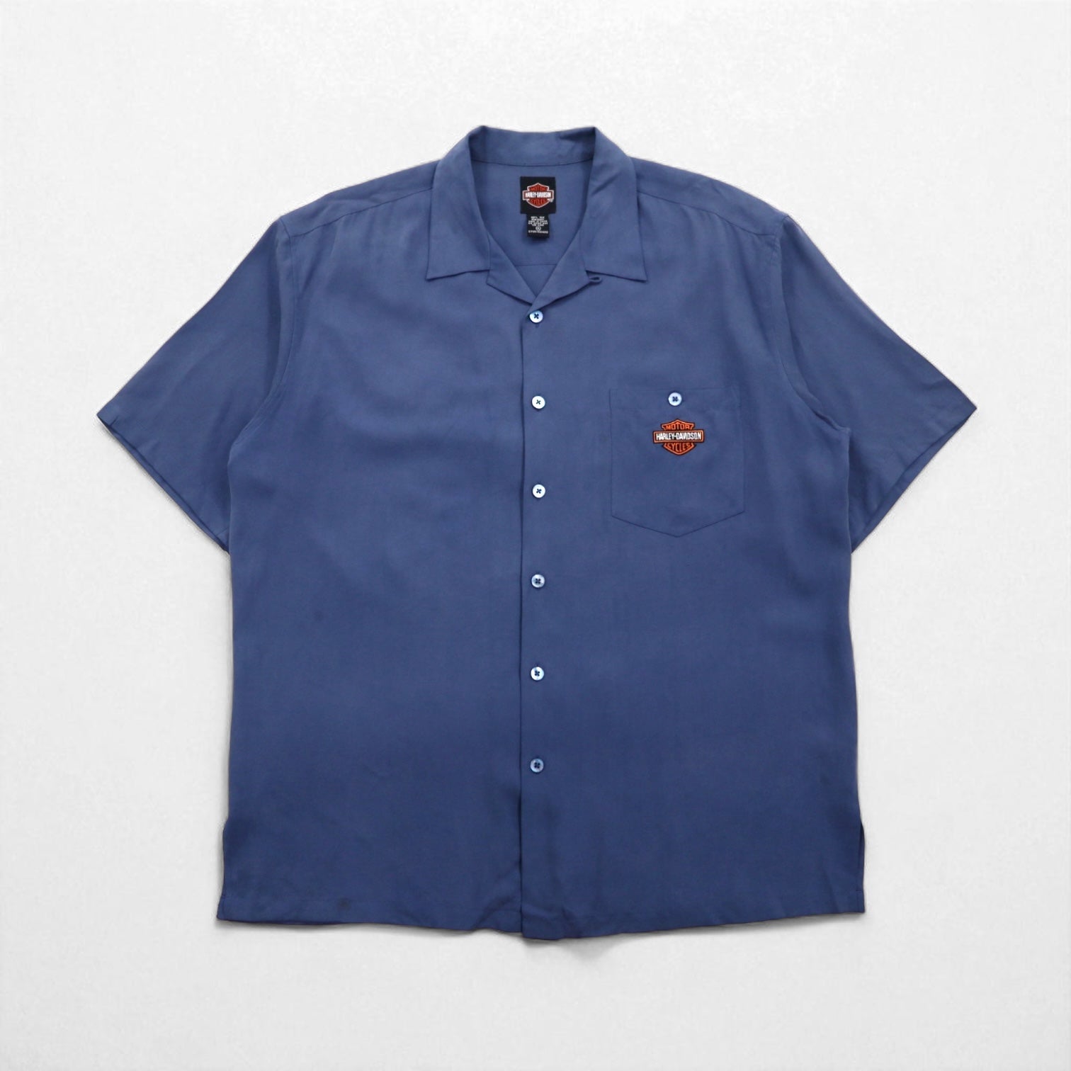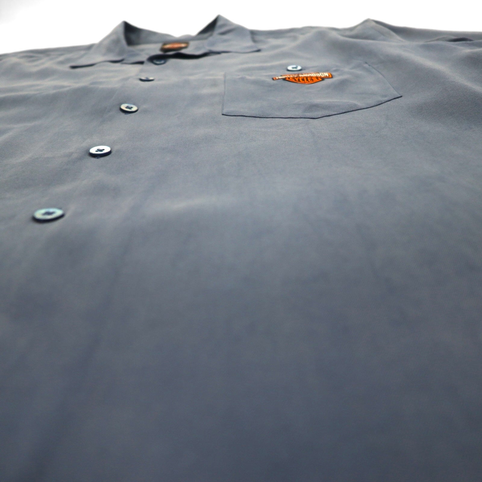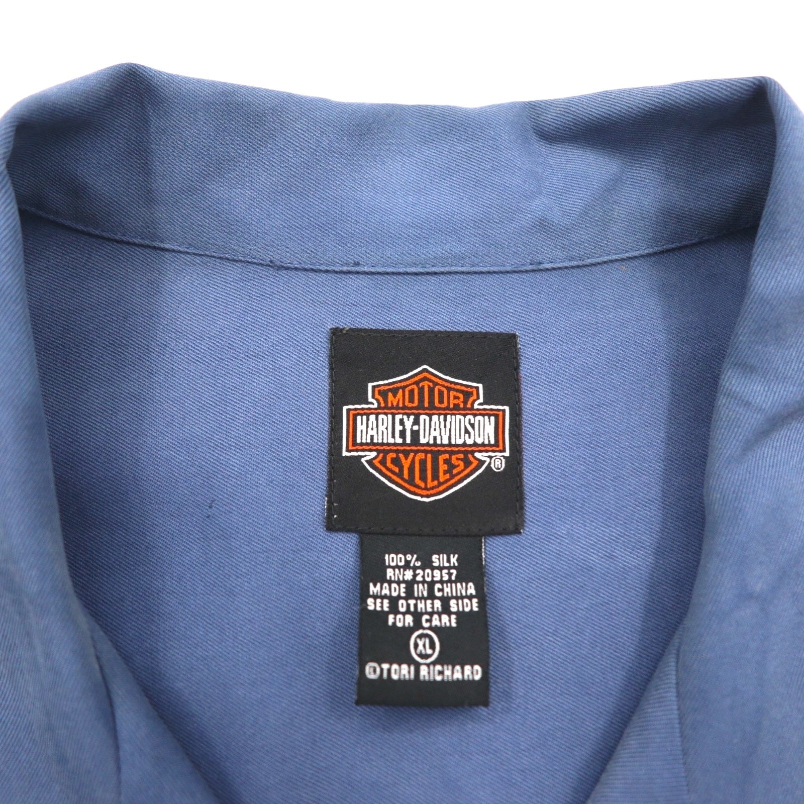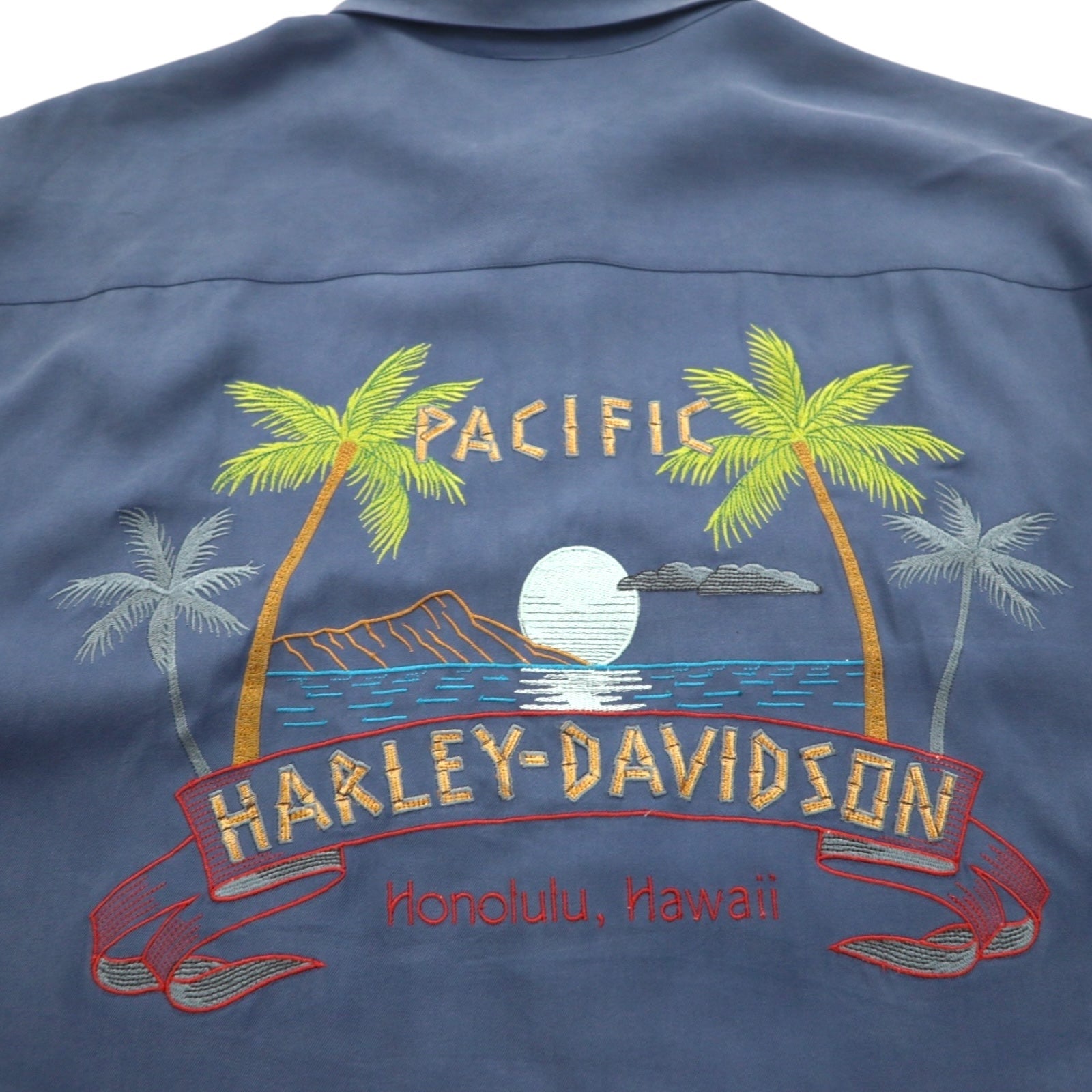 HARLEY DAVIDSON 開襟 シルク オープンカラー 半袖シャツ アロハシャツ XL ネイビー ハワイアン刺繍