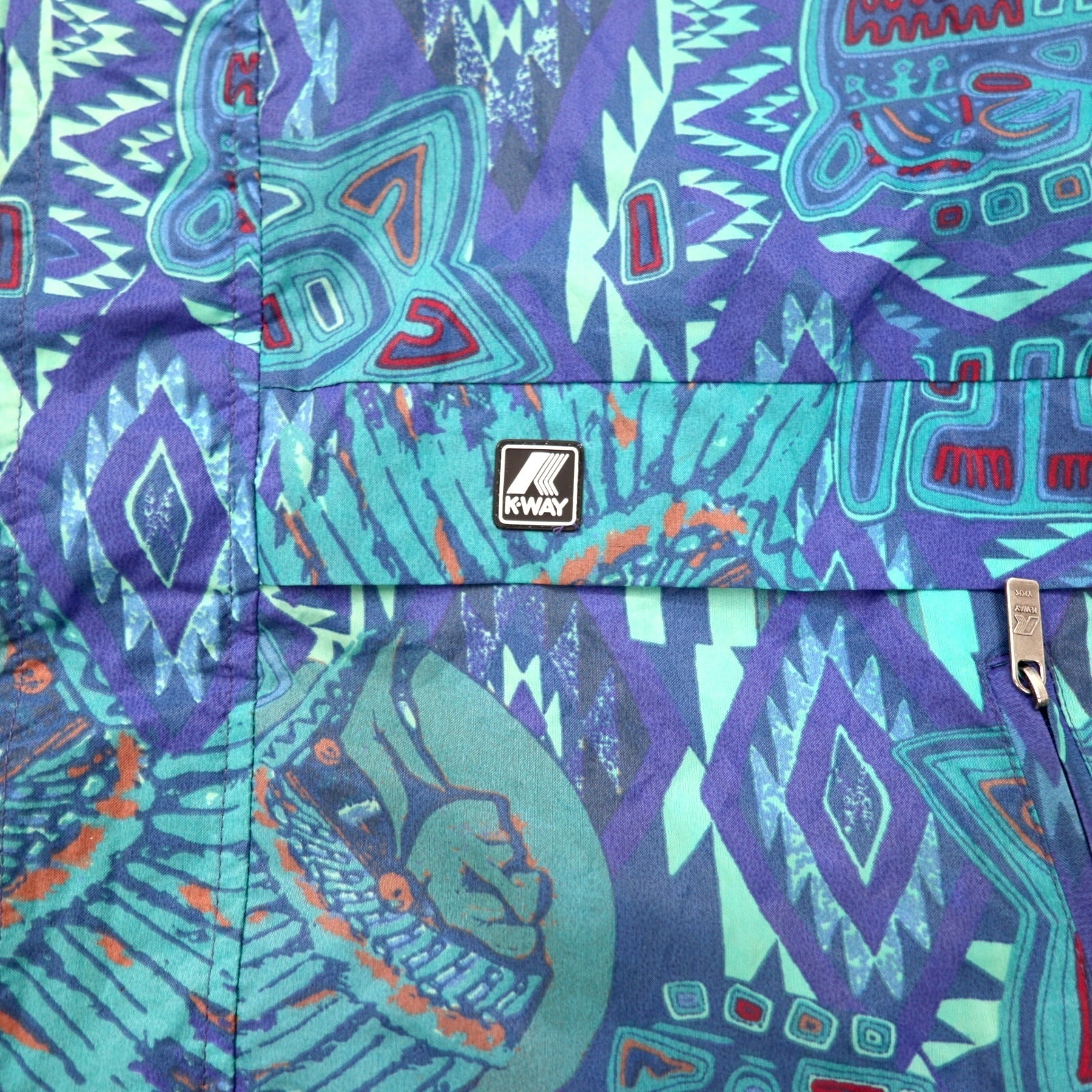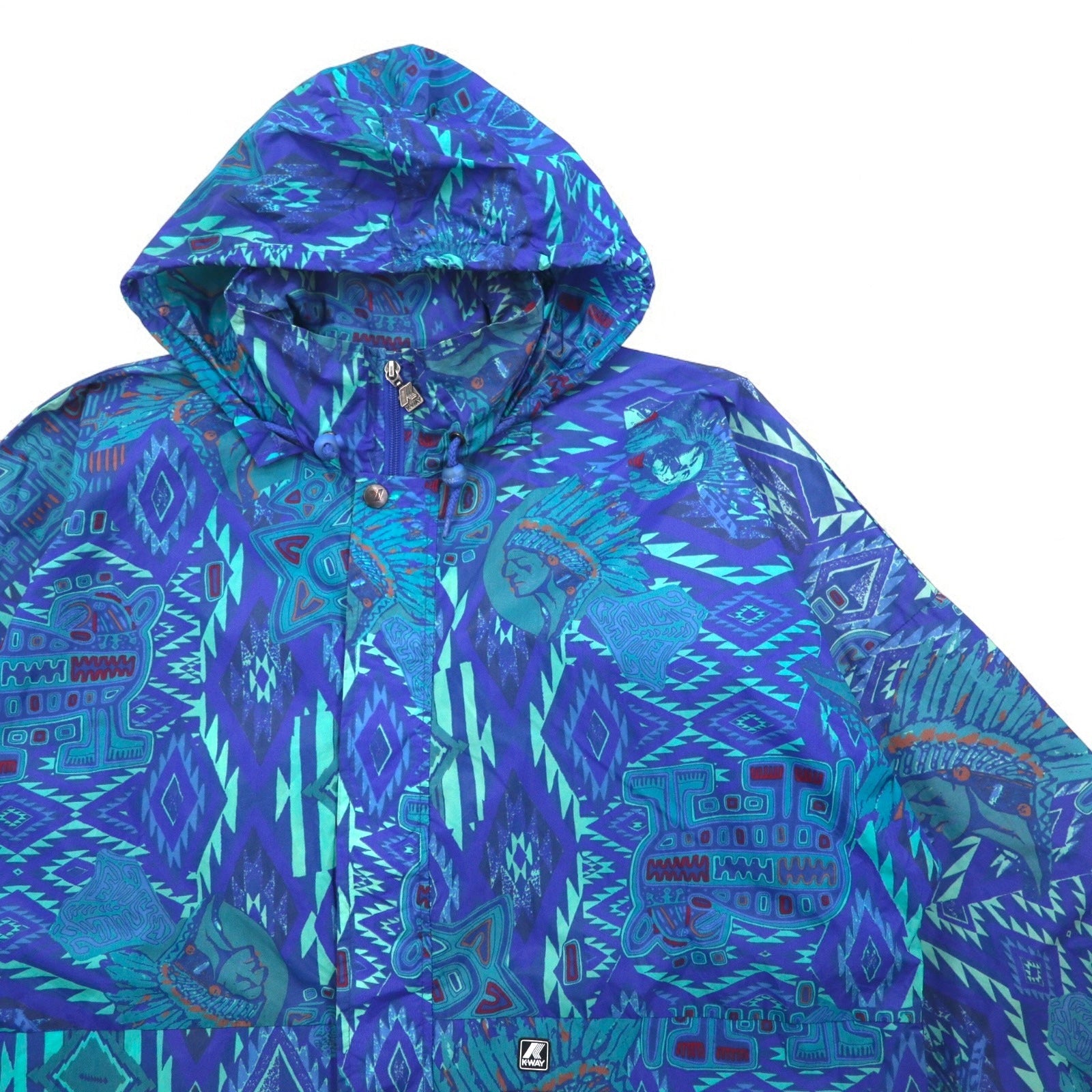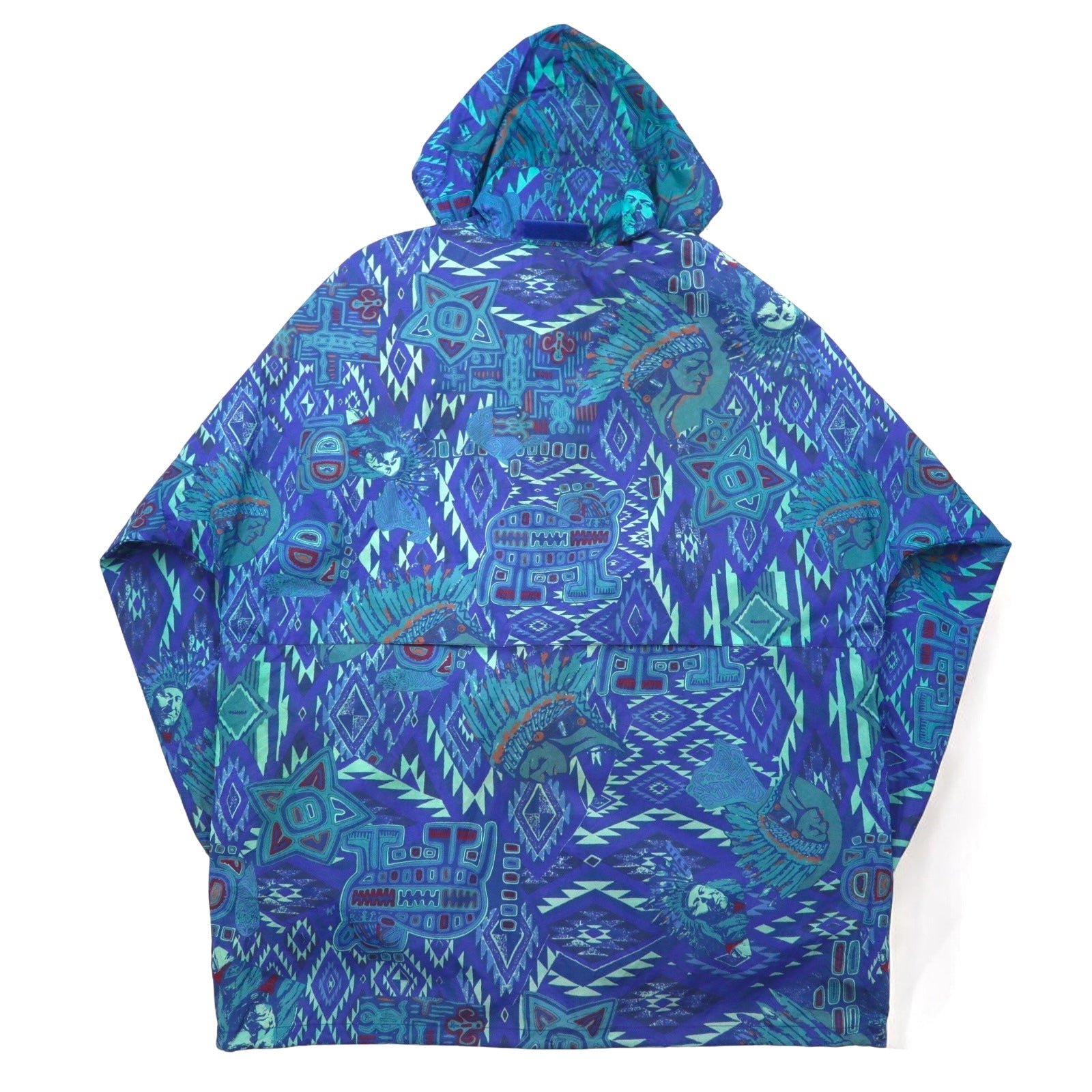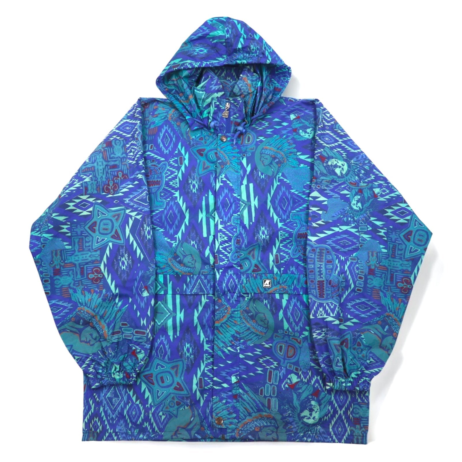 K-WAY 90年代 フード収納式 パッカブル ナイロンジャケット パーカー XL ブルー 総柄 ネイティブ柄 インディアン