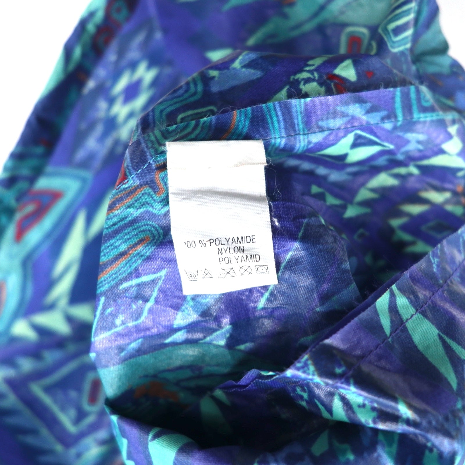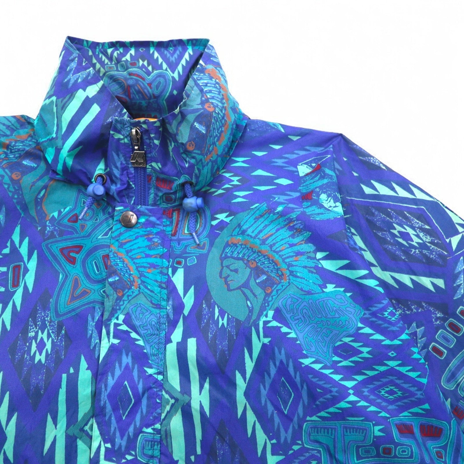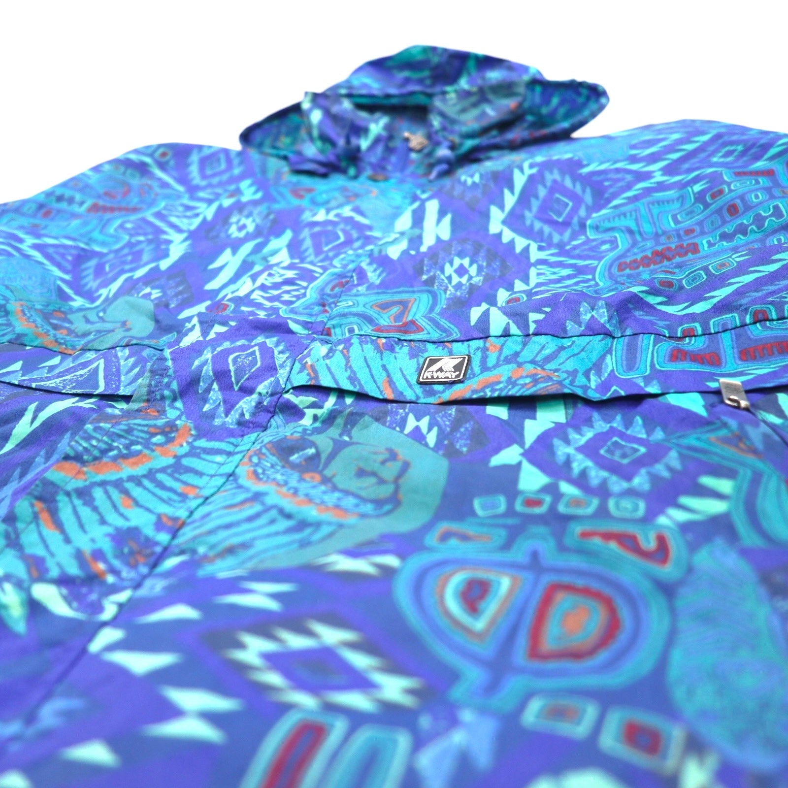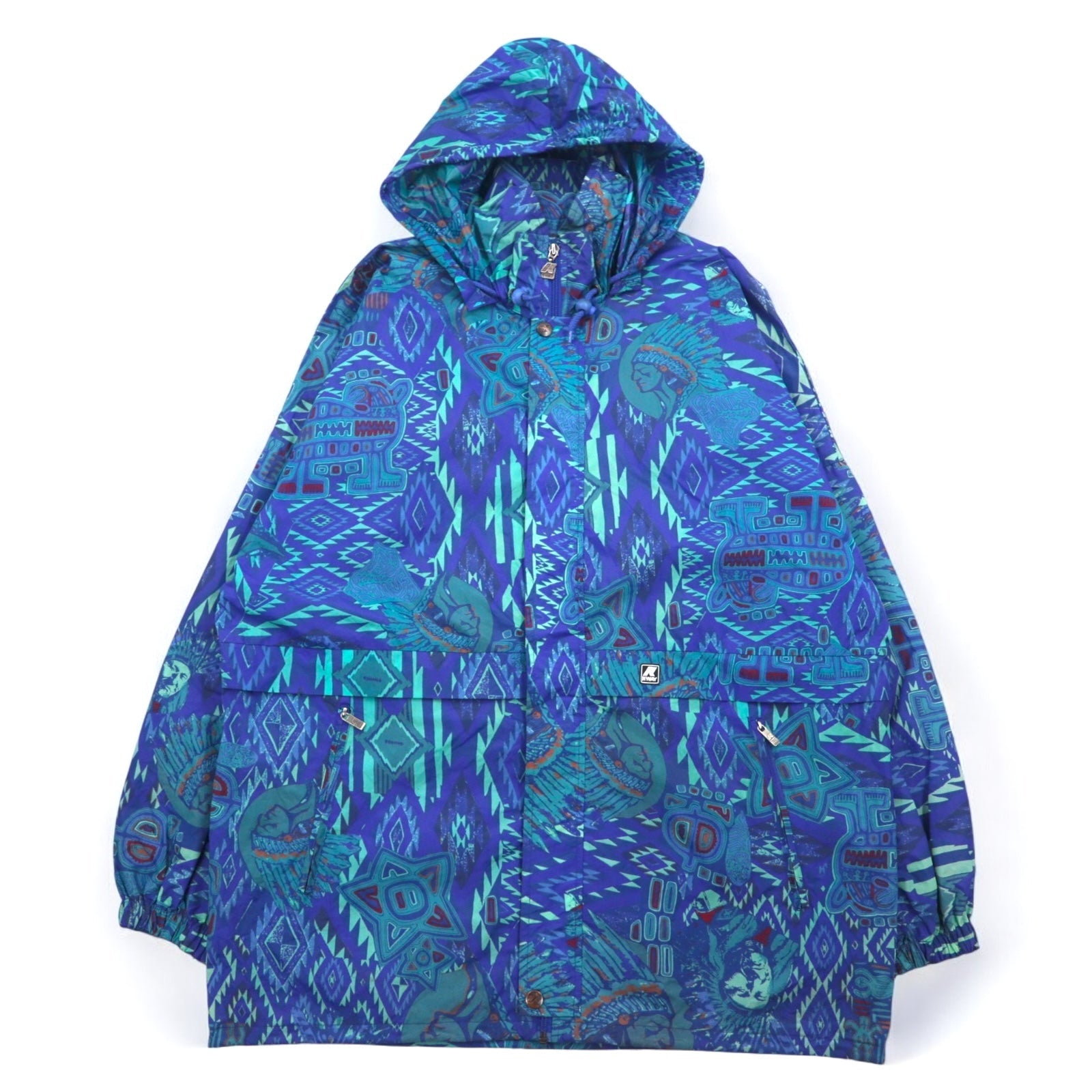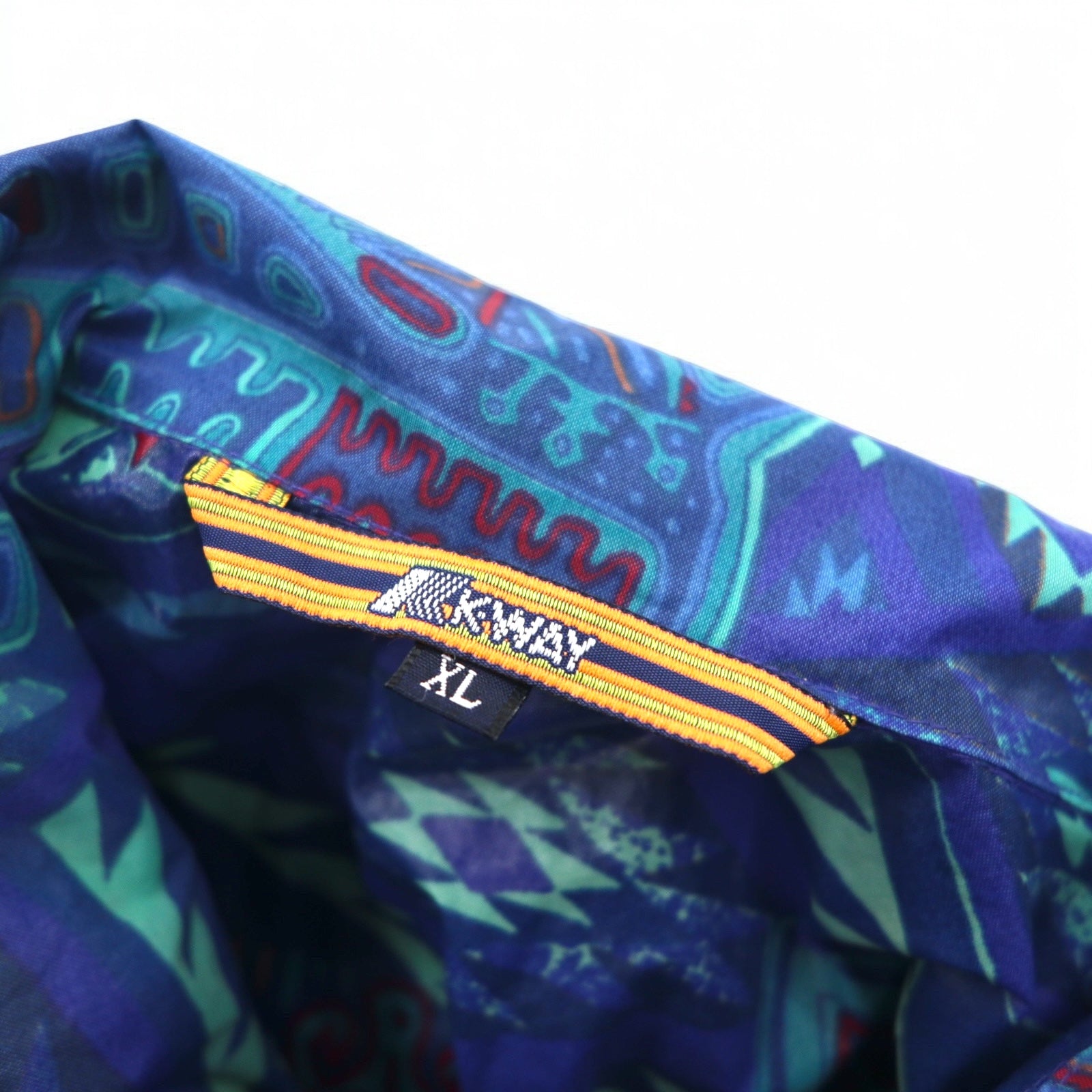 K-WAY 90年代 フード収納式 パッカブル ナイロンジャケット パーカー XL ブルー 総柄 ネイティブ柄 インディアン