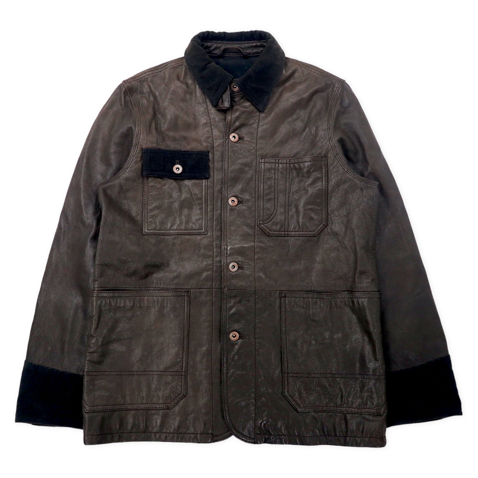 Leather Chore Coat レザーカバーオール M ブラック 山羊革 ゴート コーデュロイ切り替え 月桂樹ボタン