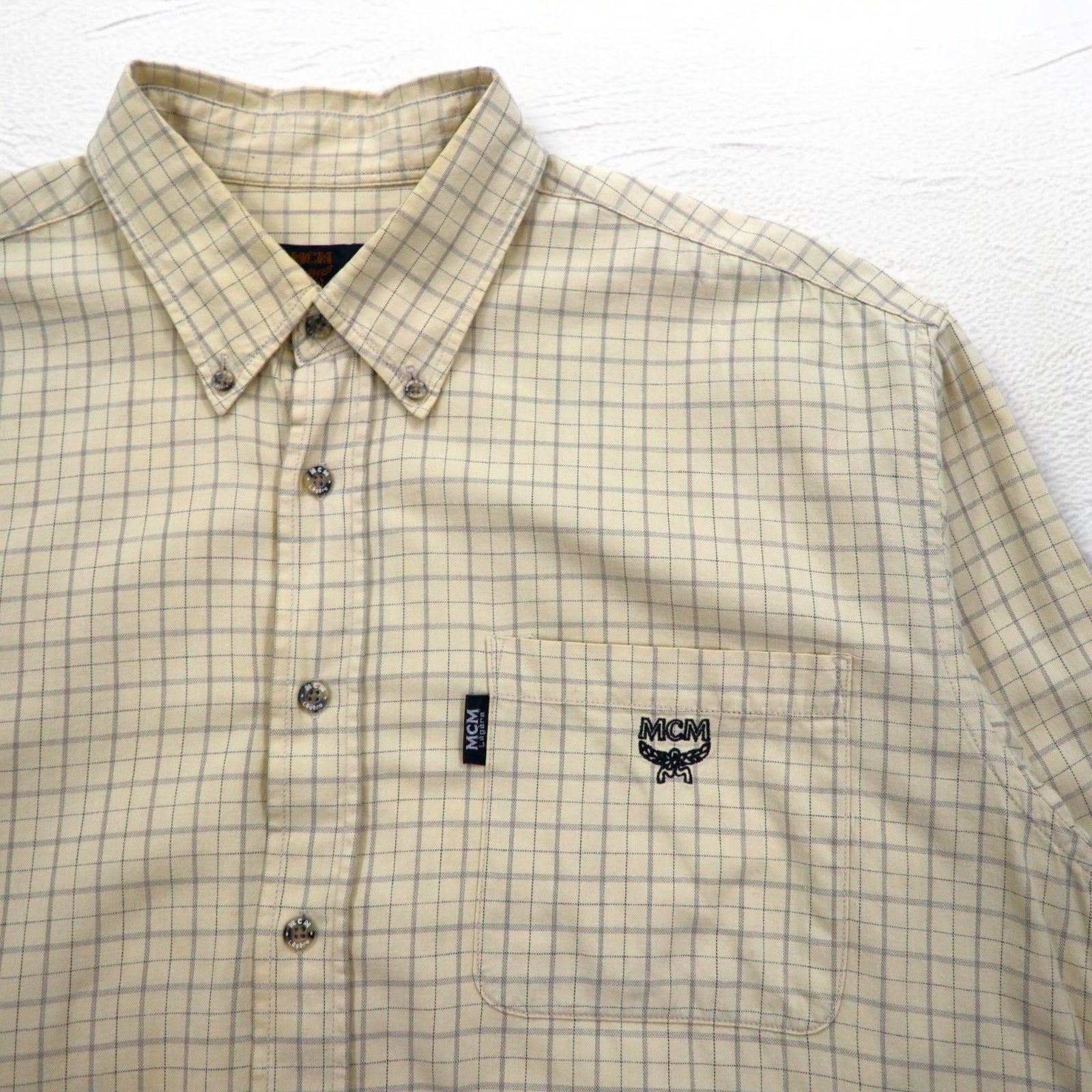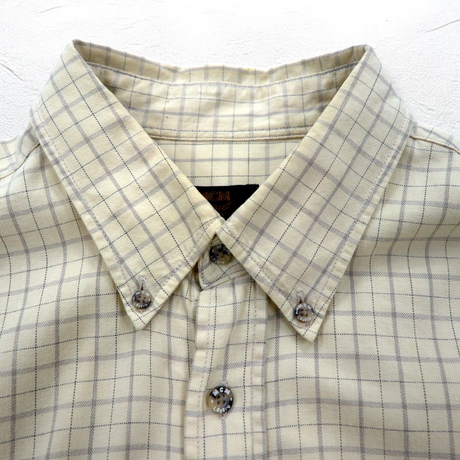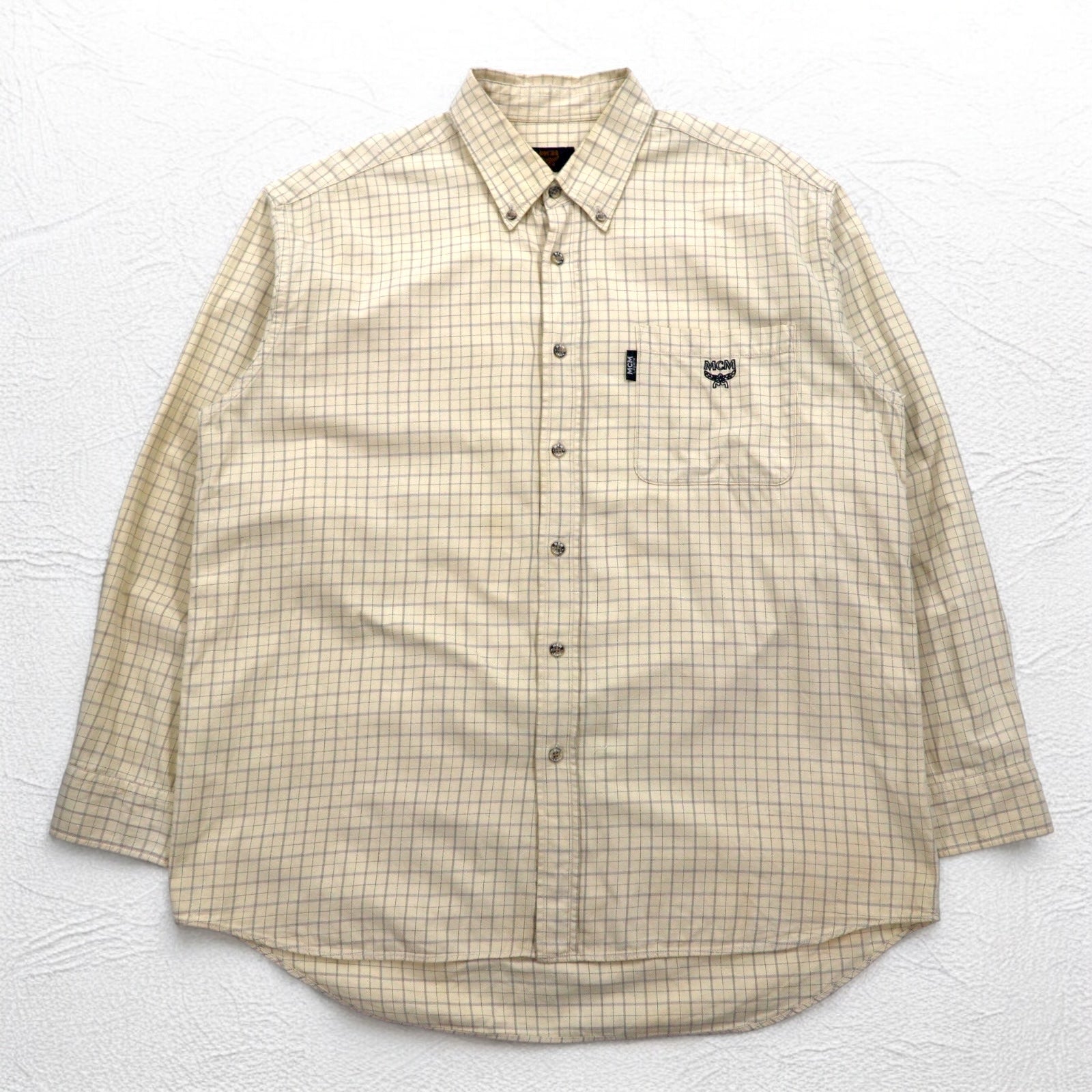 MCM ボタンダウンシャツ XL ベージュ チェック コットン 胸ポケット ワンポイントロゴ刺繍