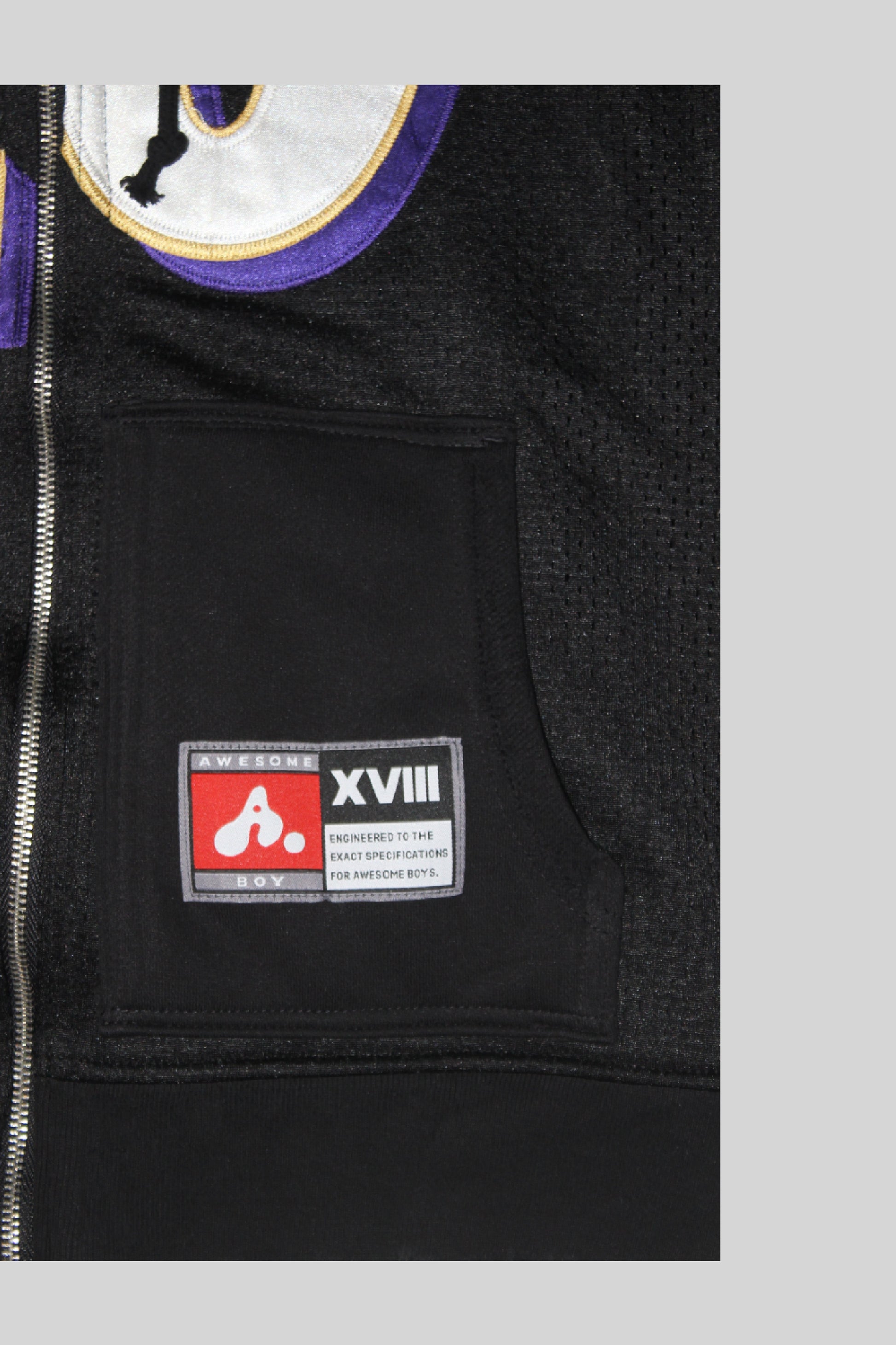 古着のアメフトジャージとパーカーをドッキングしたデザイン。