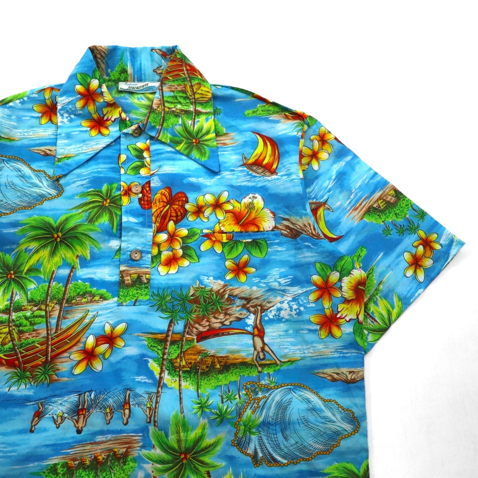 Pennys HAWAII 70年代 プルオーバー アロハシャツ L ブルー ポリエステル 襟芯 総柄 ビーチ