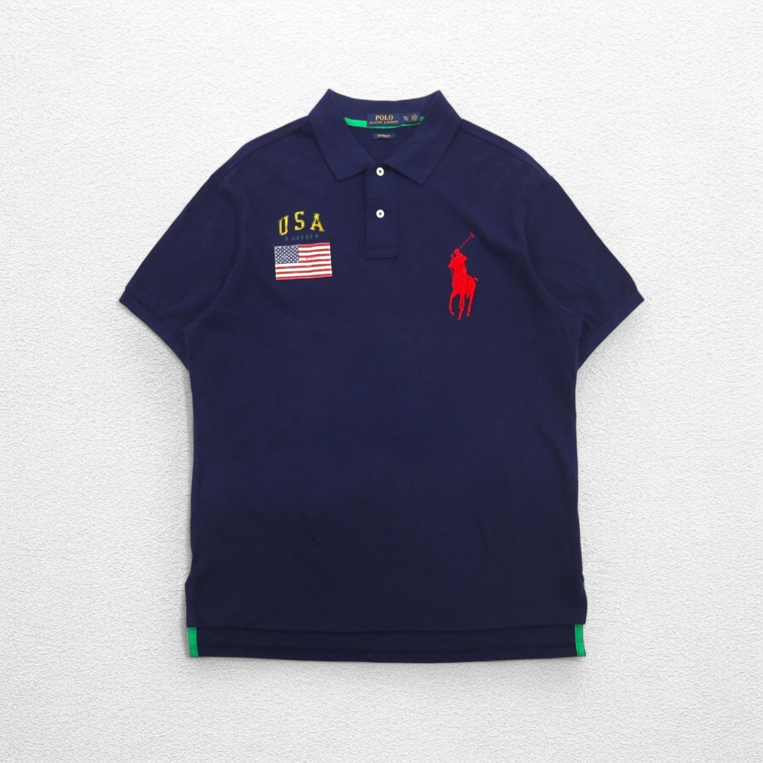 POLO RALPH LAUREN 鹿の子 ポロシャツ XL ネイビー コットン 刺繍 ビッグポニー USA 星条旗