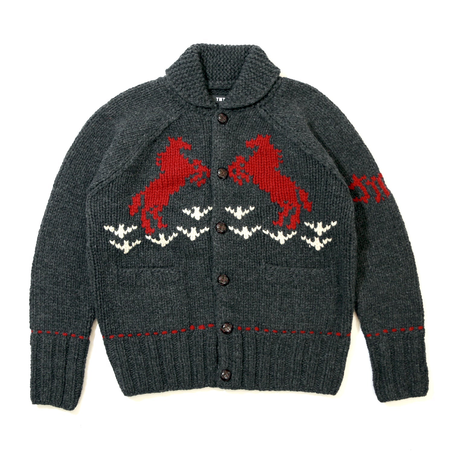 職人の手によって編み上げられた、ウール100%のローゲージニット。5mm幅の極太な毛糸を使用。カウボーイを取り入れた、レトロな雰囲気が魅力のアイテムです