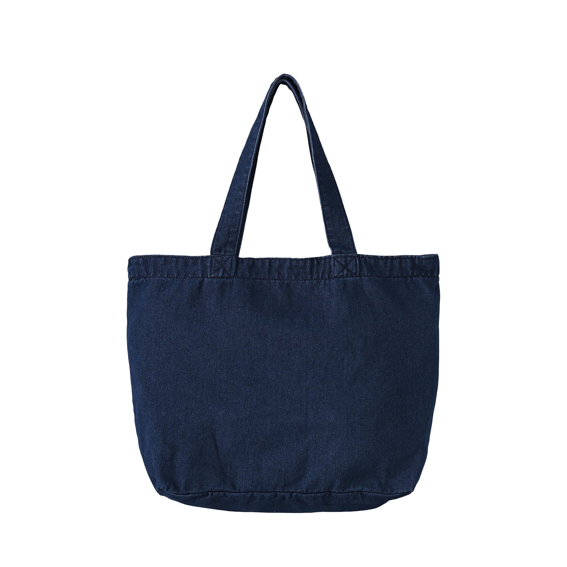 大容量サイズで何でも入るトートバッグ。 デニム生地なので使い込むほどに風合いが増すのも魅力。