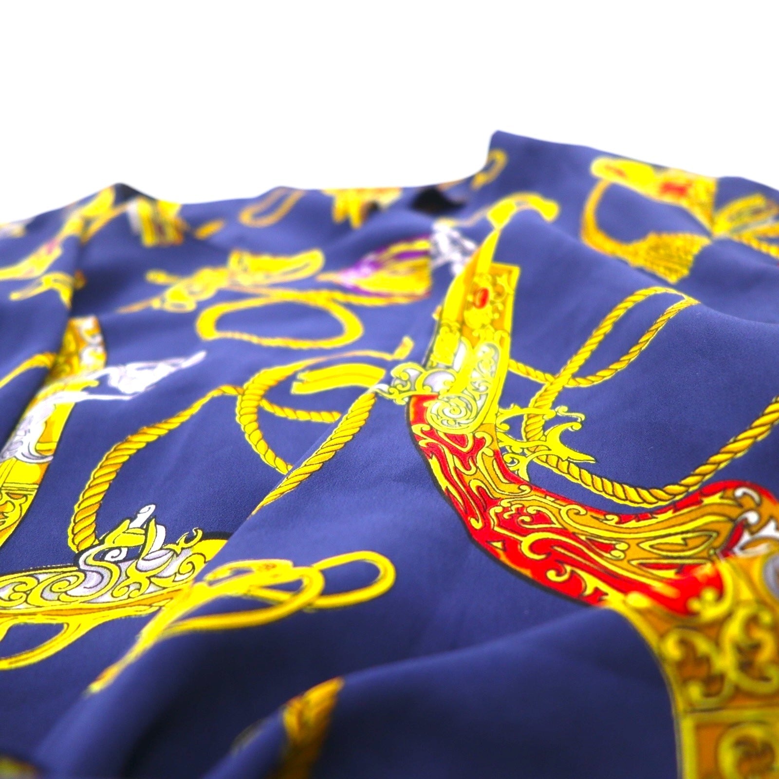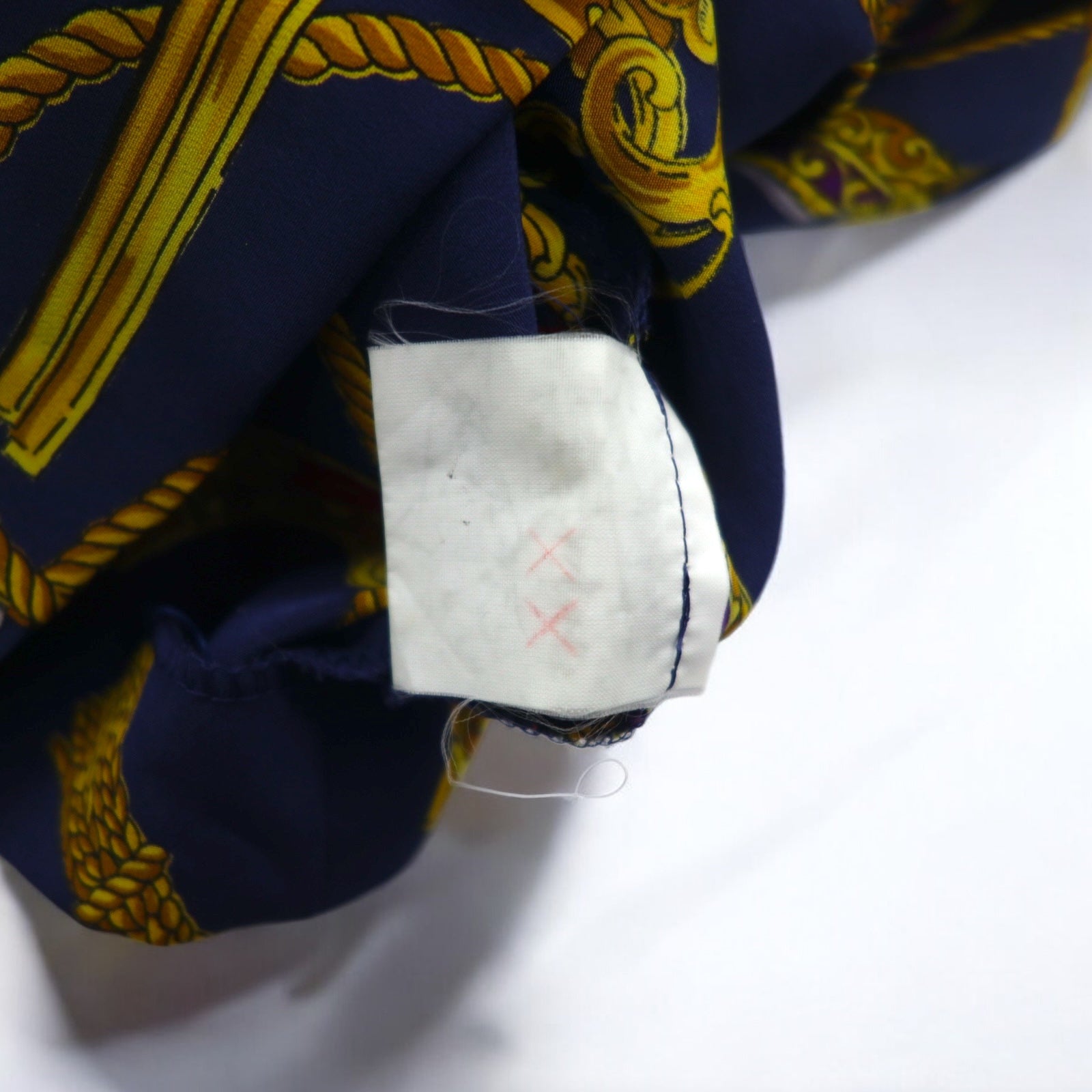 Vintage 90s Retro Blouse 前結び クロップド シャツ レトロ ブラウス M ネイビー バックボタン 金ボタン スカーフ 総柄 裾リボン結び