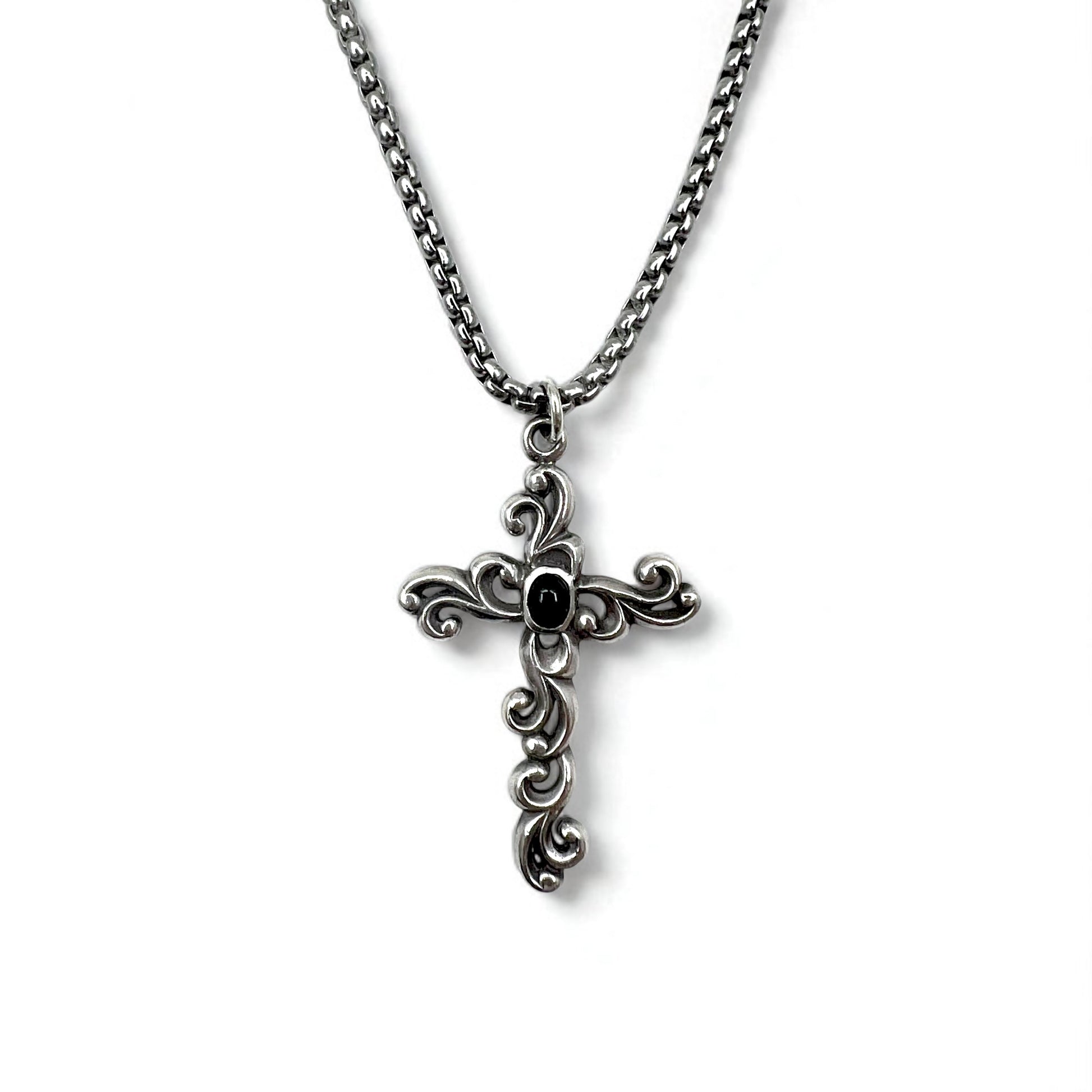 Vintage Silver Cross Necklace ヴィンテージ 浮き唐草彫り クロス 十字架 ネックレス ブラックオニキス シルバー 925